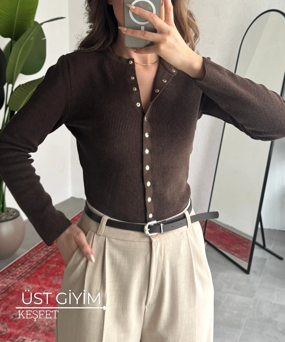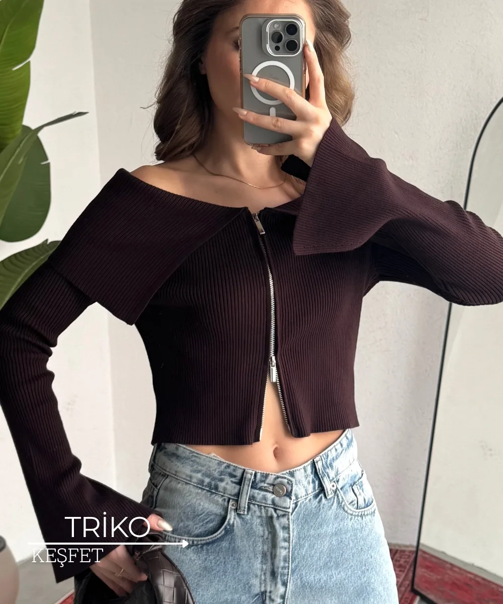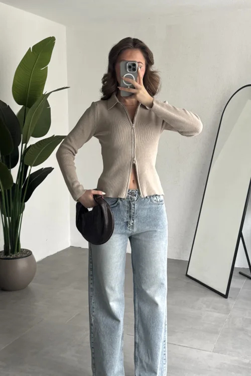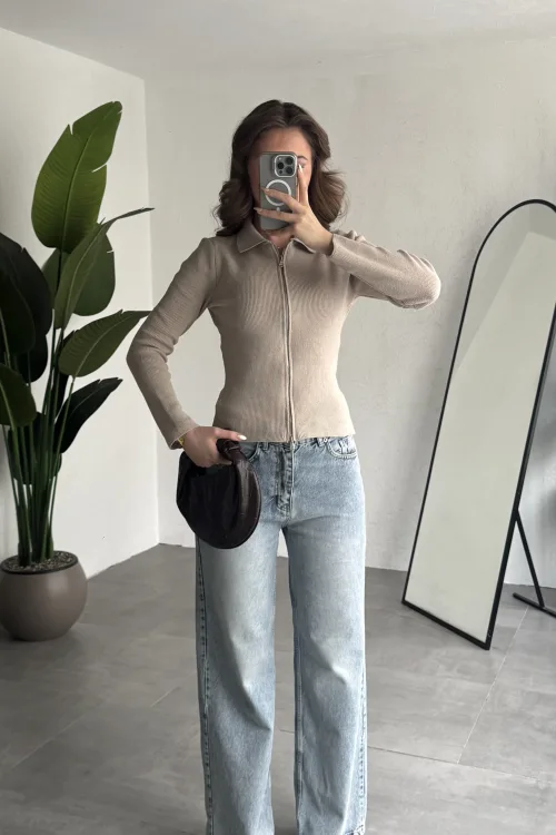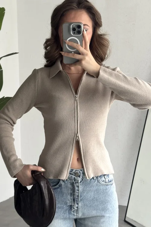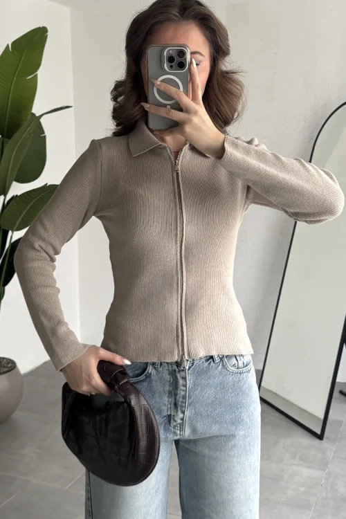 Kadın Krem Fitilli Triko Hırka Fermuarlı Polo Yaka Basic Uzun Kollu