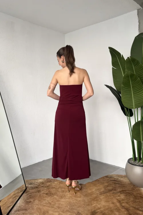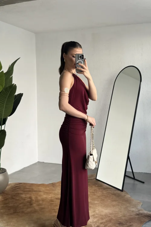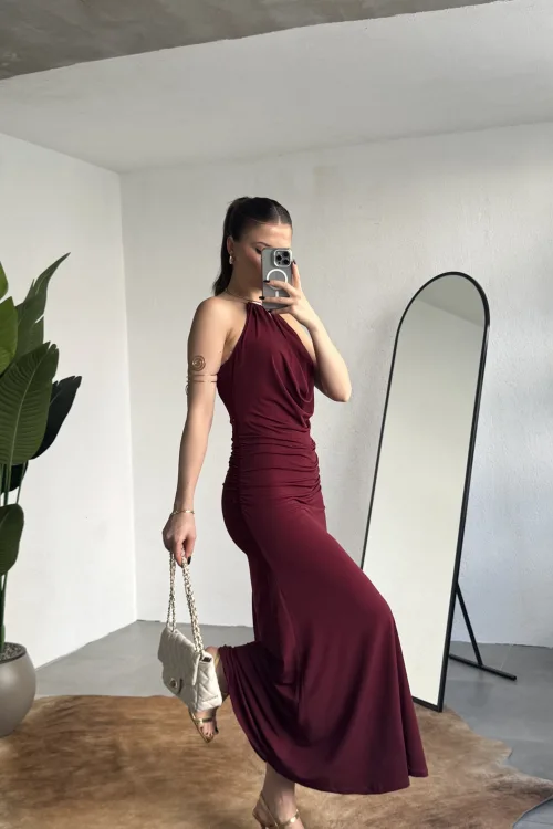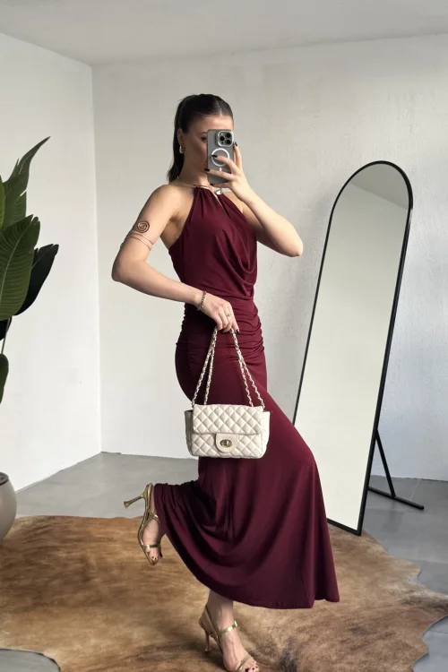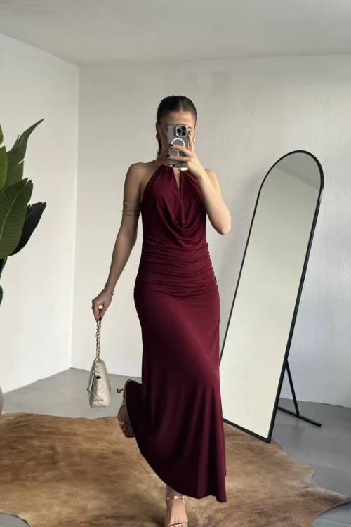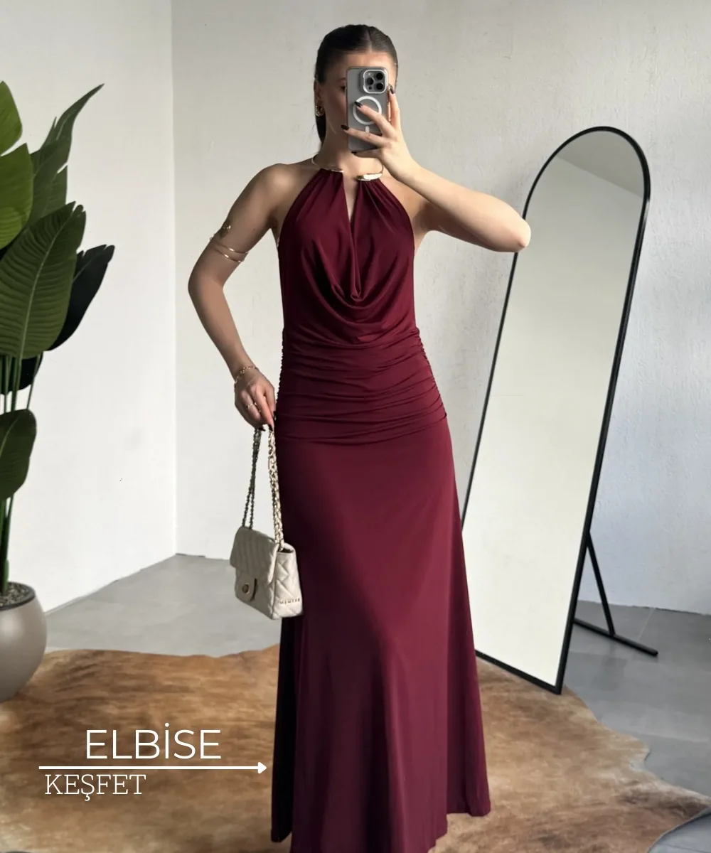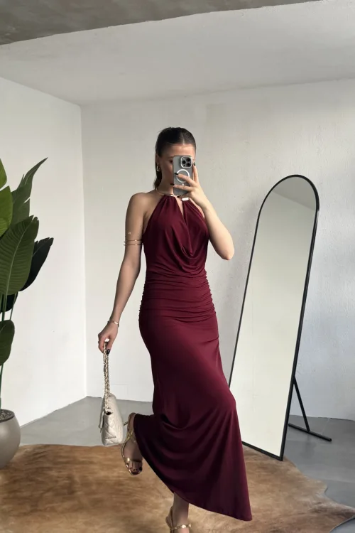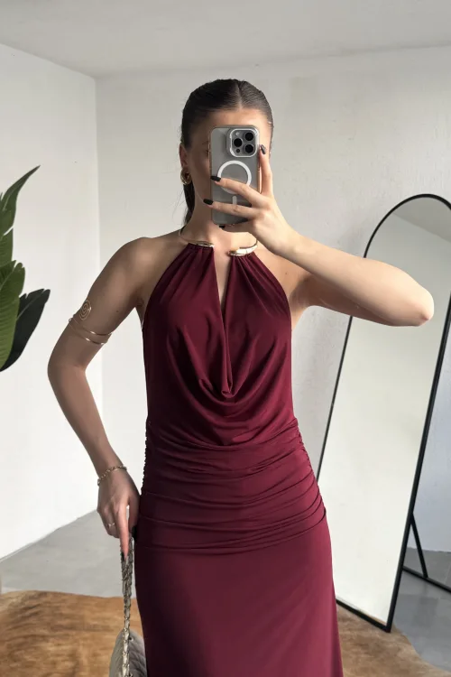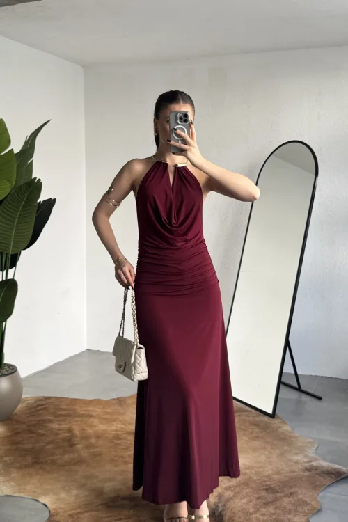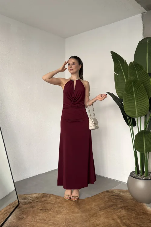 Kadın Bordo Halter Yaka Gold Aksesuarlı Maxi Uzun Boy Abiye Elbise Drapeli Sırt Dekolteli