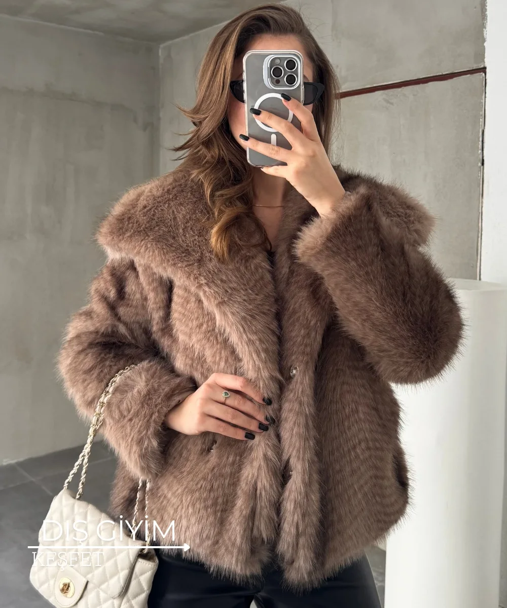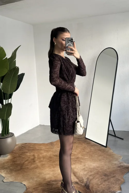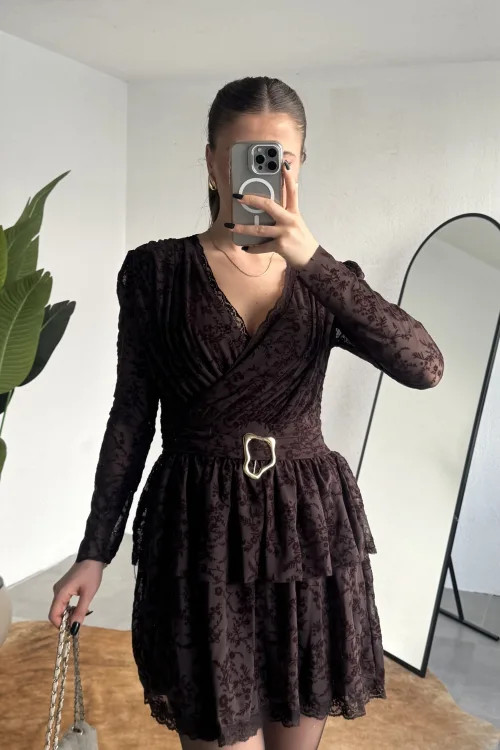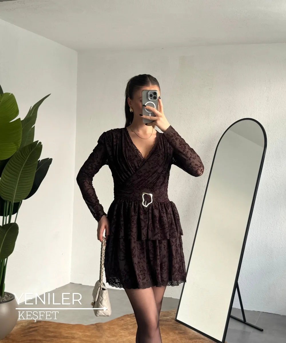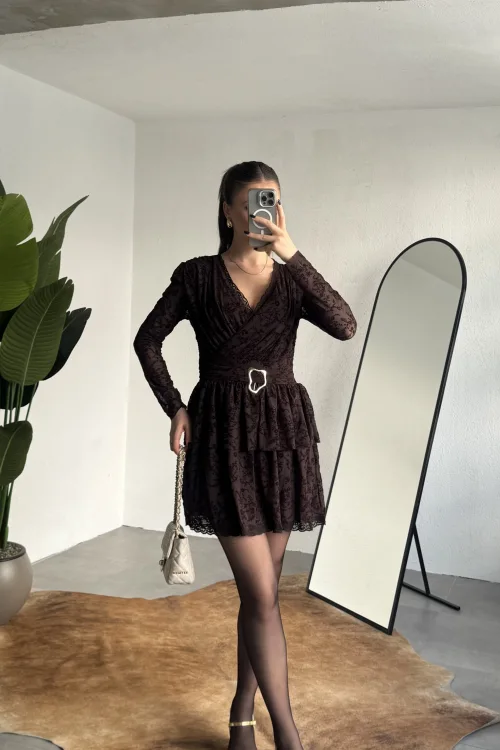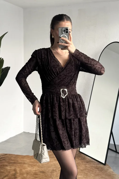 Kadın Kahverengi Dantel Mini Elbise Kruvaze Yaka Kemerli Uzun Kollu Abiye