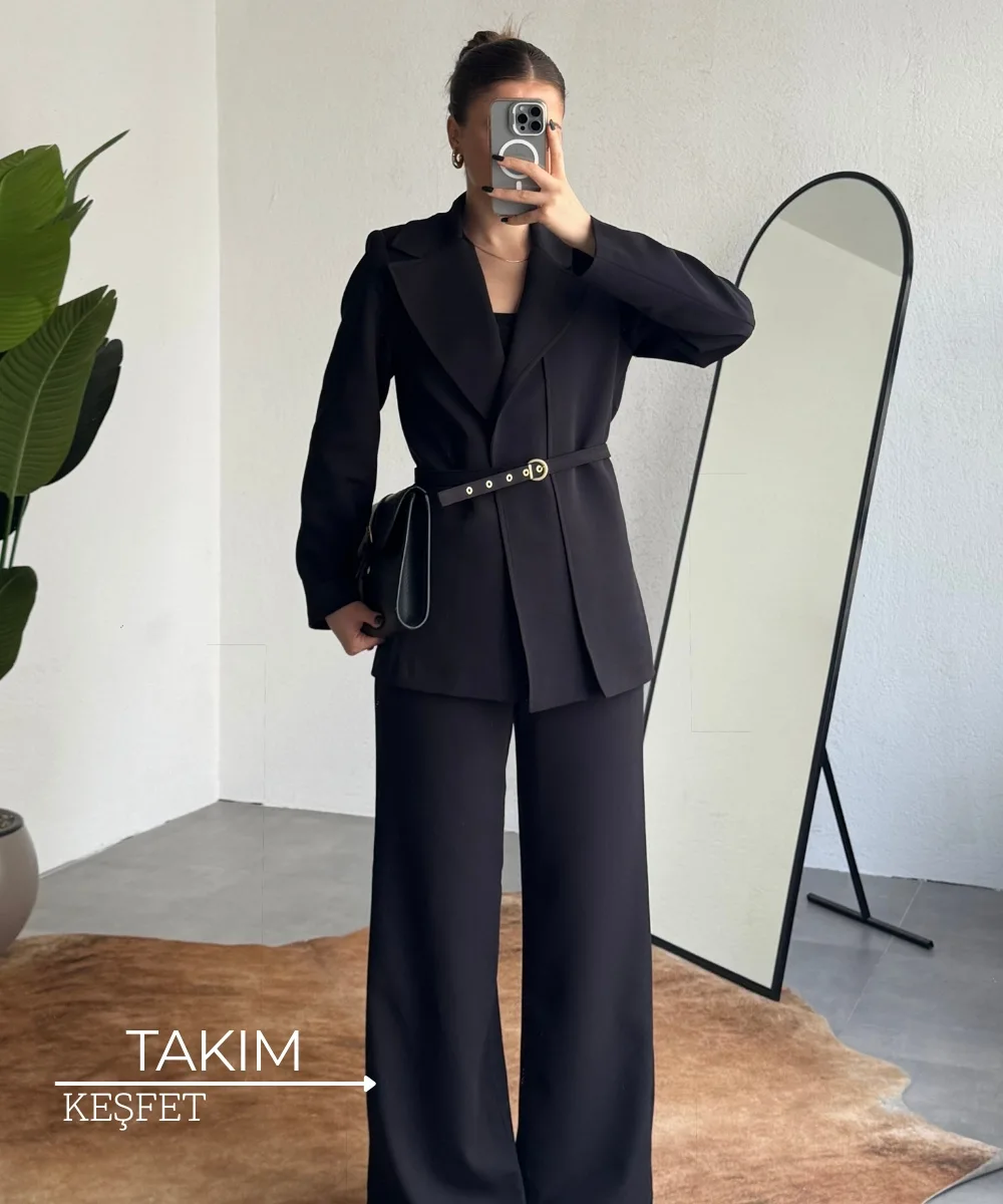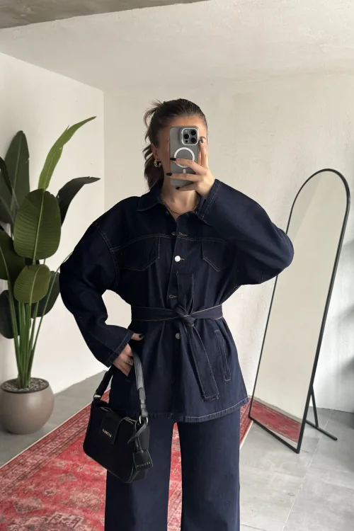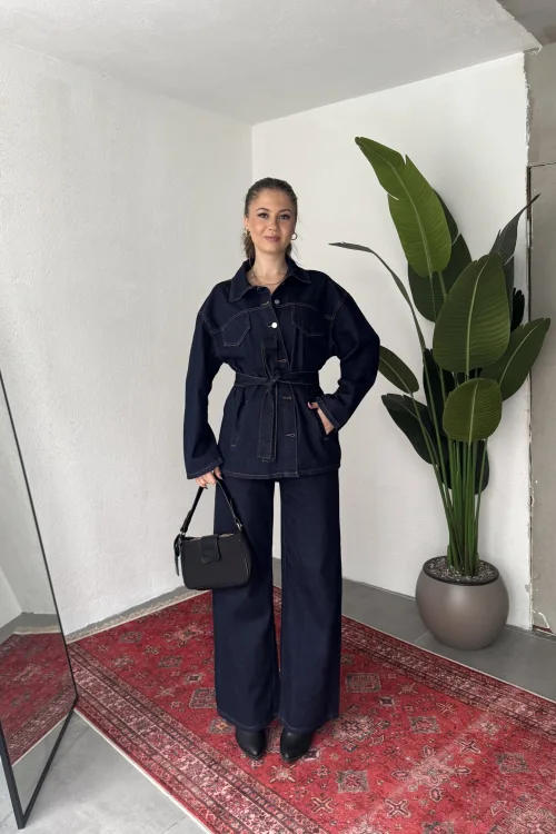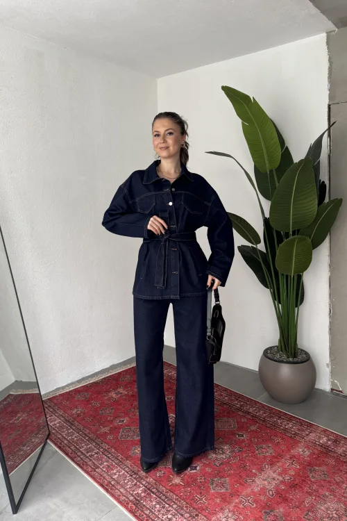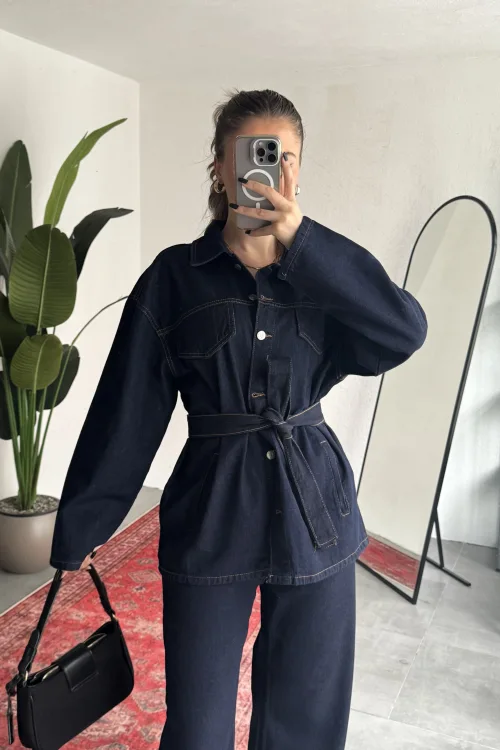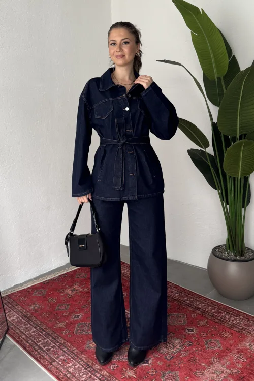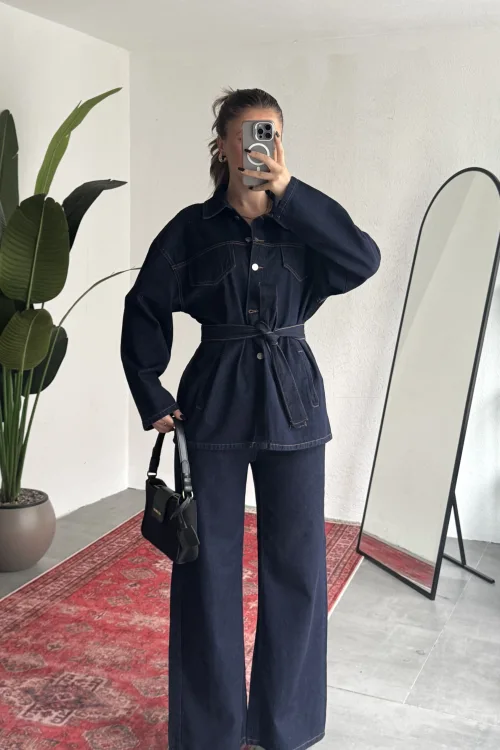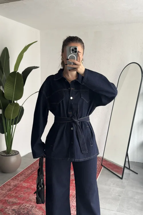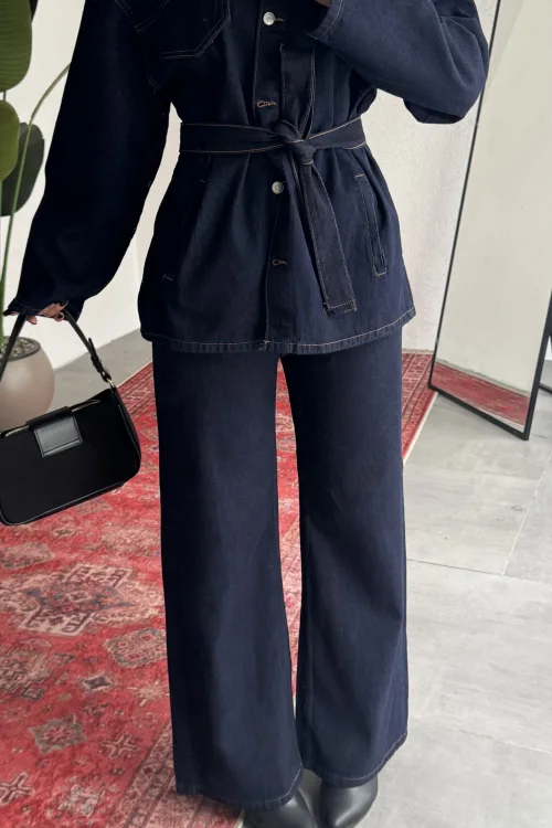 Kadın Lacivert Viral Kot Takım Oversize Gömlek Wide Leg Pantolon Kemerli Jean İkili Set