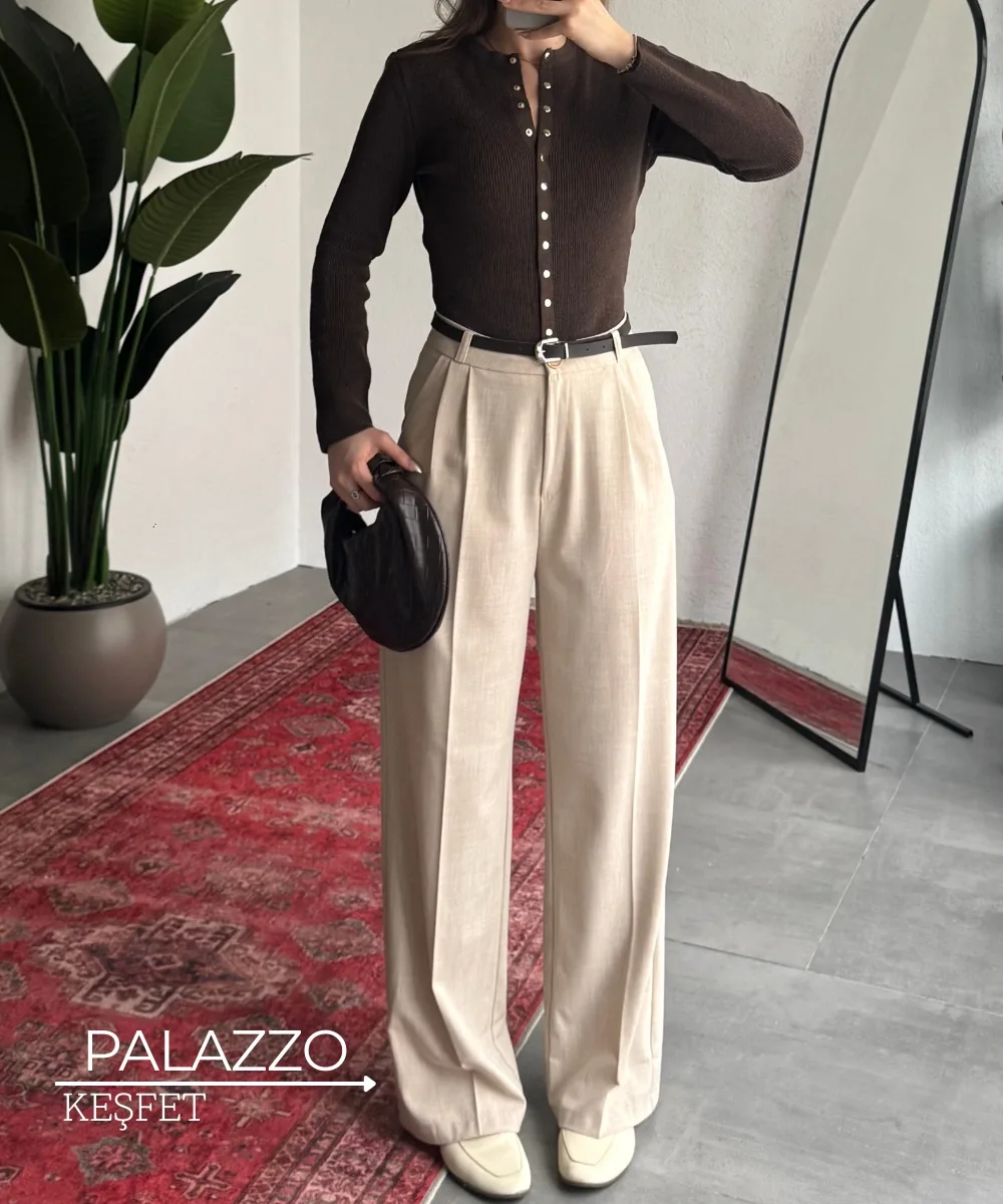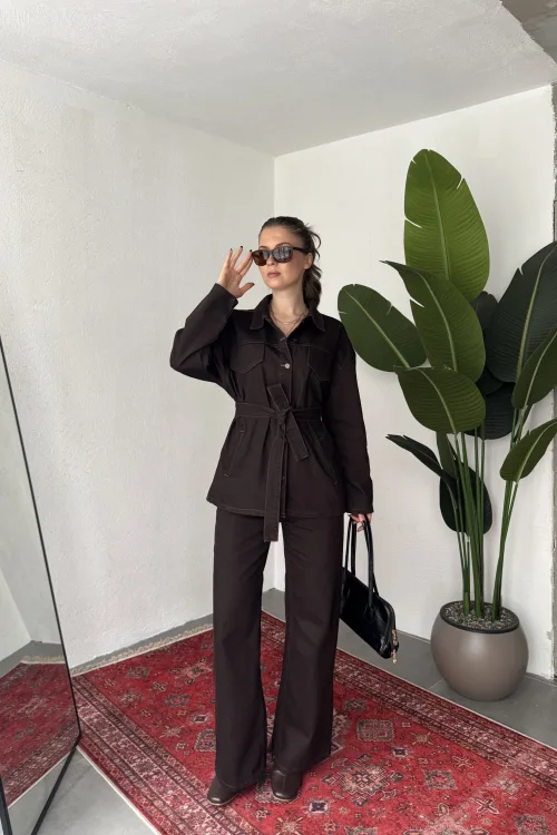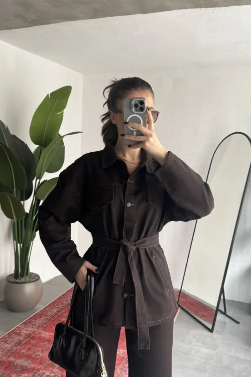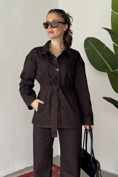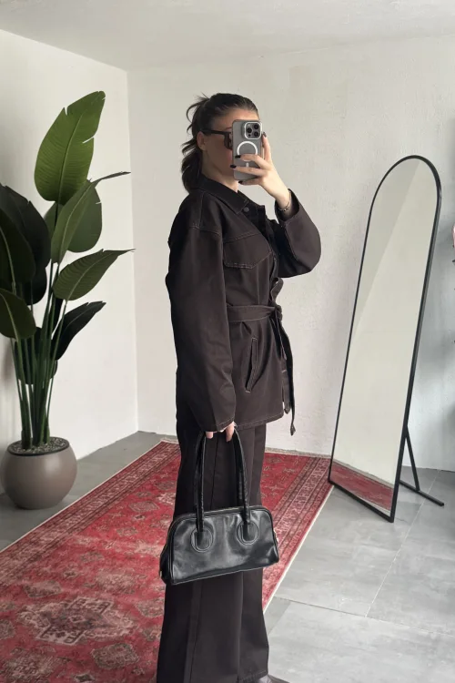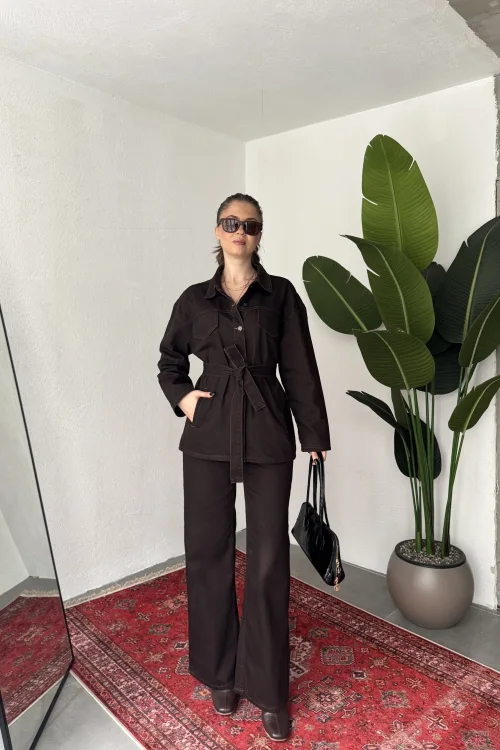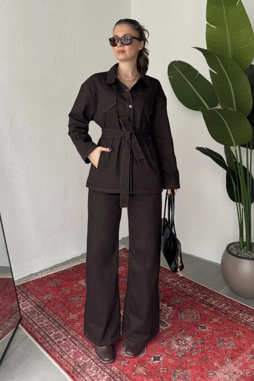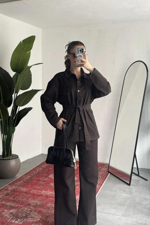 Kadın Kahve Viral Kot Takım Oversize Gömlek Wide Leg Pantolon Kemerli Jean İkili Set