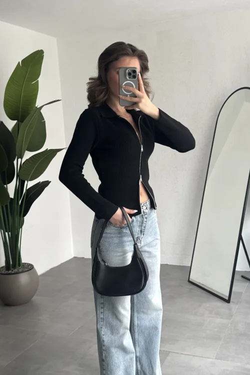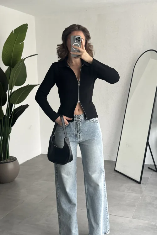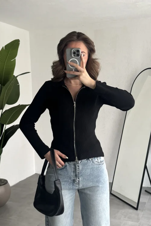 Kadın Siyah Fitilli Triko Hırka Fermuarlı Polo Yaka Basic Uzun Kollu