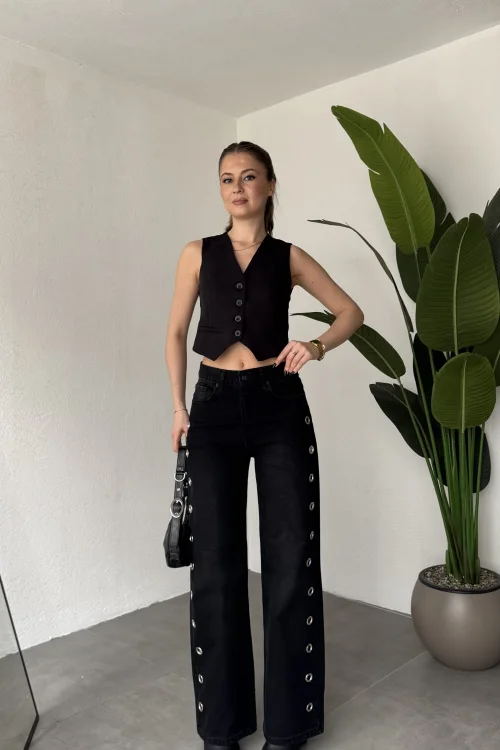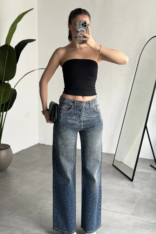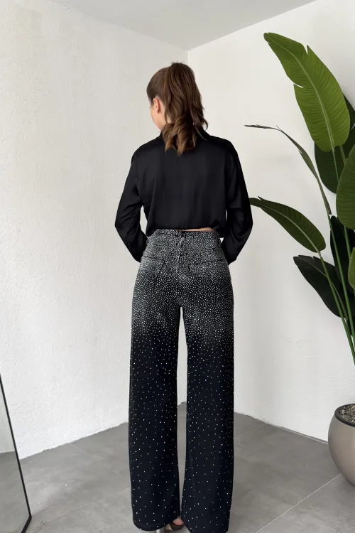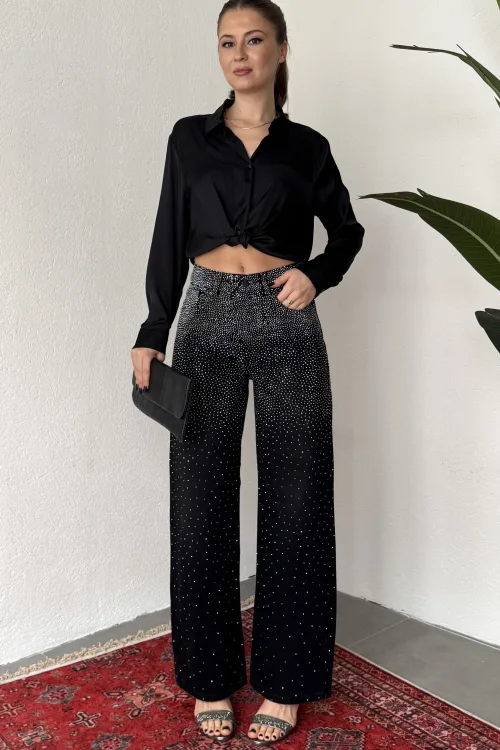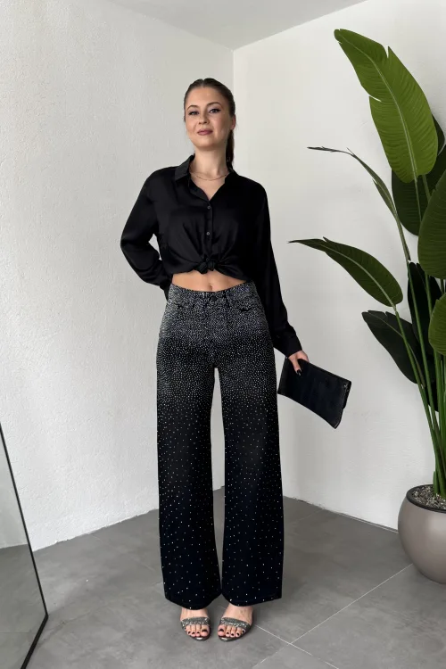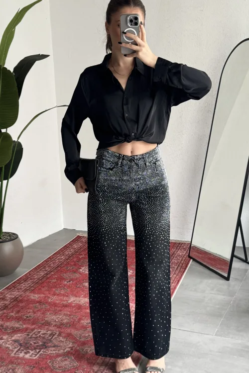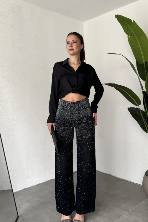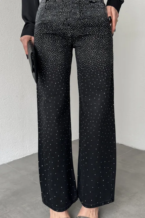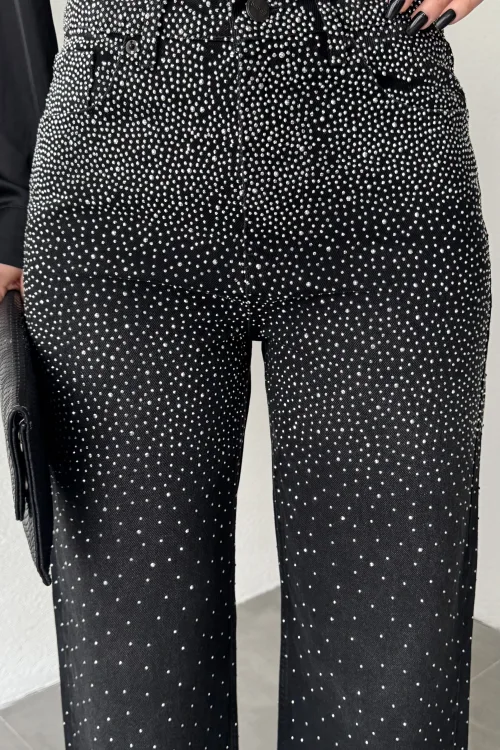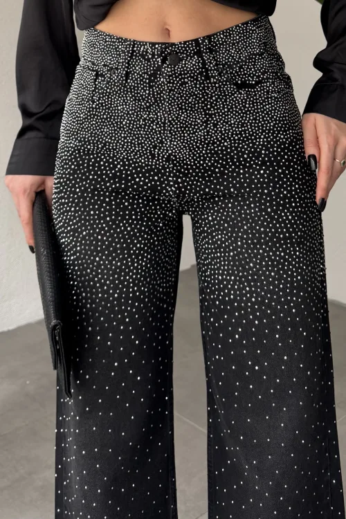 Kadın Siyah Taşlı Wide Leg Jean Pantolon Yüksek Bel Bol Paça Denim