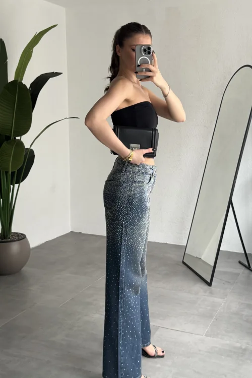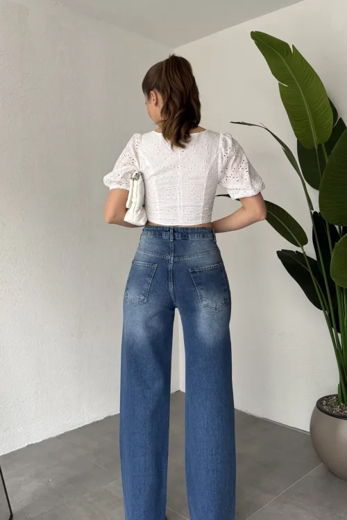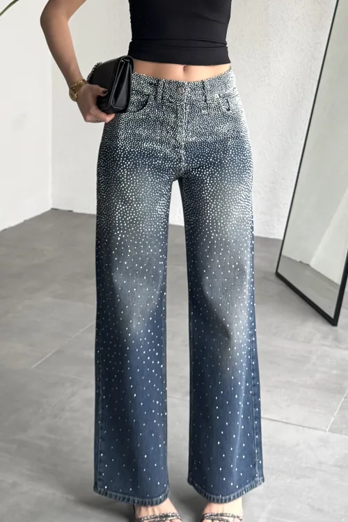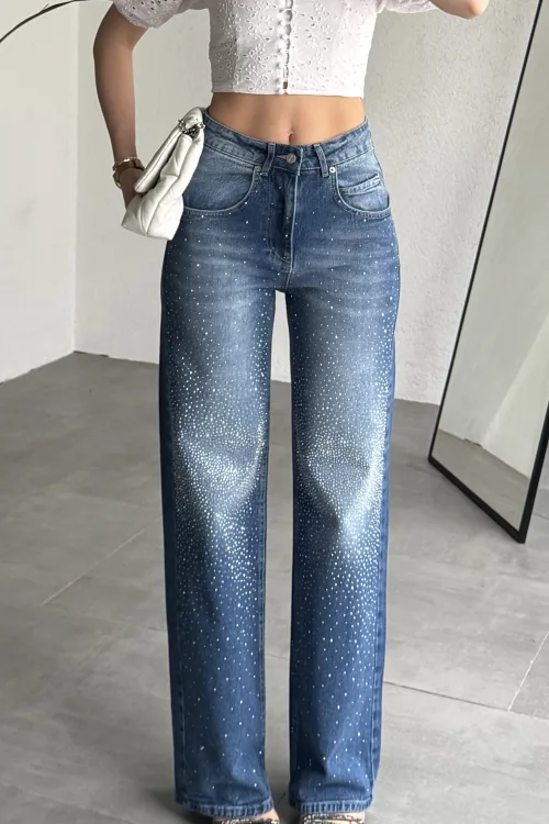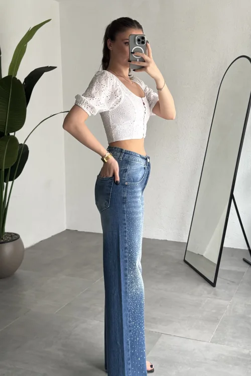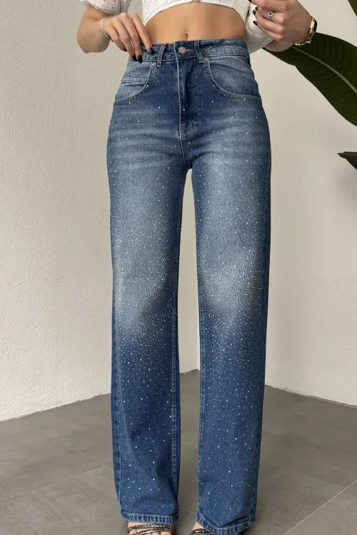 Kadın Mavi Taşlı Wide Leg Jean Pantolon Yüksek Bel Bol Paça Denim