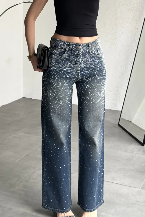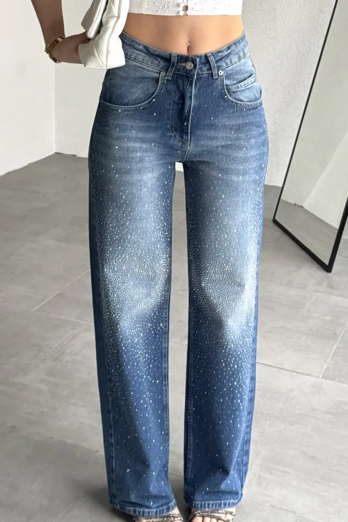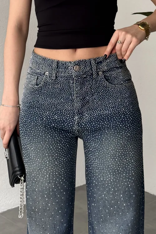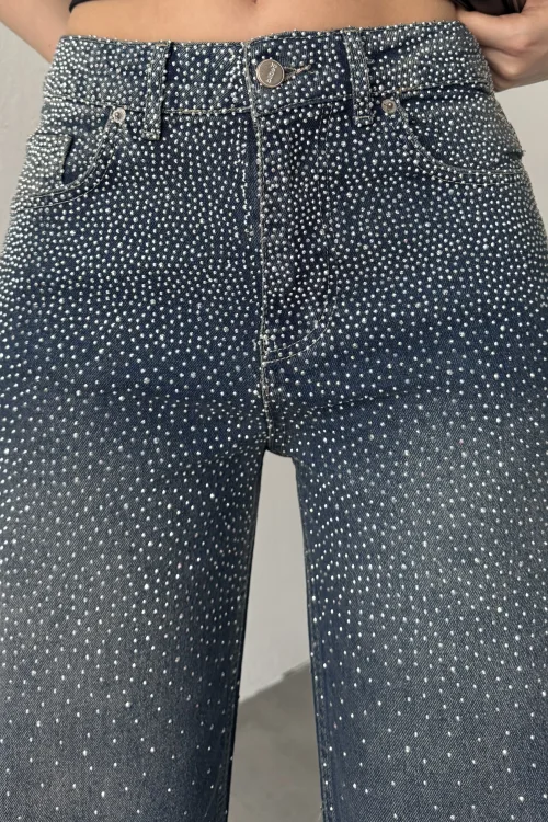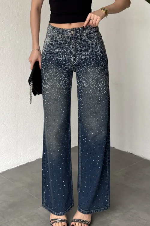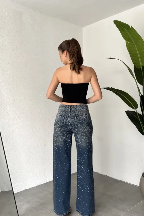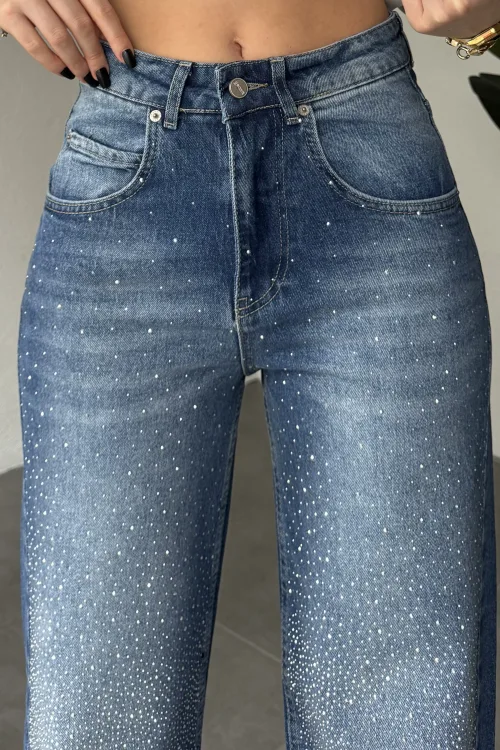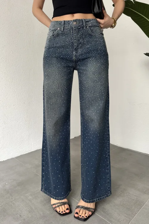 Kadın Koyu Mavi Taşlı Wide Leg Jean Pantolon Yüksek Bel Bol Paça Denim