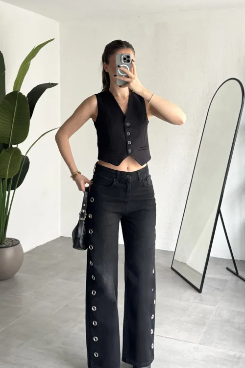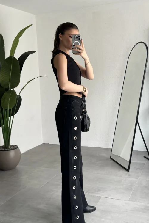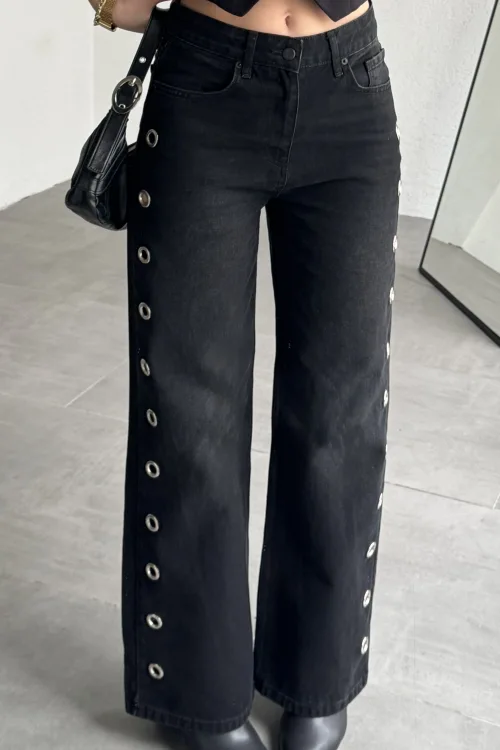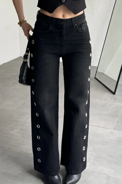 Kadın Siyah Halka Detaylı Wide Leg Jean Pantolon Yüksek Bel Bol Paça Denim