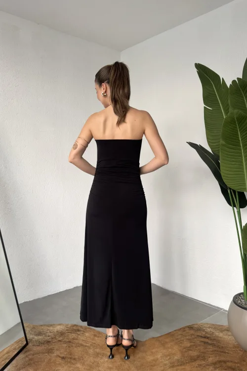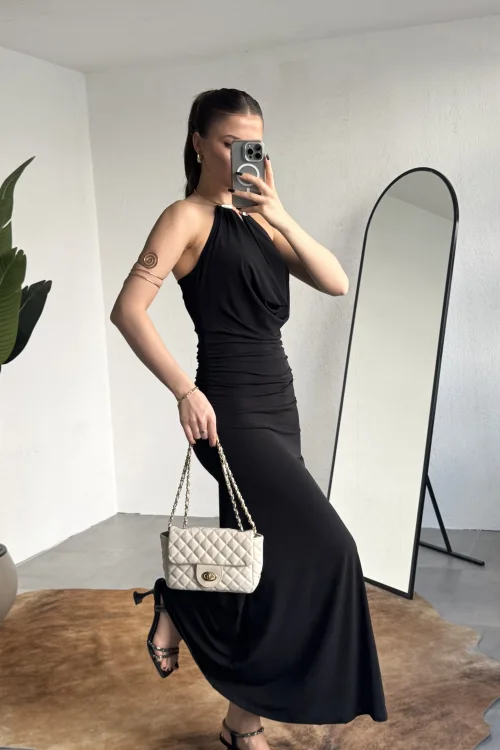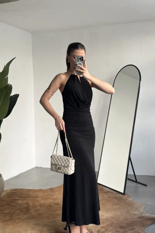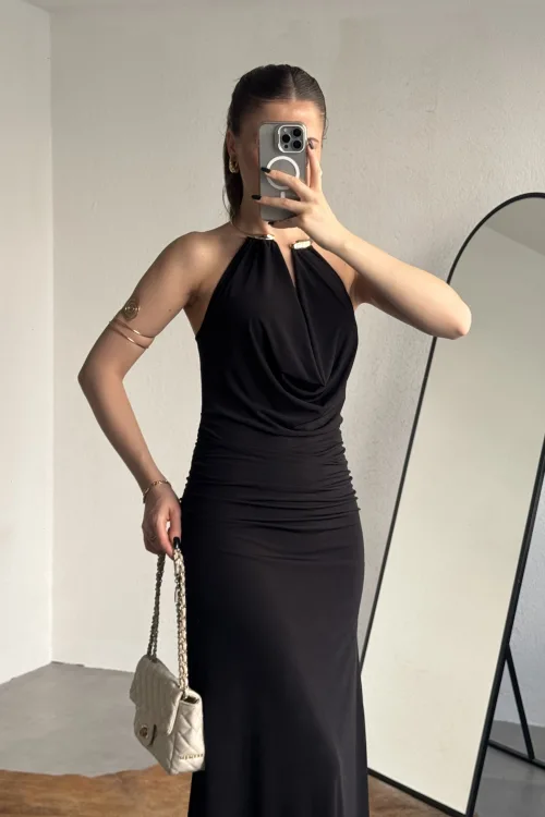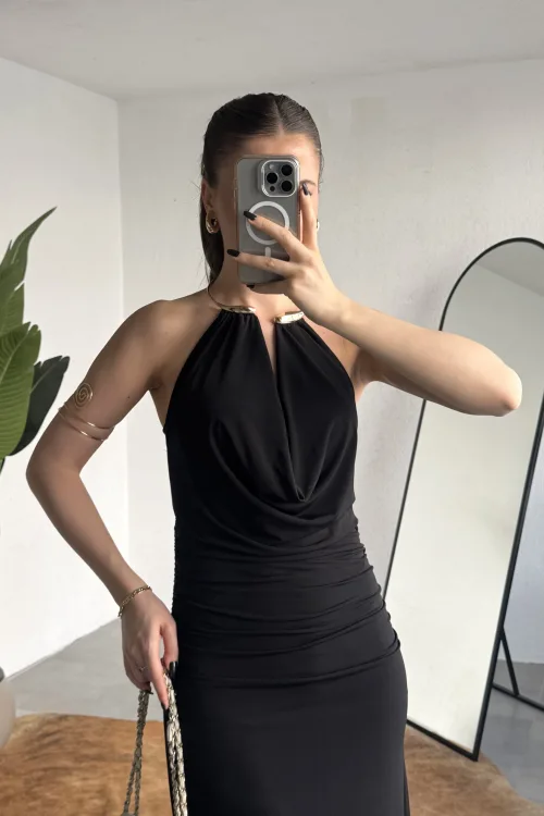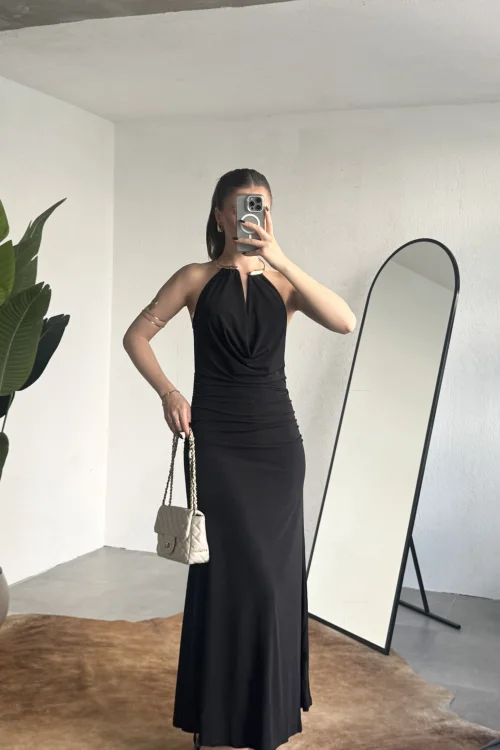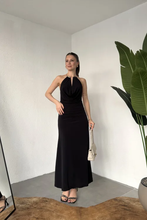 Kadın Siyah Halter Yaka Gold Aksesuarlı Maxi Uzun Boy Abiye Elbise Drapeli Sırt Dekolteli