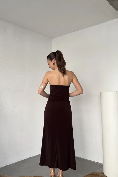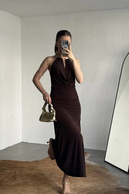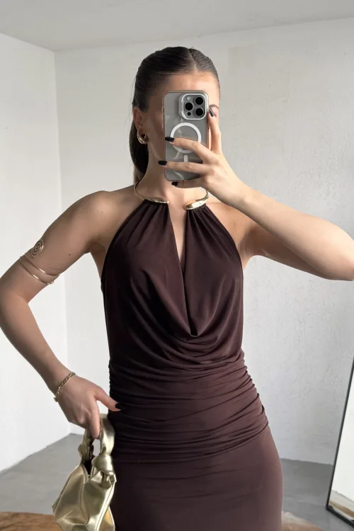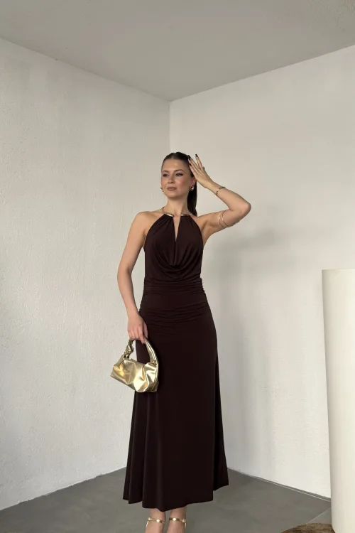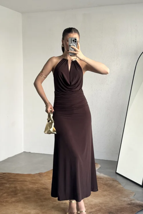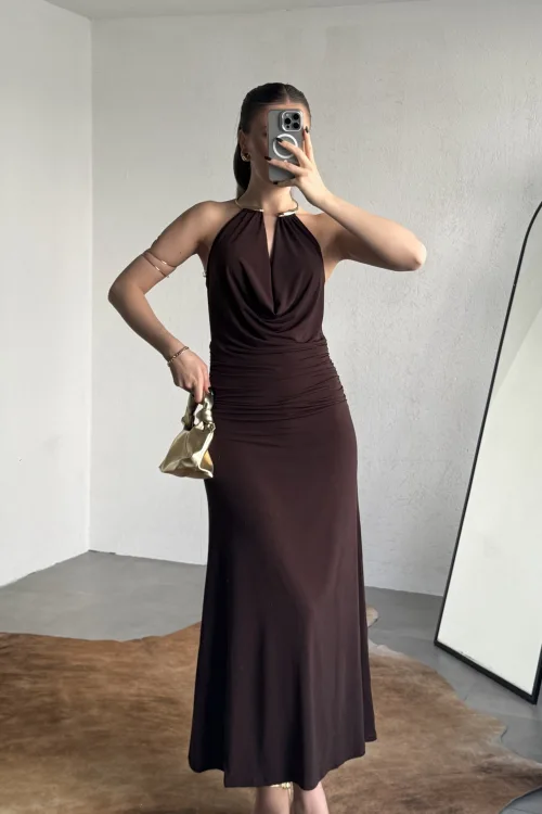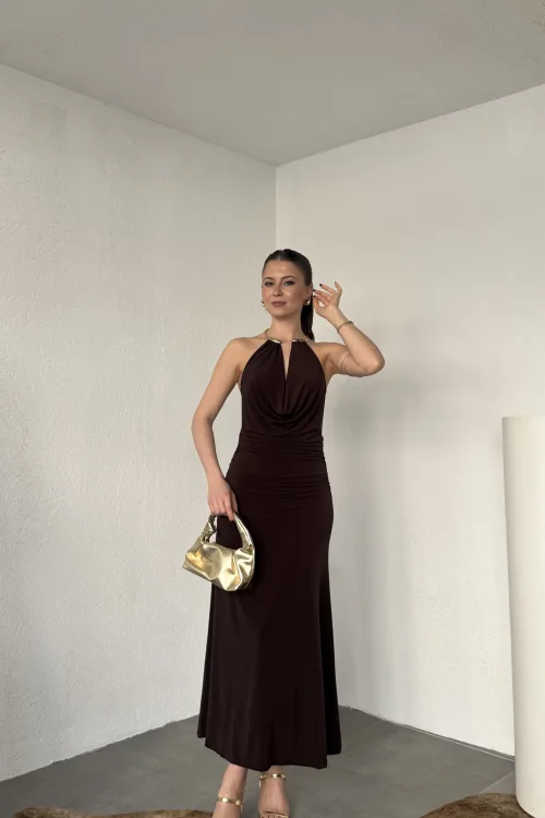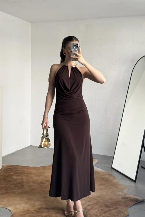 Kadın Kahverengi Halter Yaka Gold Aksesuarlı Maxi Uzun Boy Abiye Elbise Drapeli Sırt Dekolteli