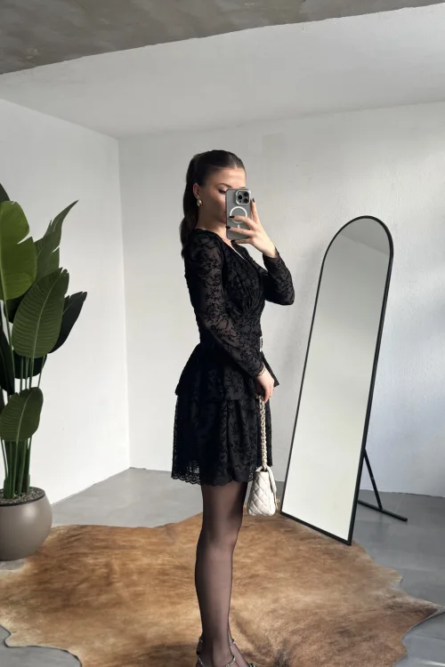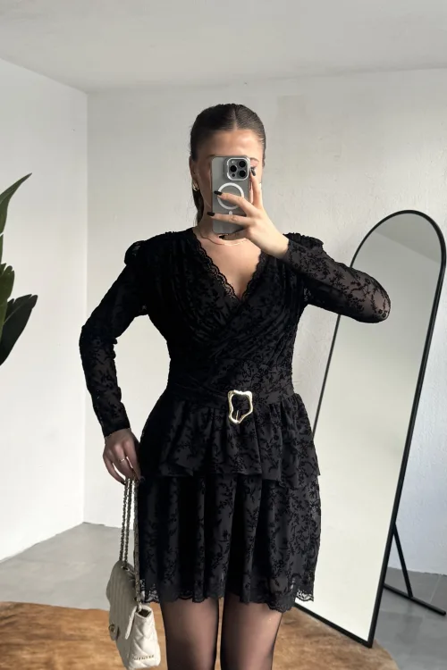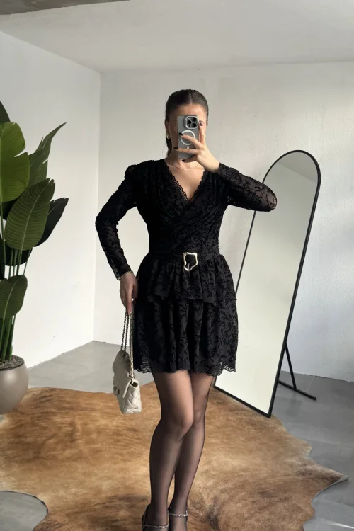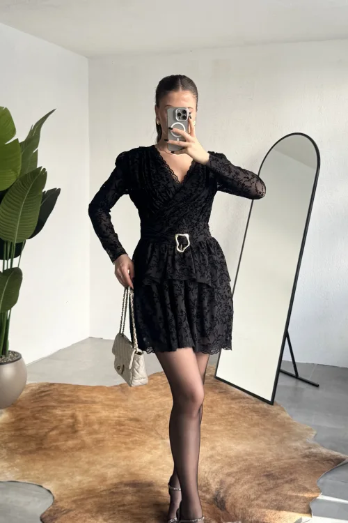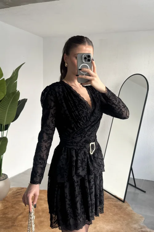 Kadın Siyah Dantel Mini Elbise Kruvaze Yaka Kemerli Uzun Kollu Abiye
