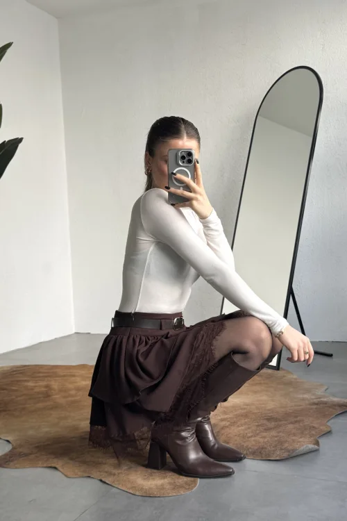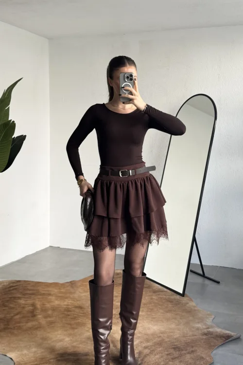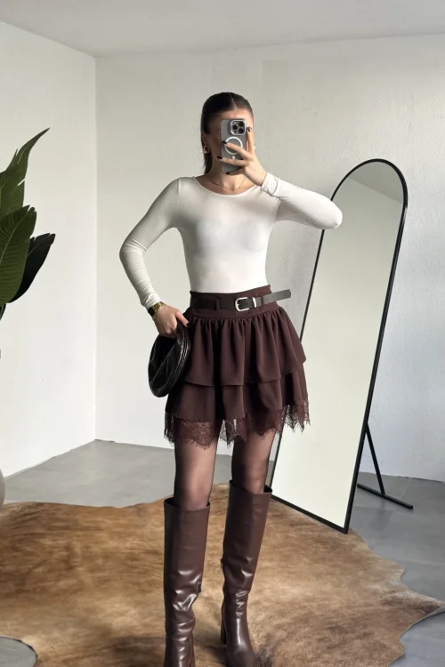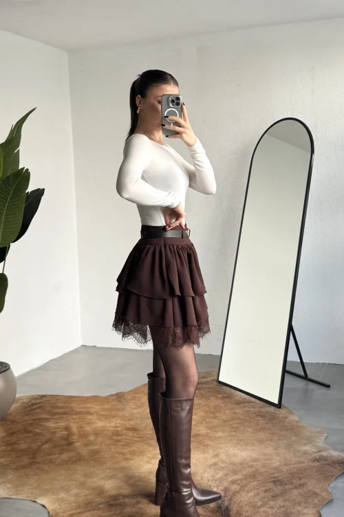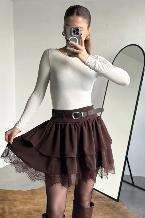 Kadın Kahverengi Dantel Detaylı Fırfırlı Mini Etek Kemerli