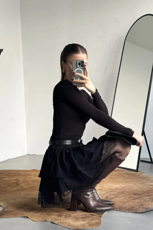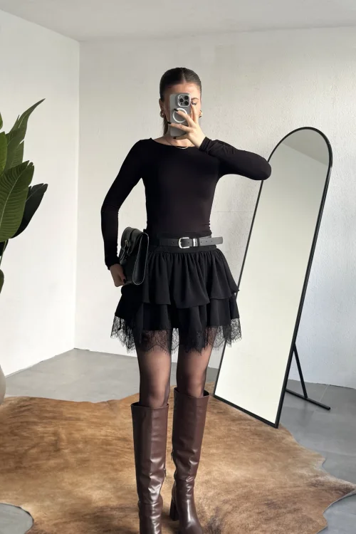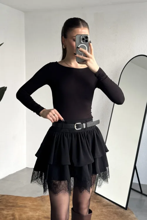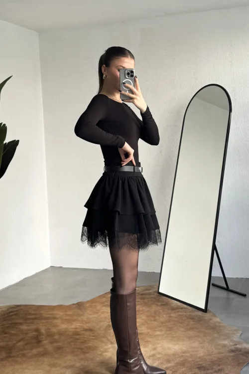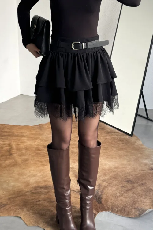 Kadın Siyah Dantel Detaylı Fırfırlı Mini Etek Kemerli