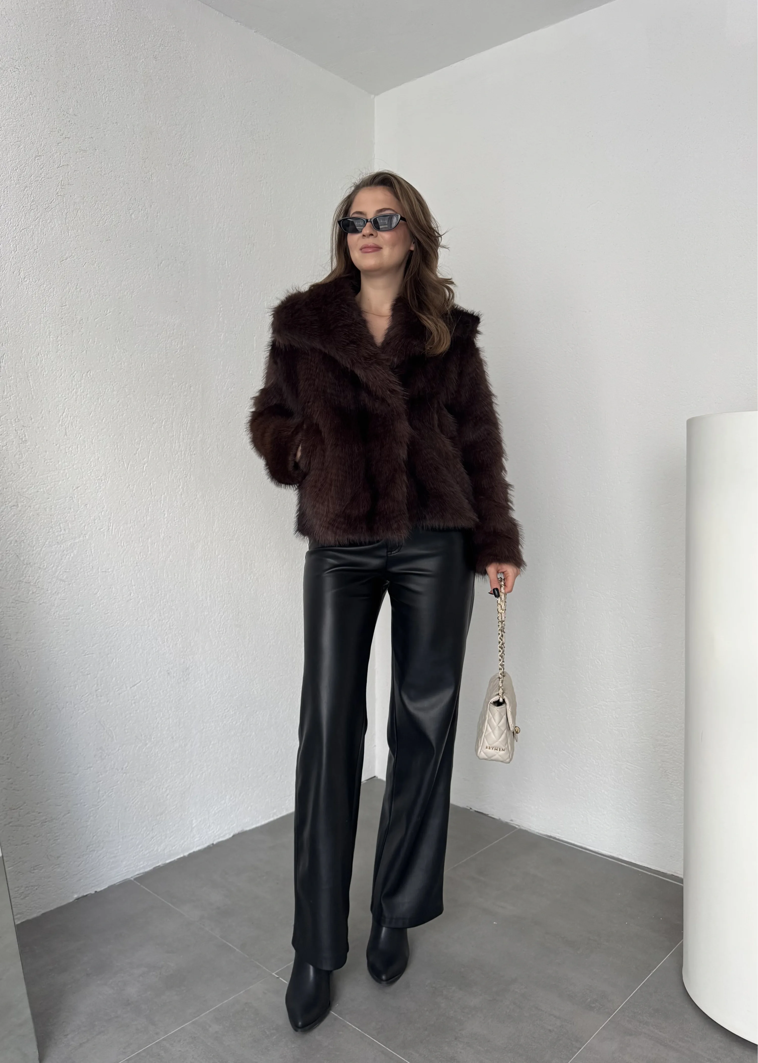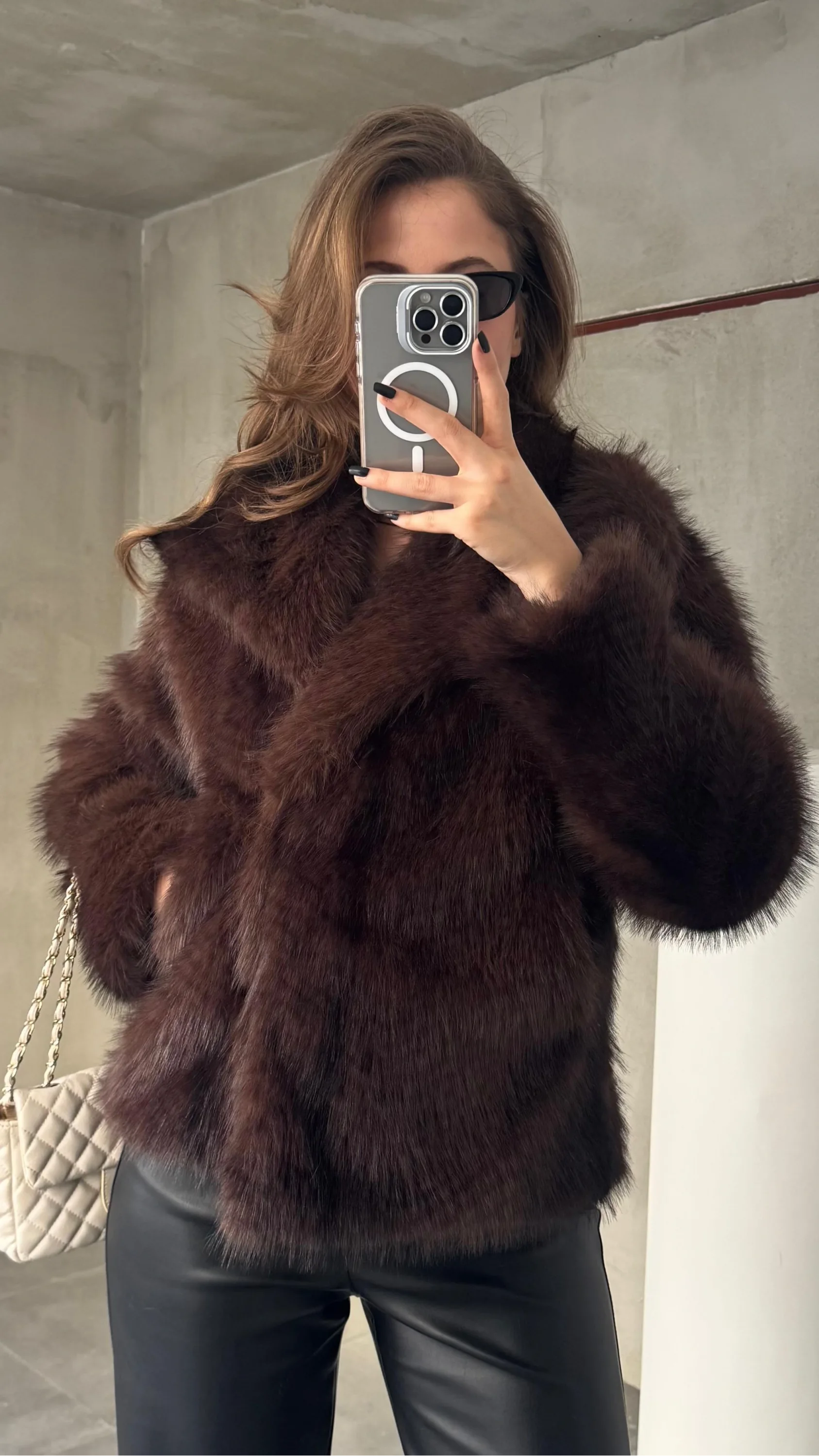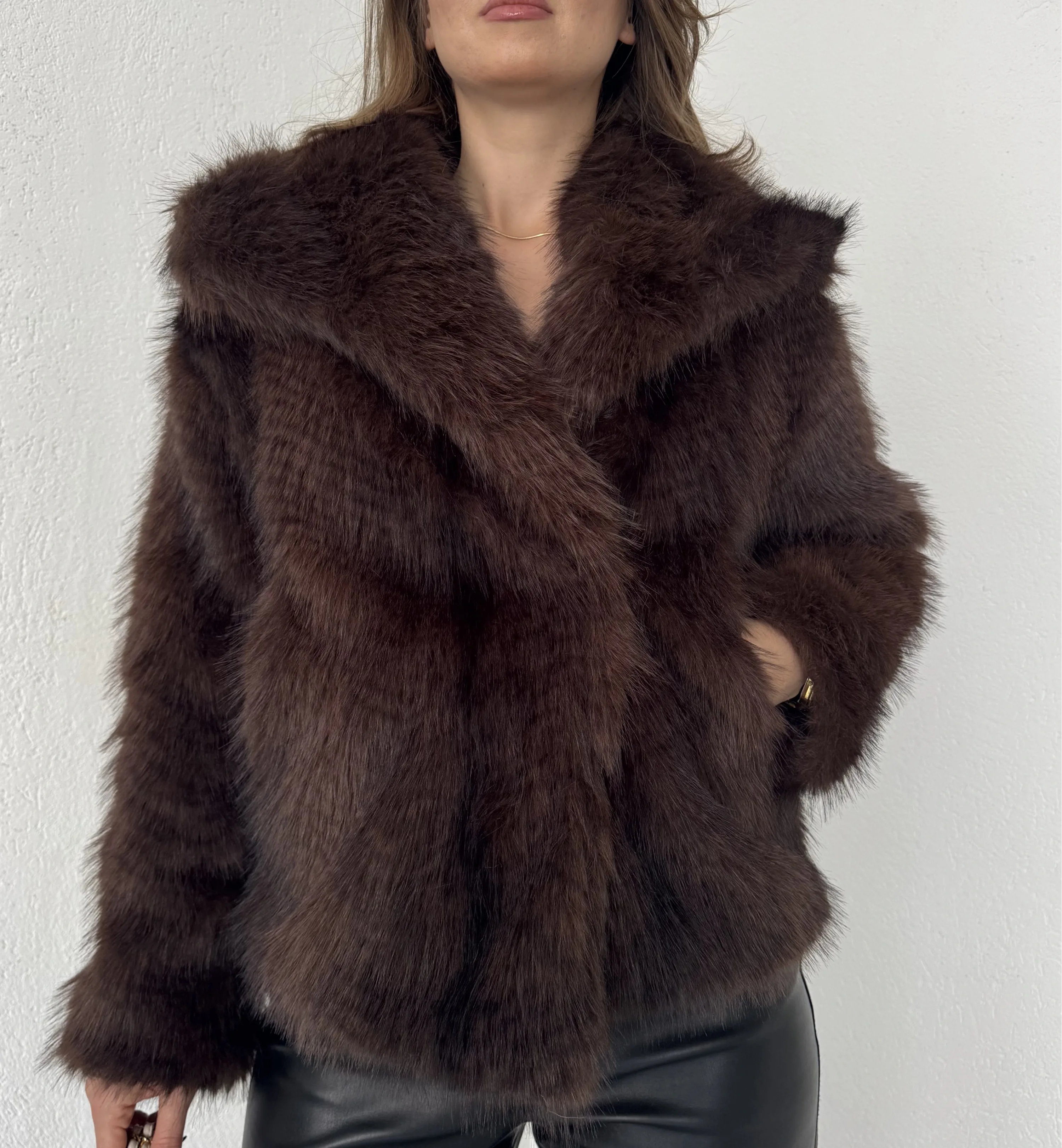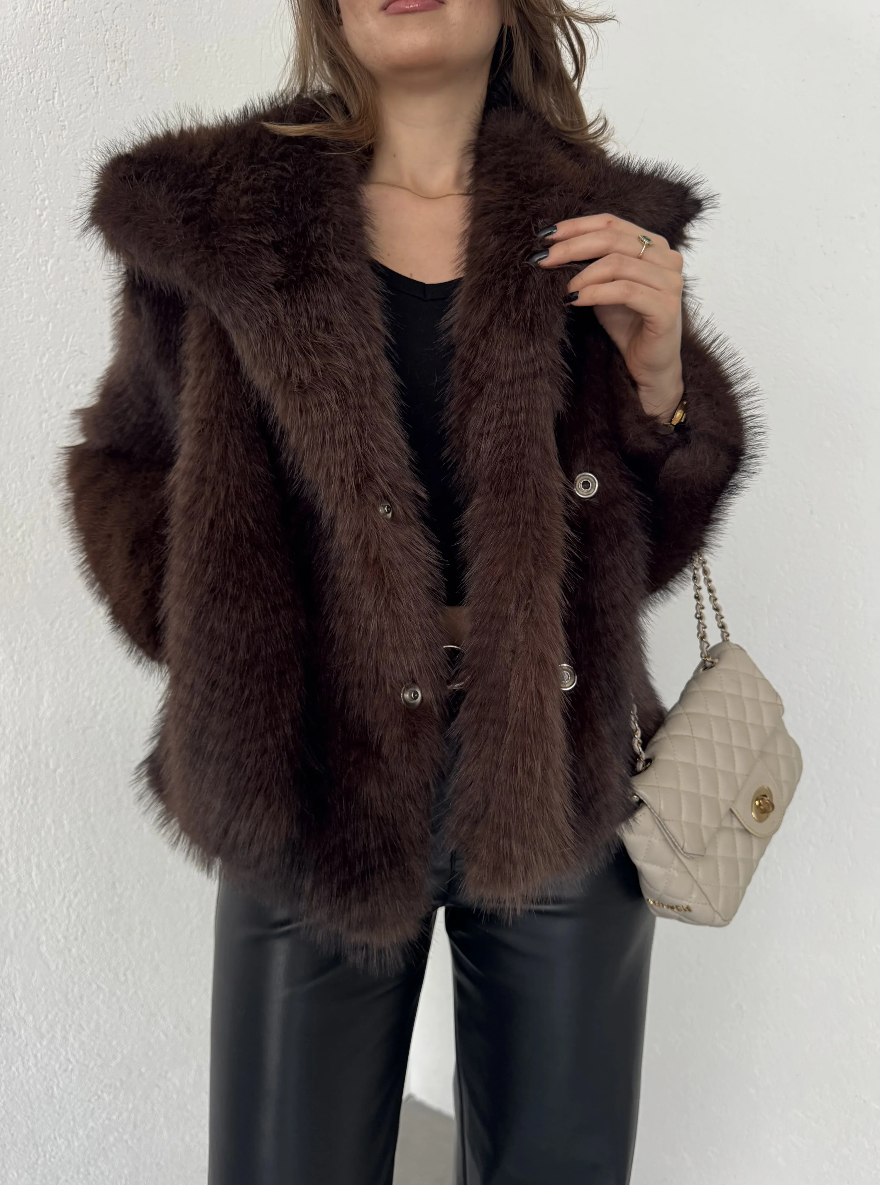 Sütlü Kahve Şal Yaka Jakarlı Çıt Çıtlı Cepli Geniş Kalıp Lolita Kürk