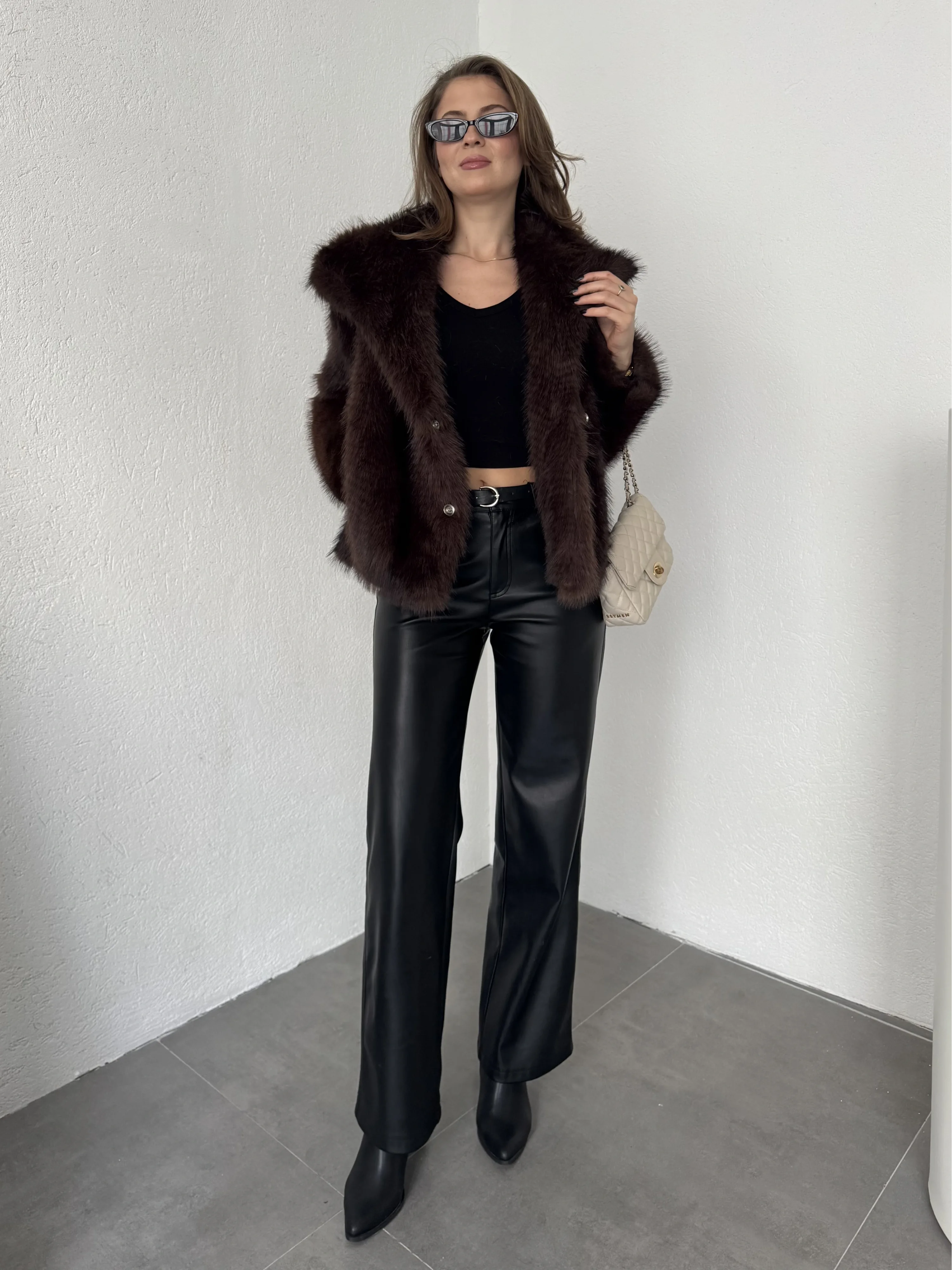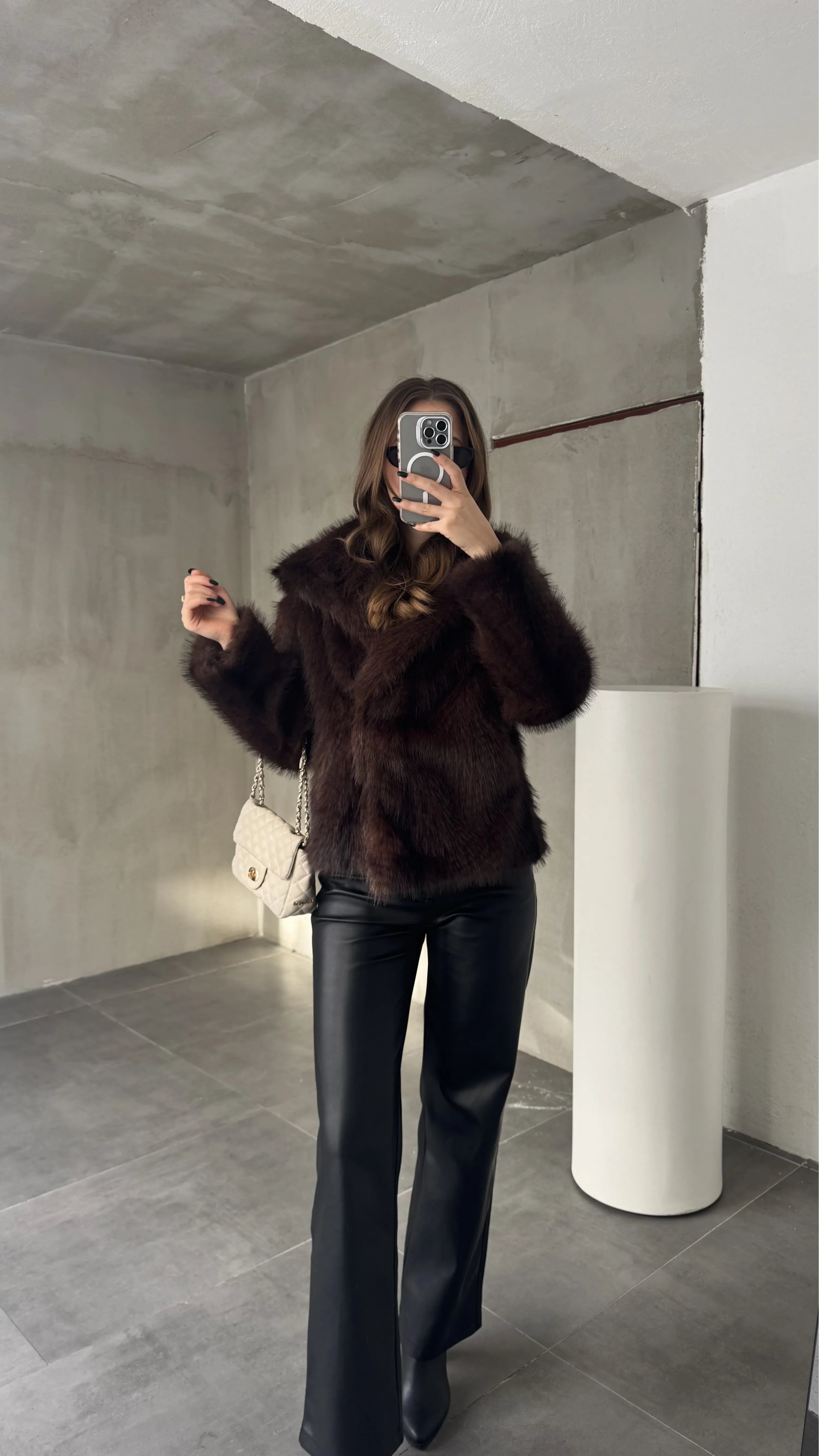 Acı Kahve Şal Yaka Jakarlı Çıt Çıtlı Cepli Geniş Kalıp Lolita Kürk