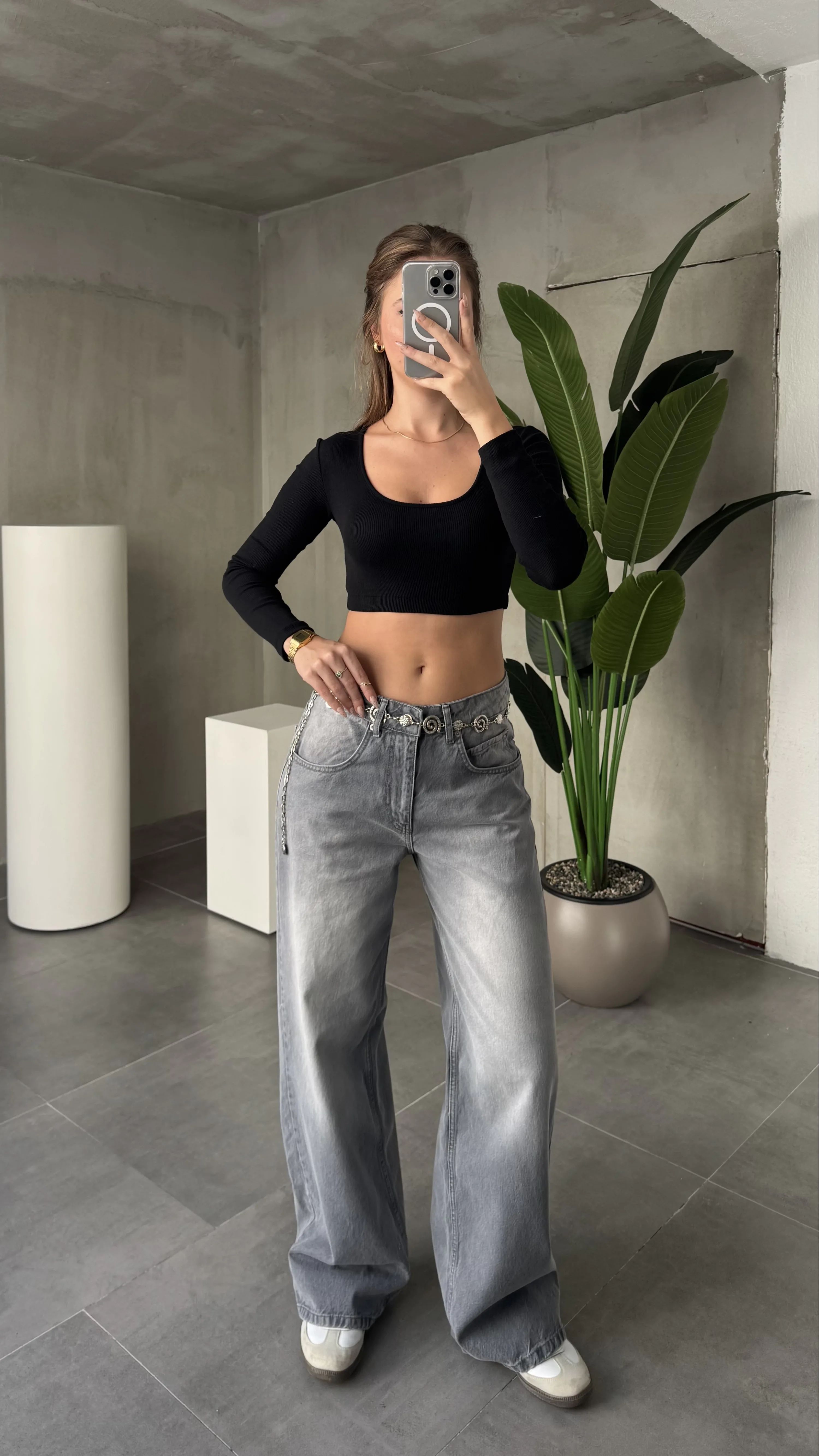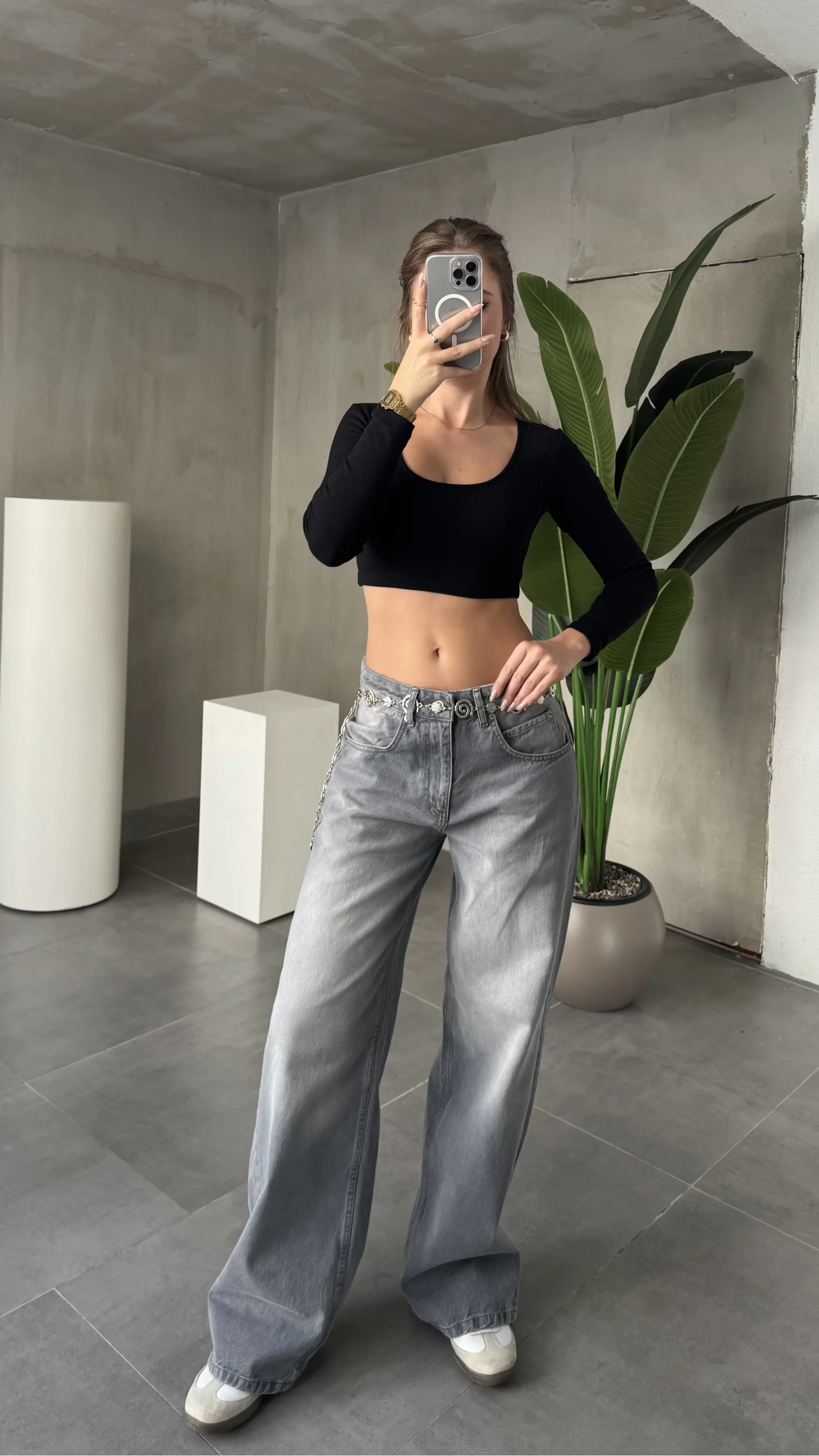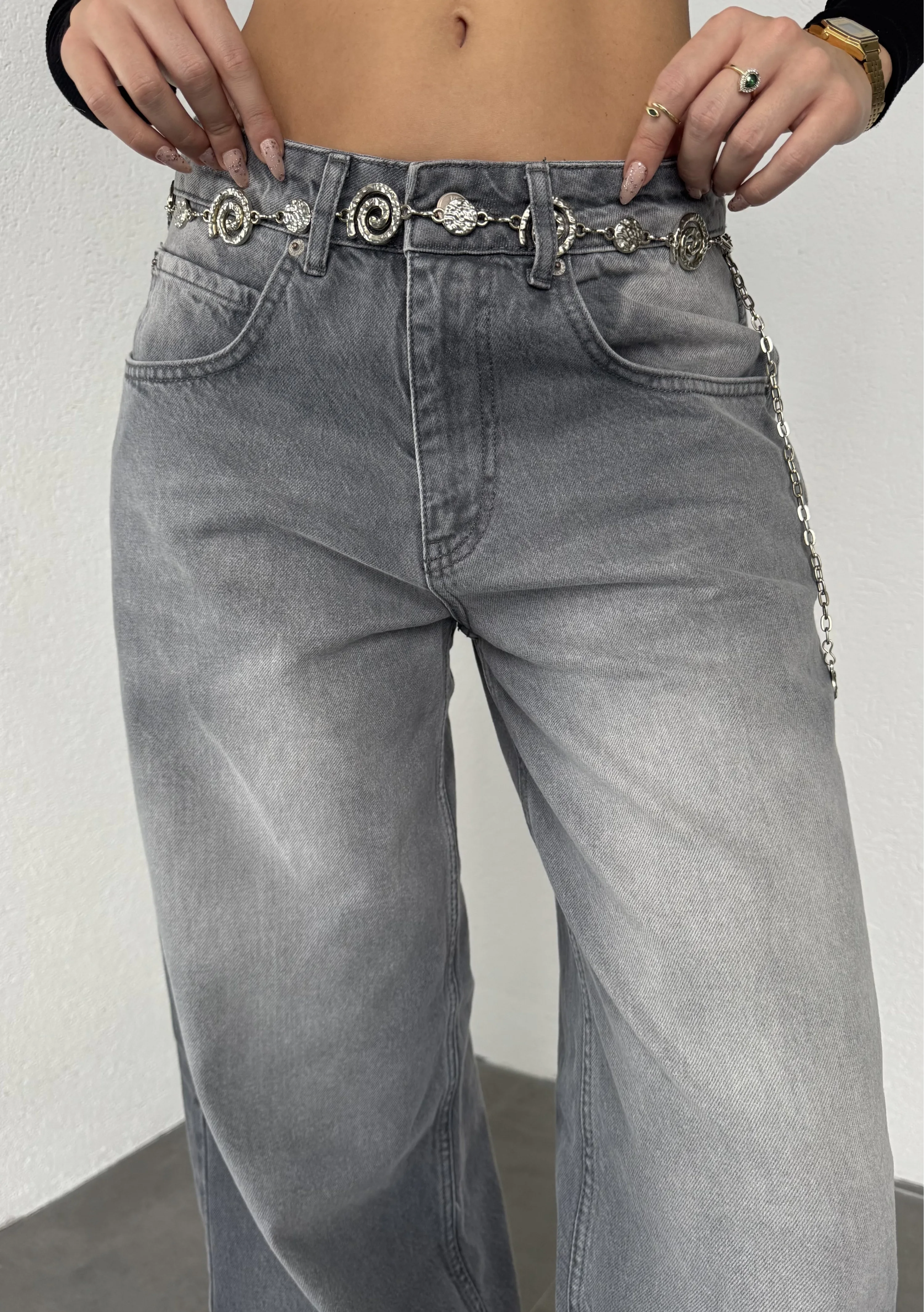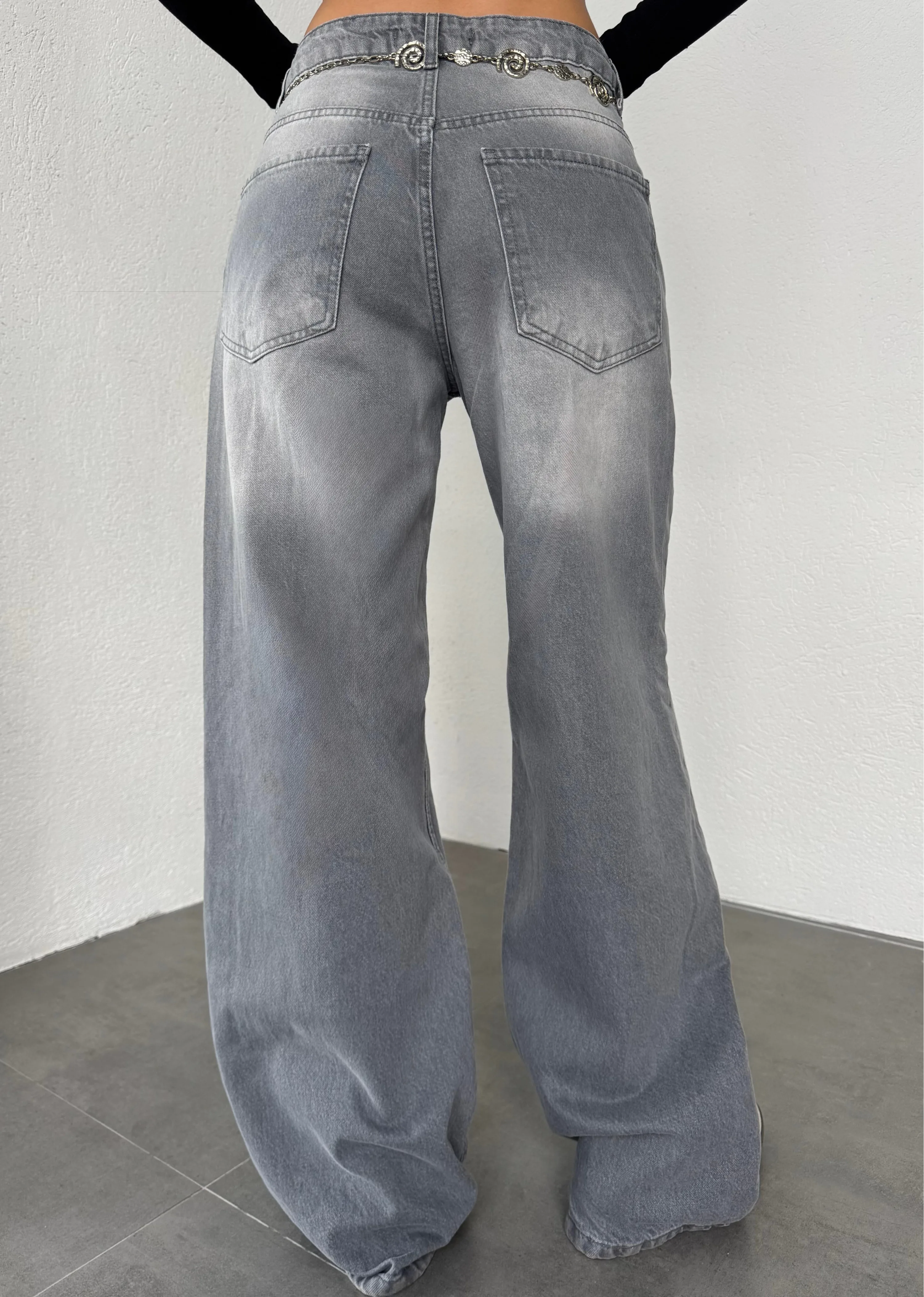 Açık Gri Yıkamalı Süper Baggy Ektra Geniş Paça Yüksek Bel Jean Kot Pantolon