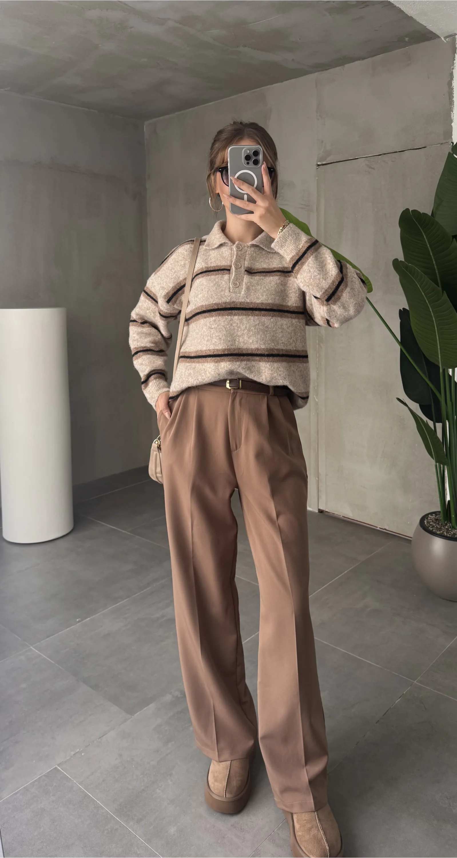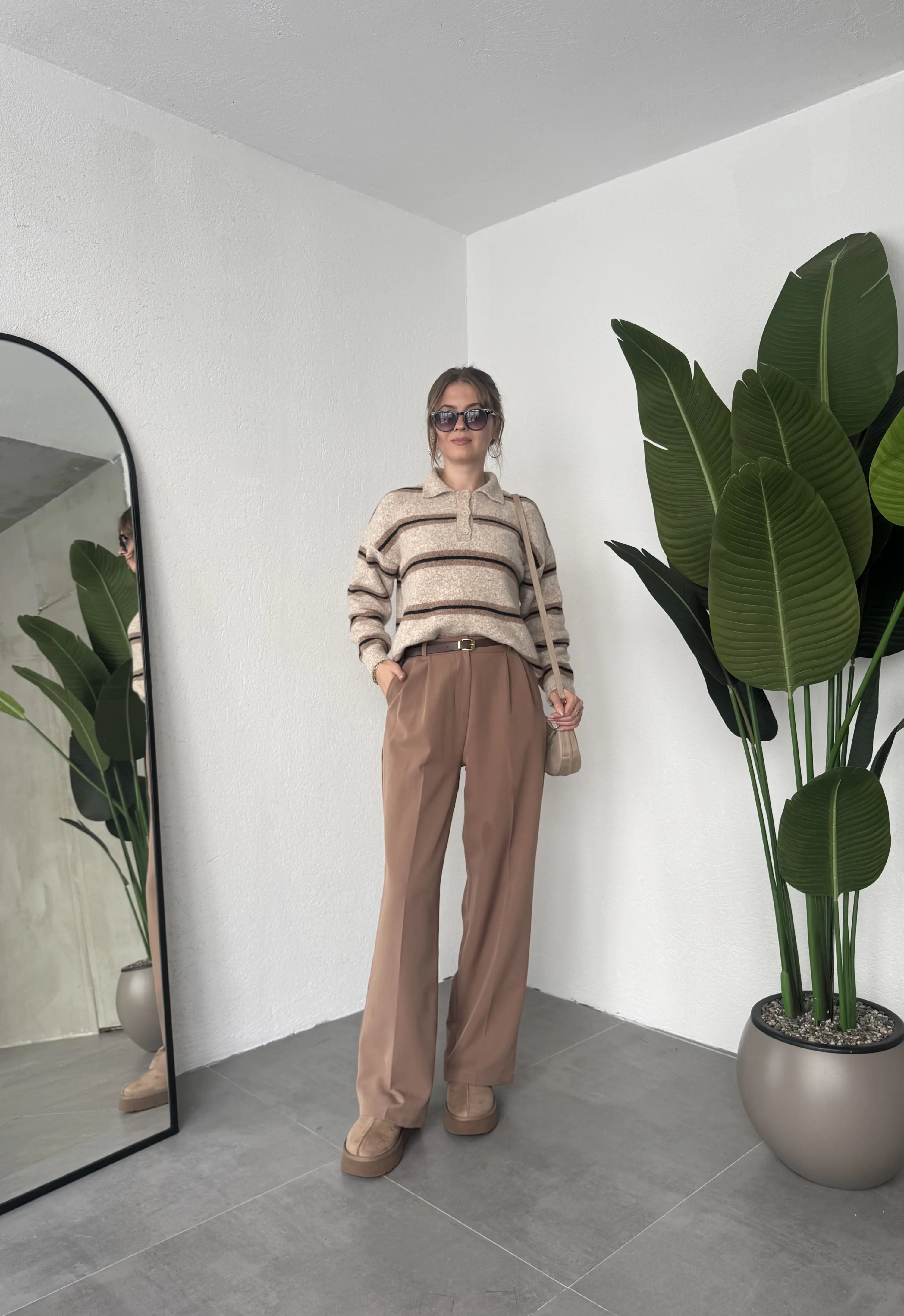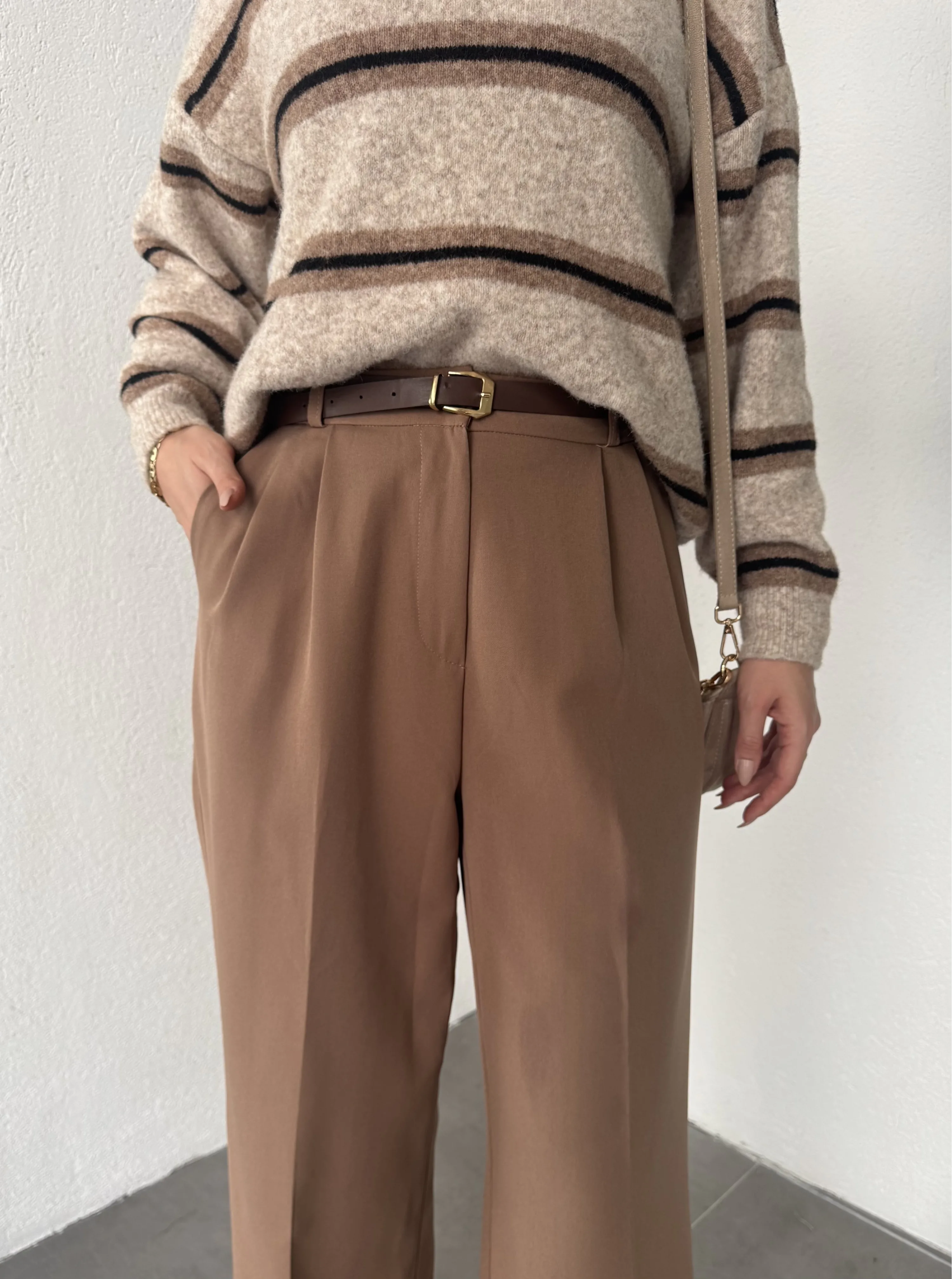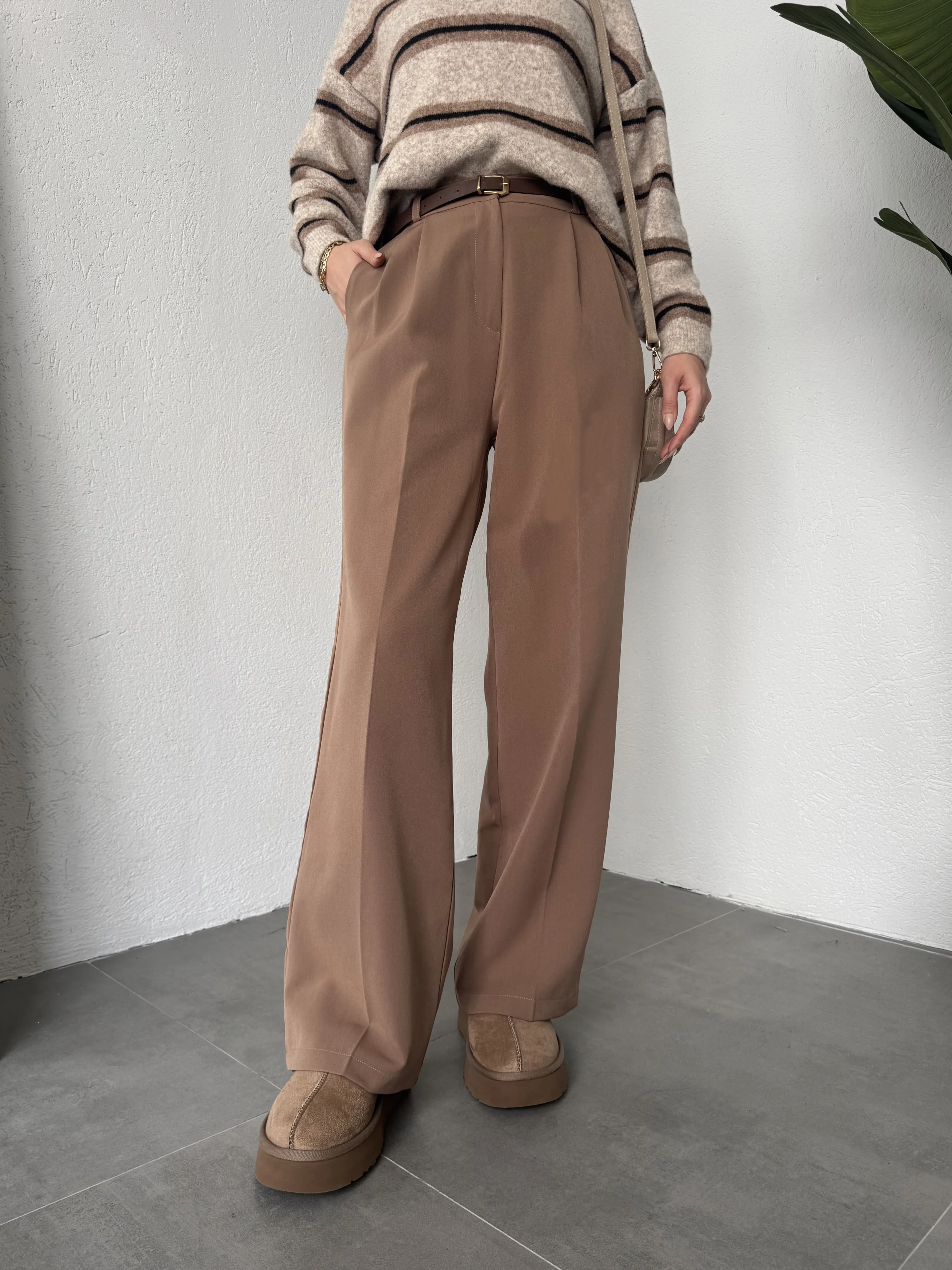 Açık Kahverengi Pileli Tam Kalıp Bel Oturtmalı Geniş Paça Palazzo Pantolon
