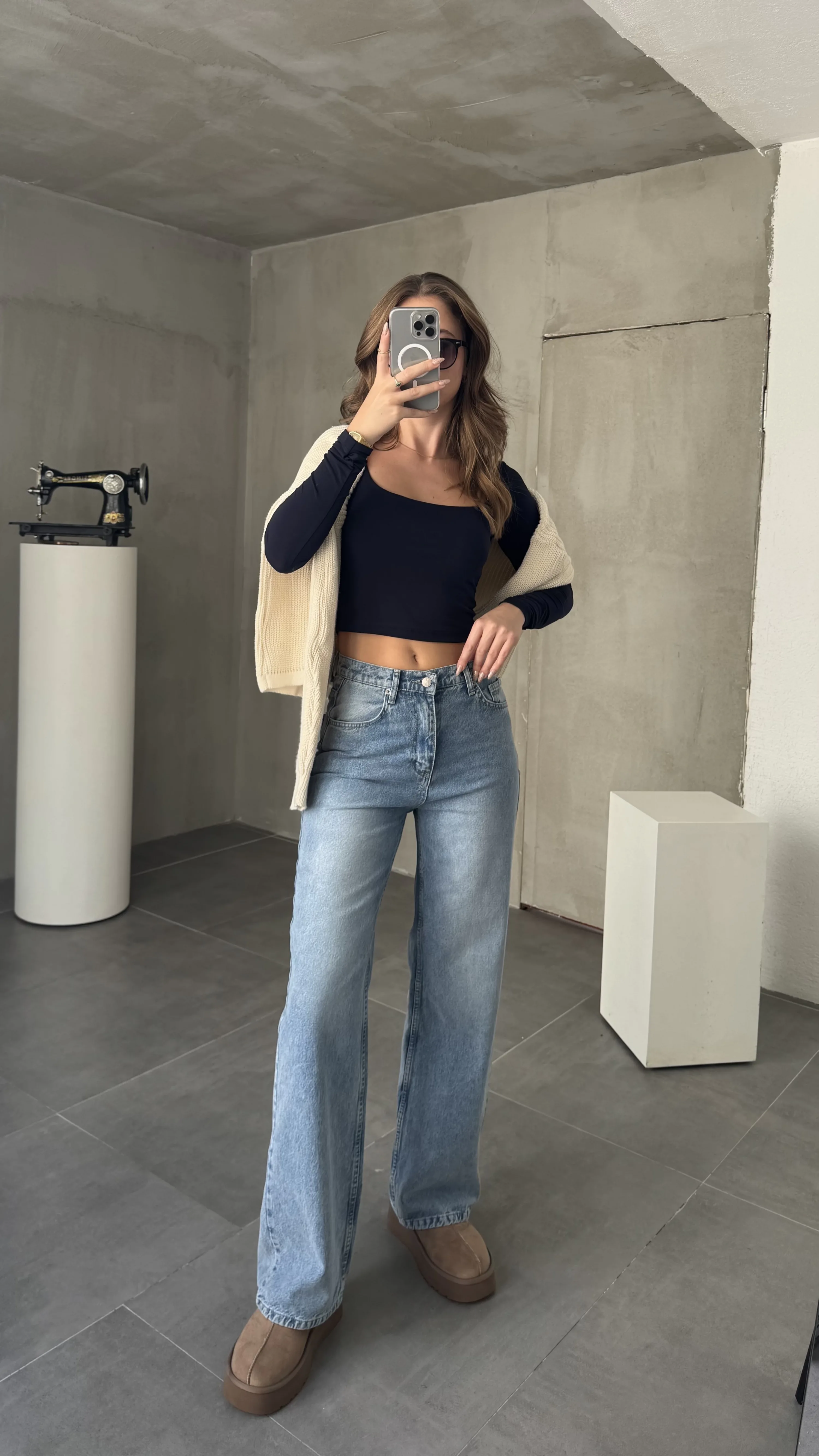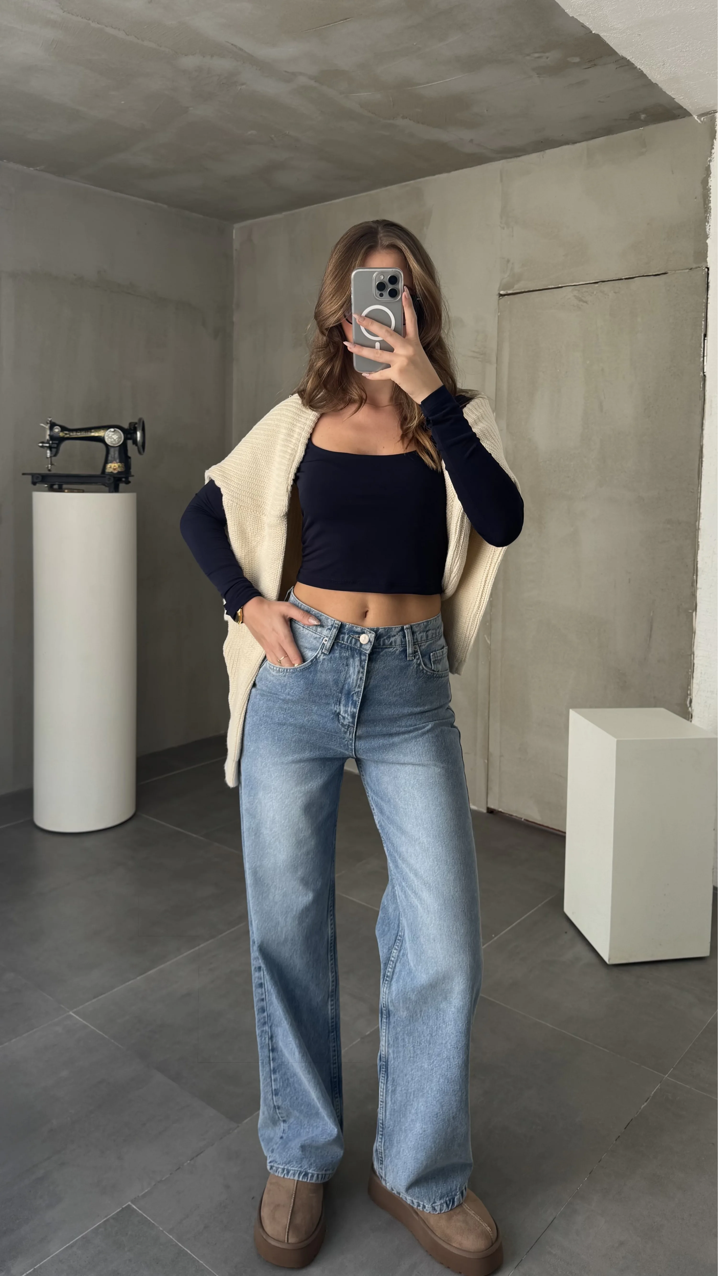 Yıkamalı Baggy Geniş Paça Yüksek Bel Wide Leg Jean Kot Pantolon