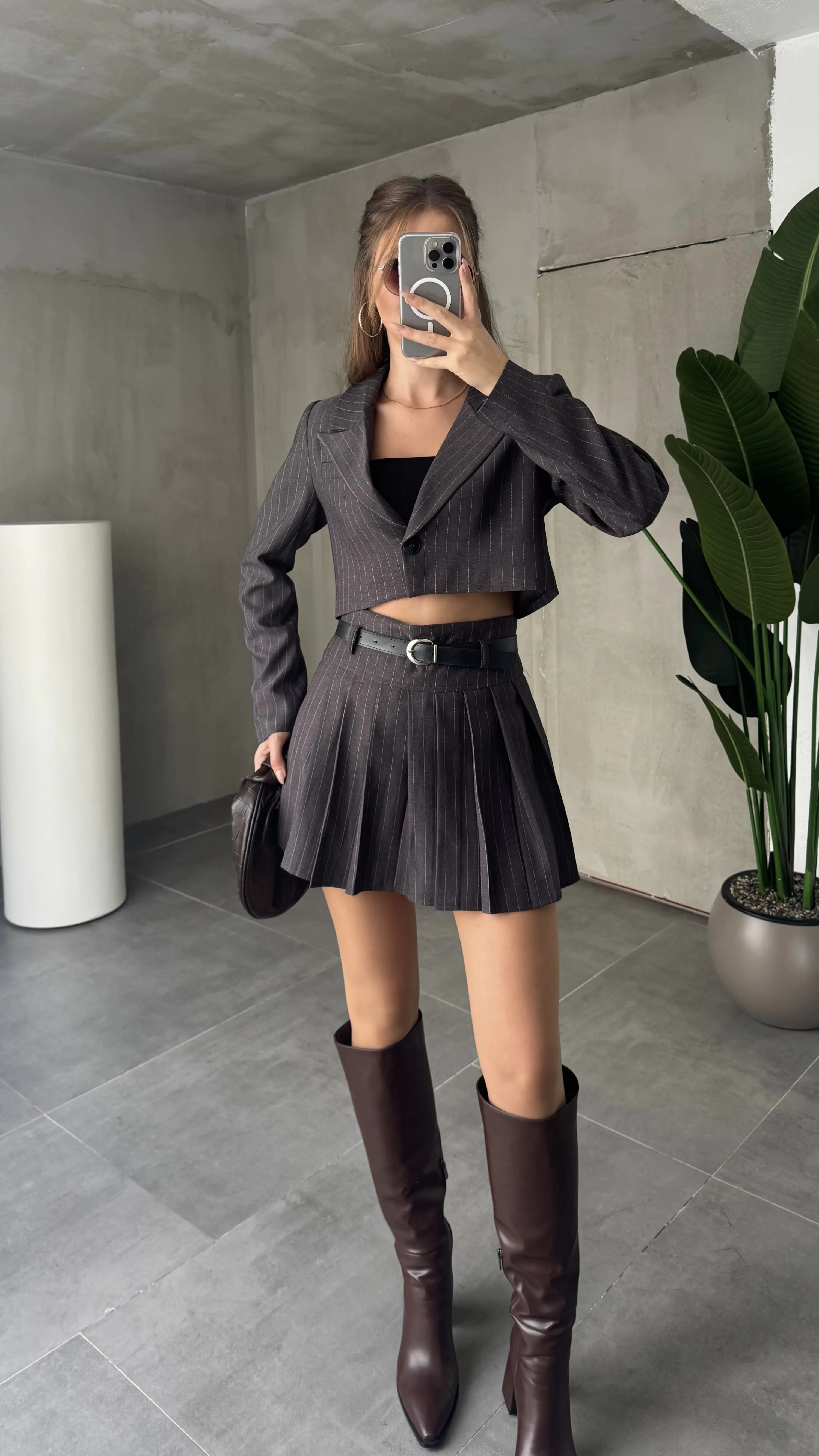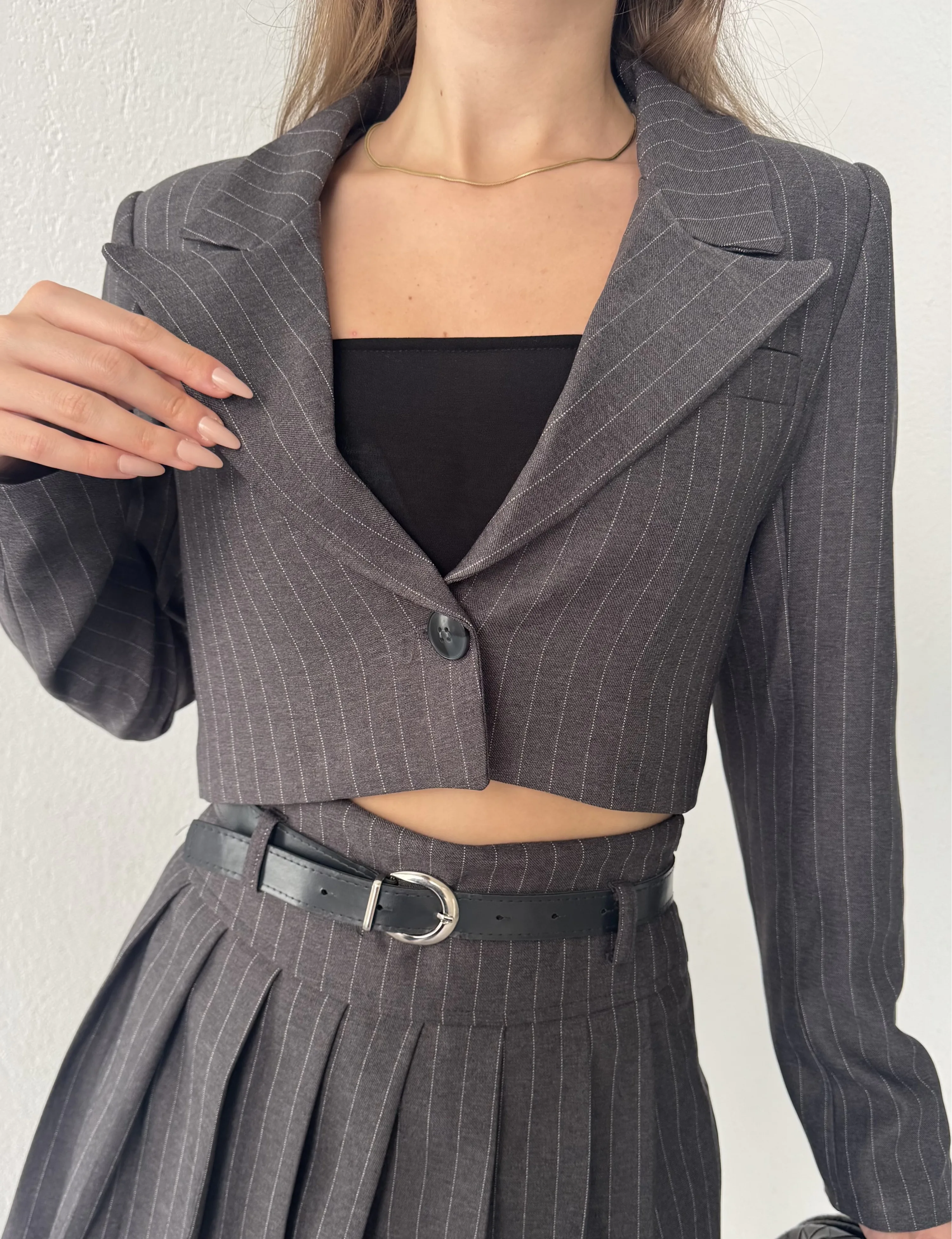 Antrasit Çizgili Crop Ceket Kemerli Astarlı Pileli Etek Takım