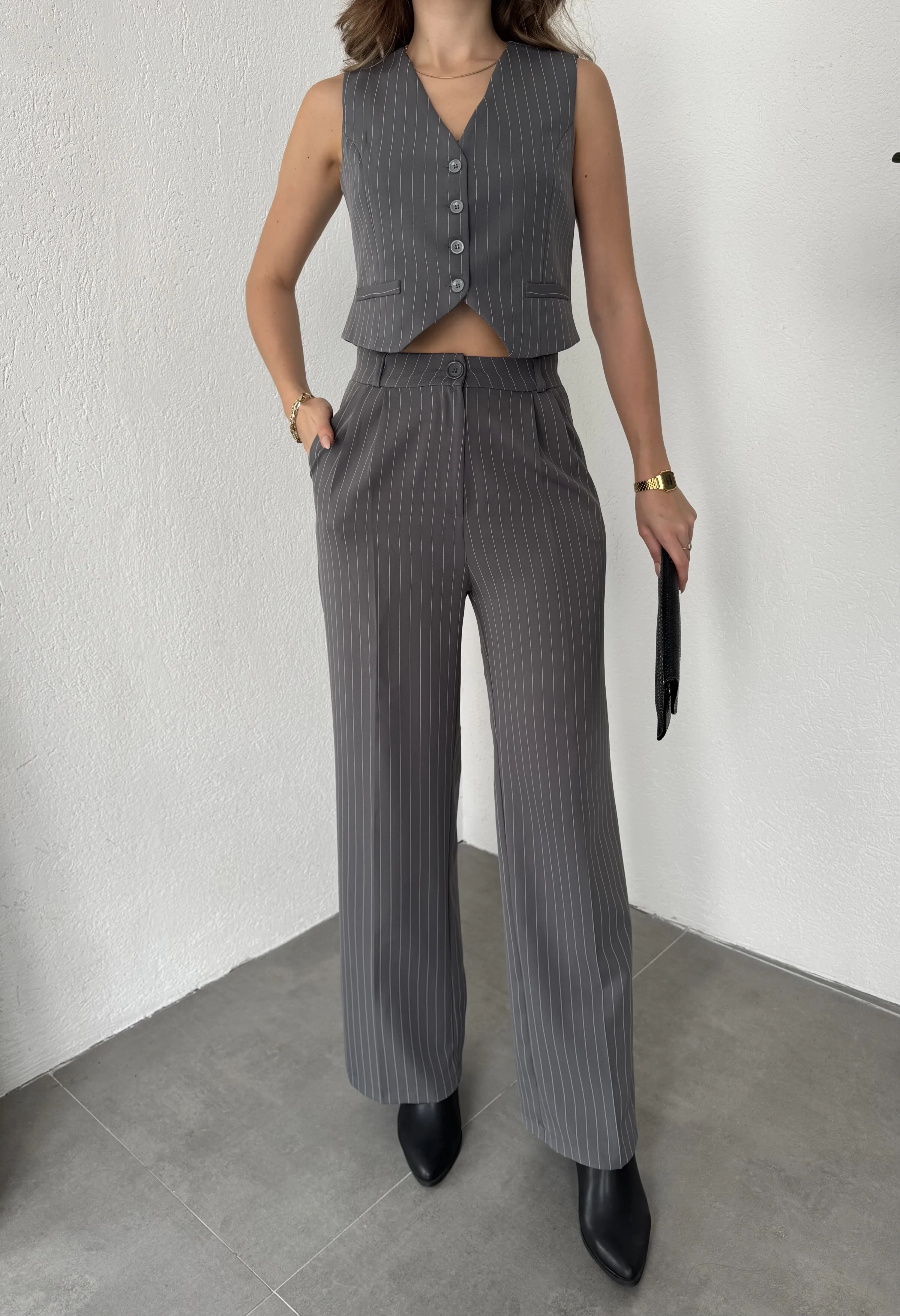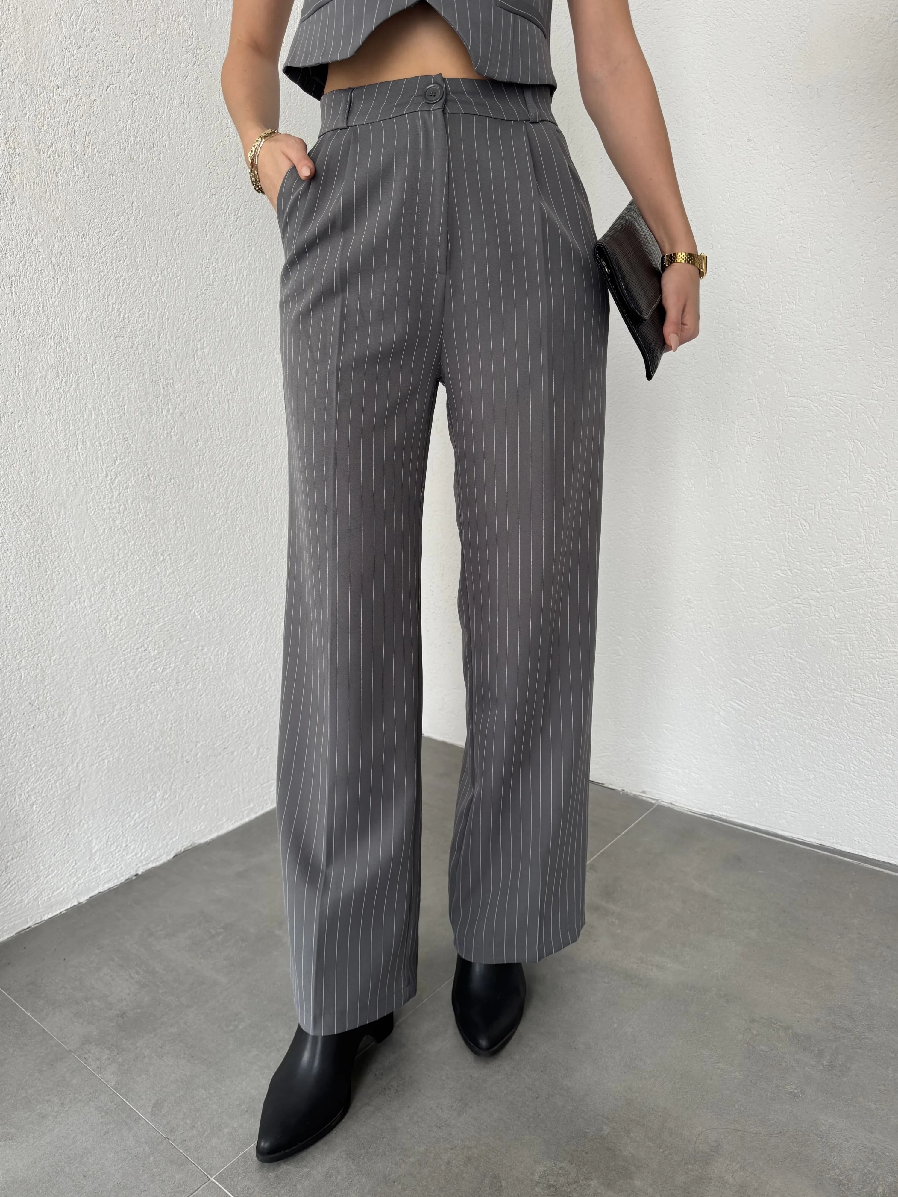 Antrasit Çizgili Pileli Tam Kalıp Bel Oturtmalı Geniş Paça Palazzo Pantolon