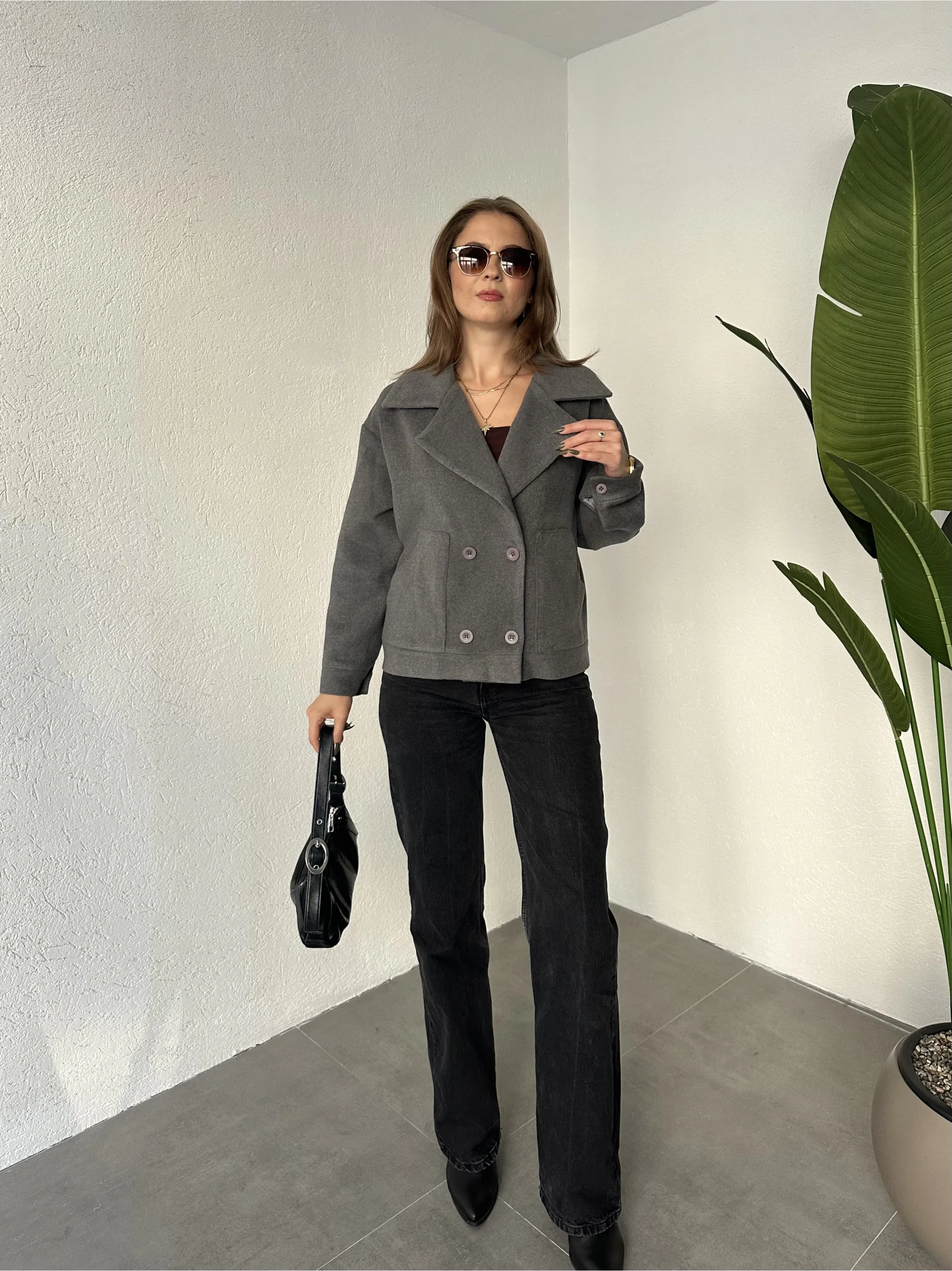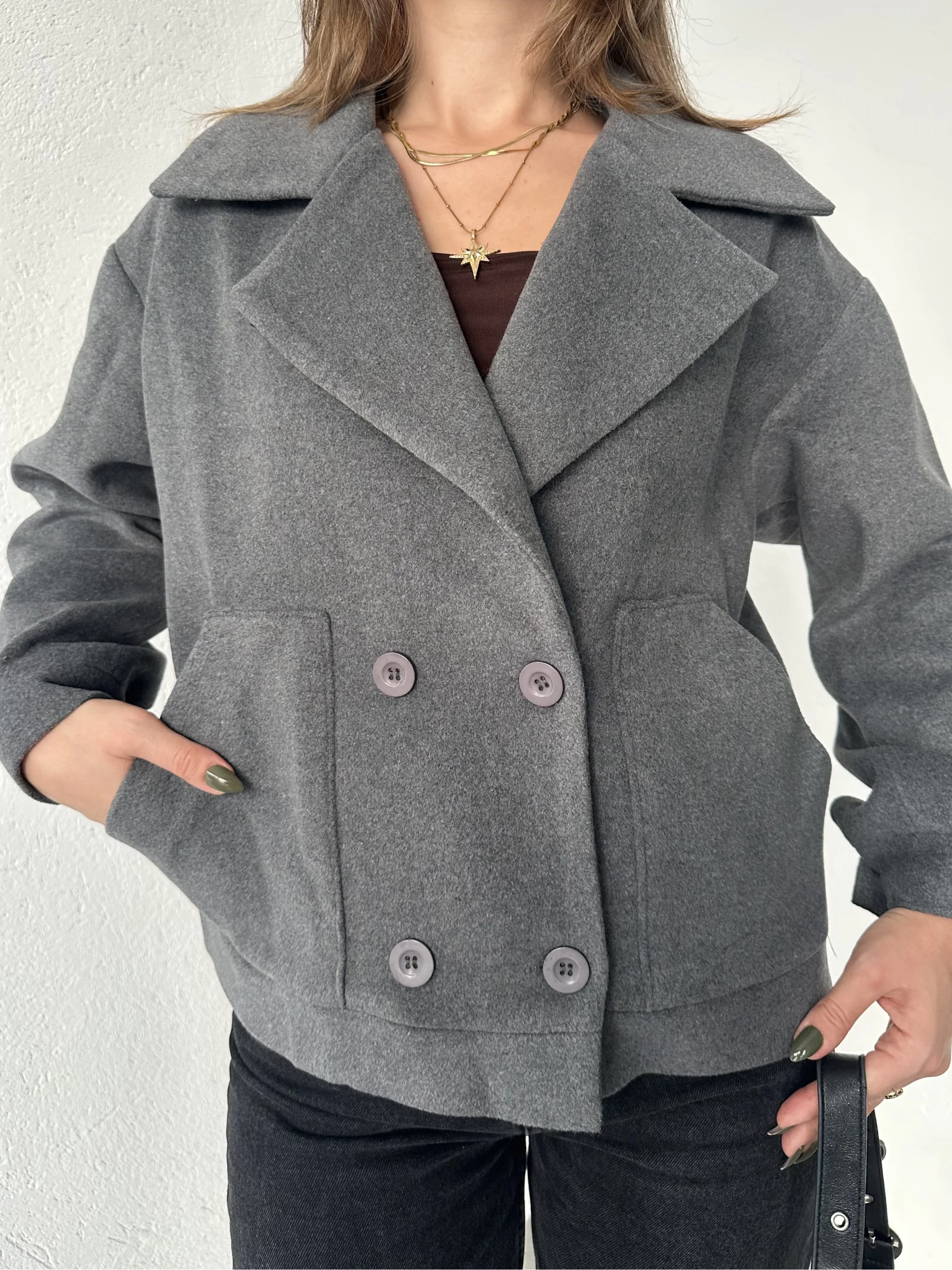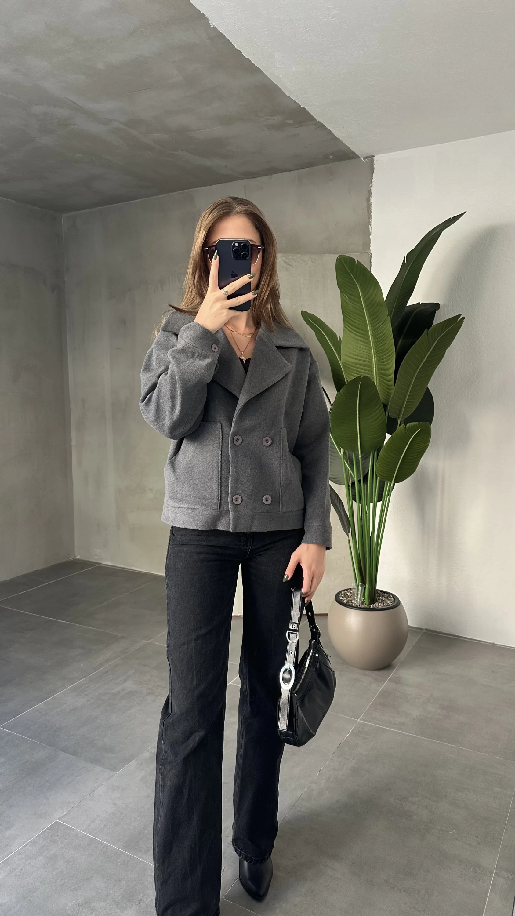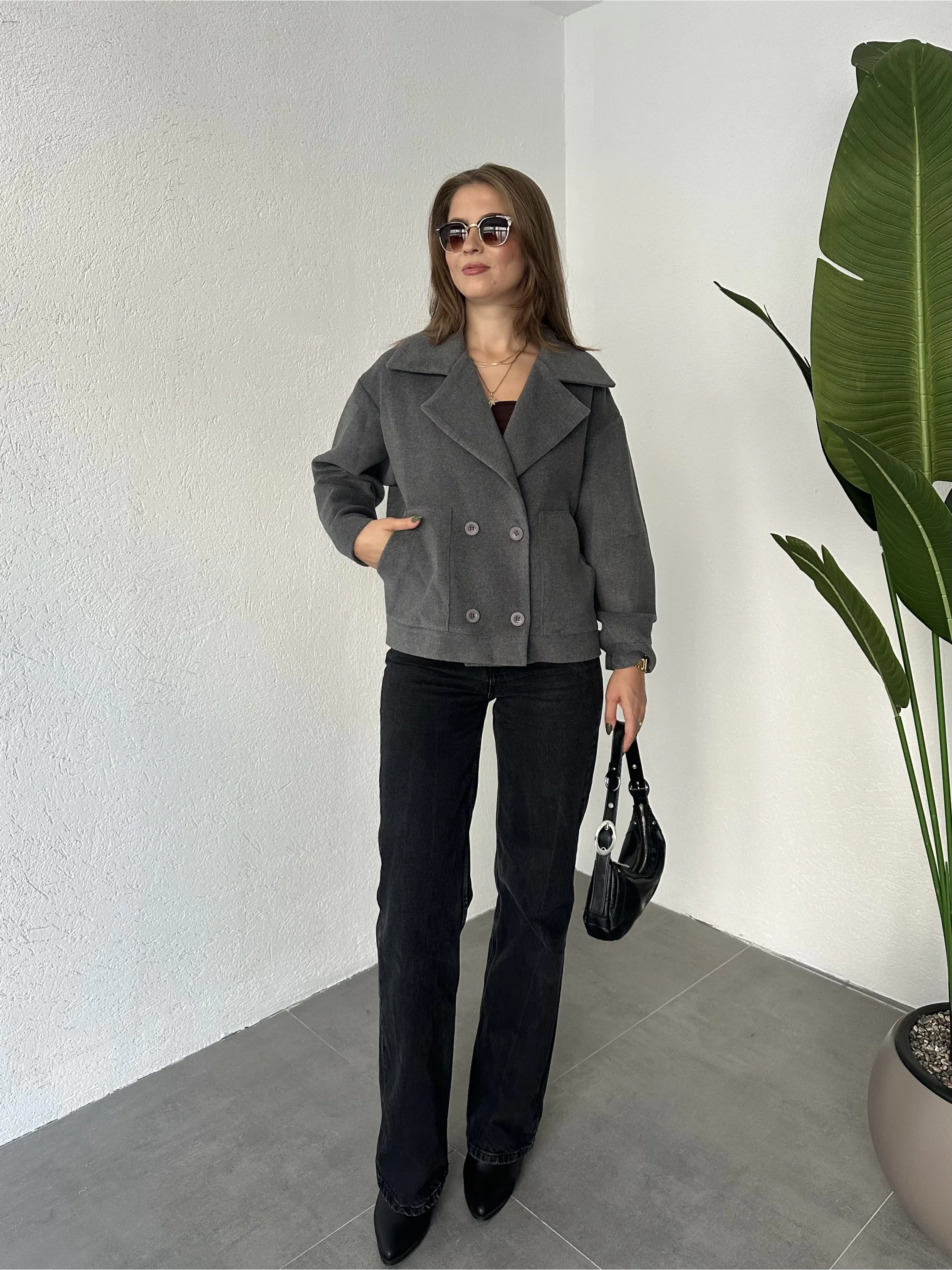Antrasit Kısa Kruvaze Oversize Astarlı Cepli Kaşe Ceket Mont