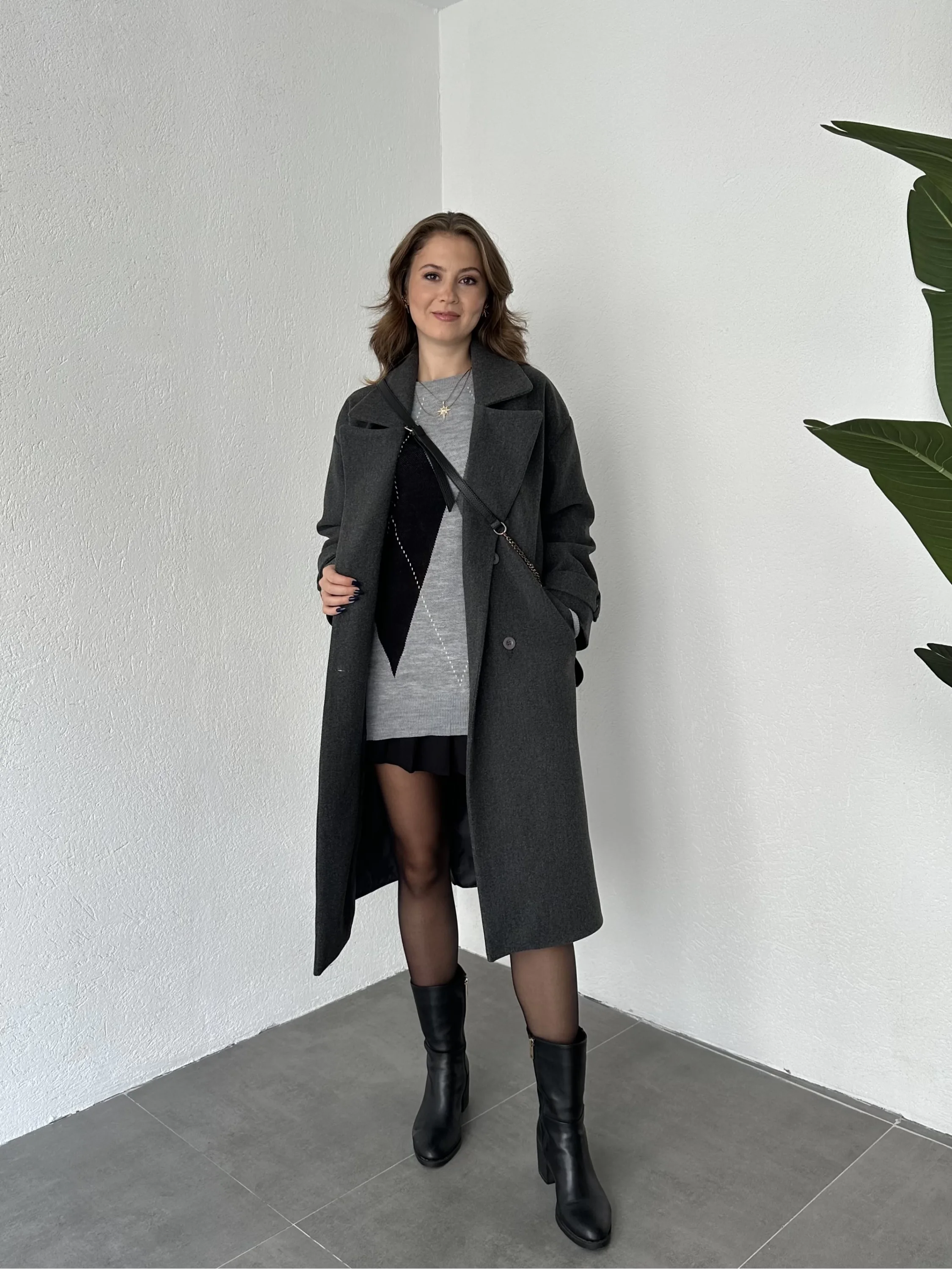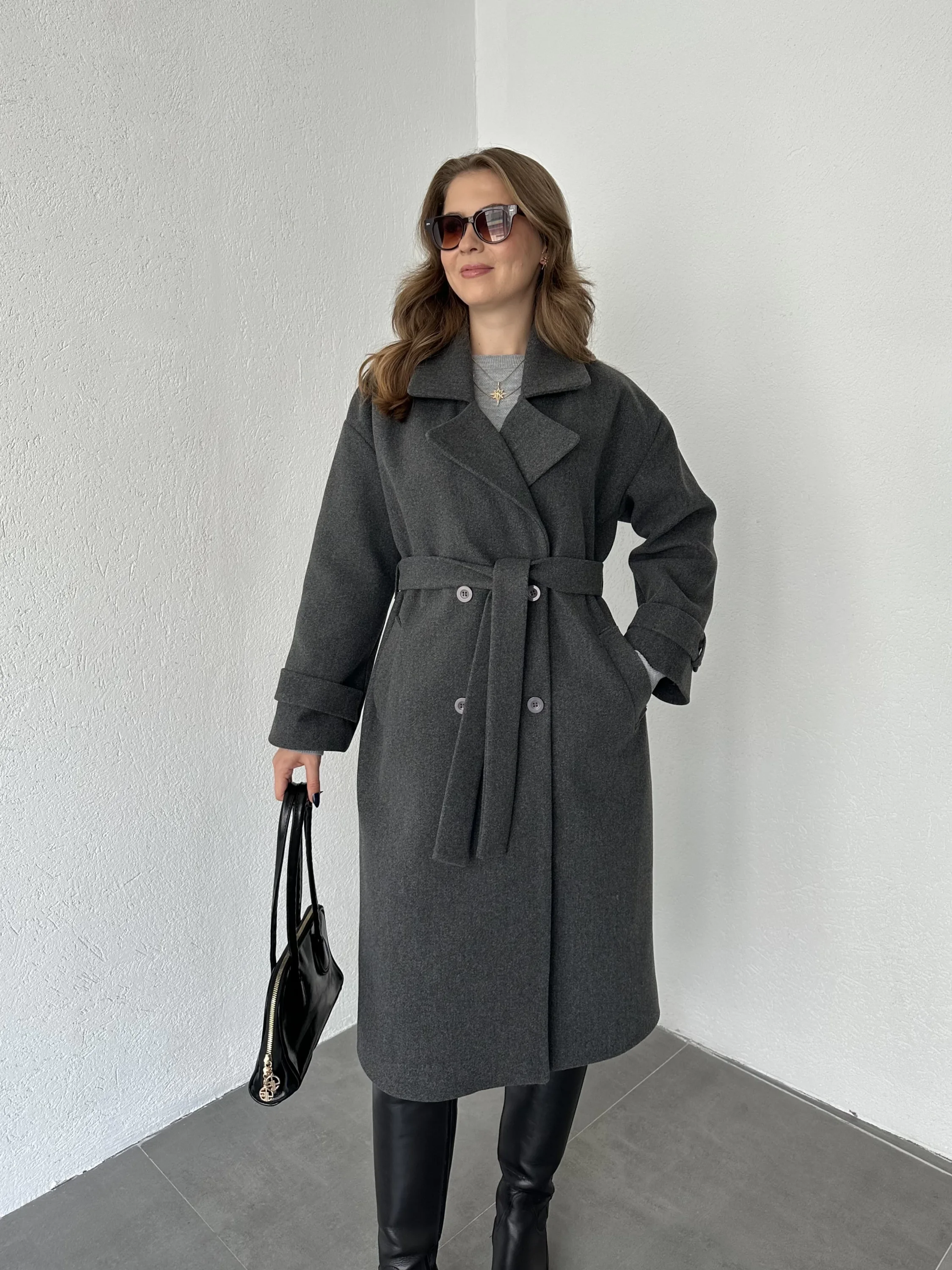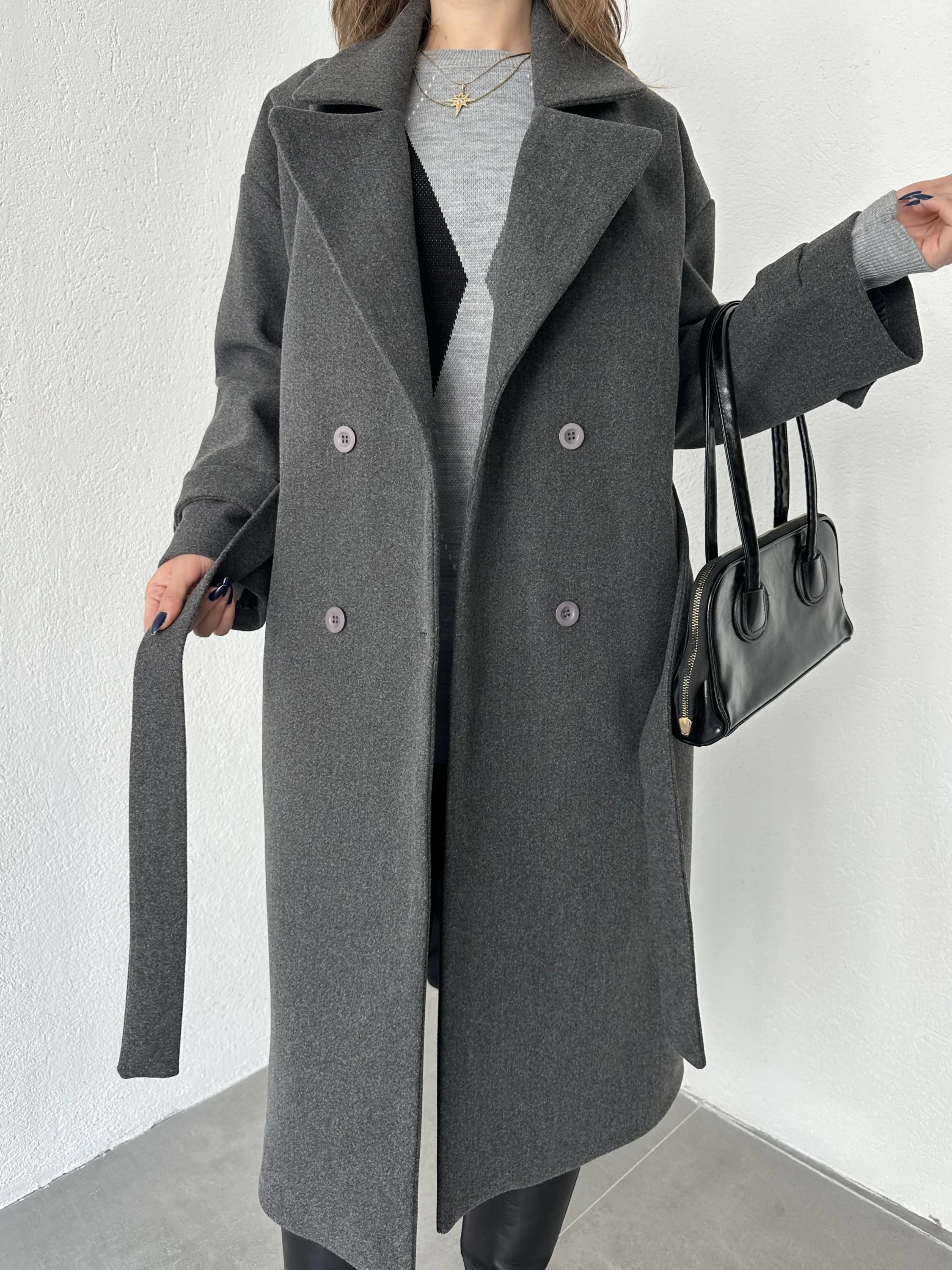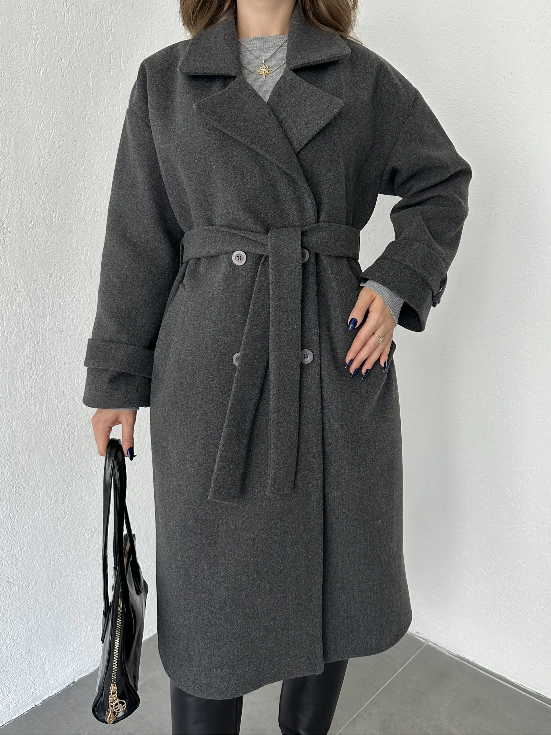 Antrasit Kruvaze Oversize Premium Kalite Kuşaklı Tam Boy Uzun Kaşe Mont