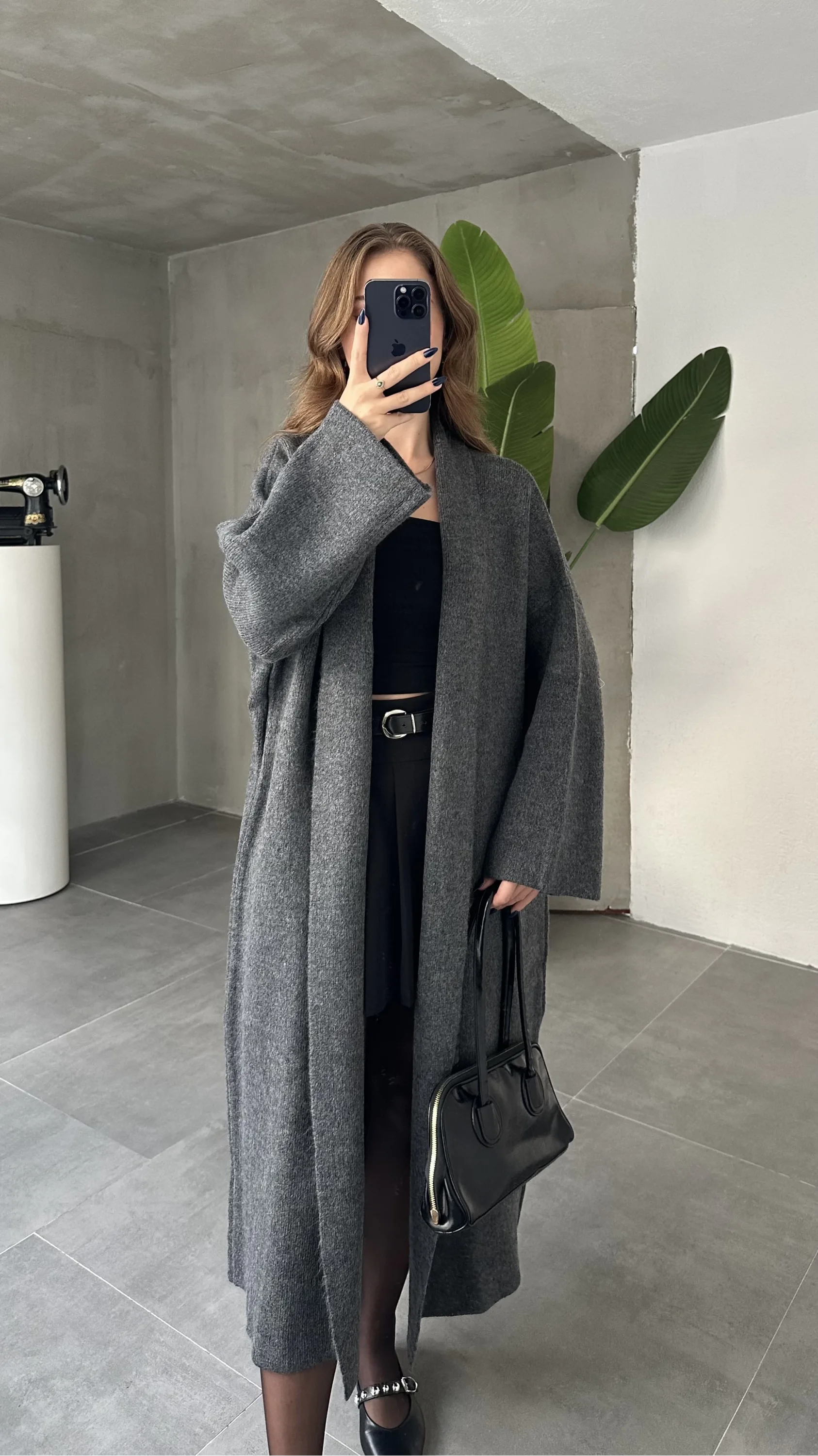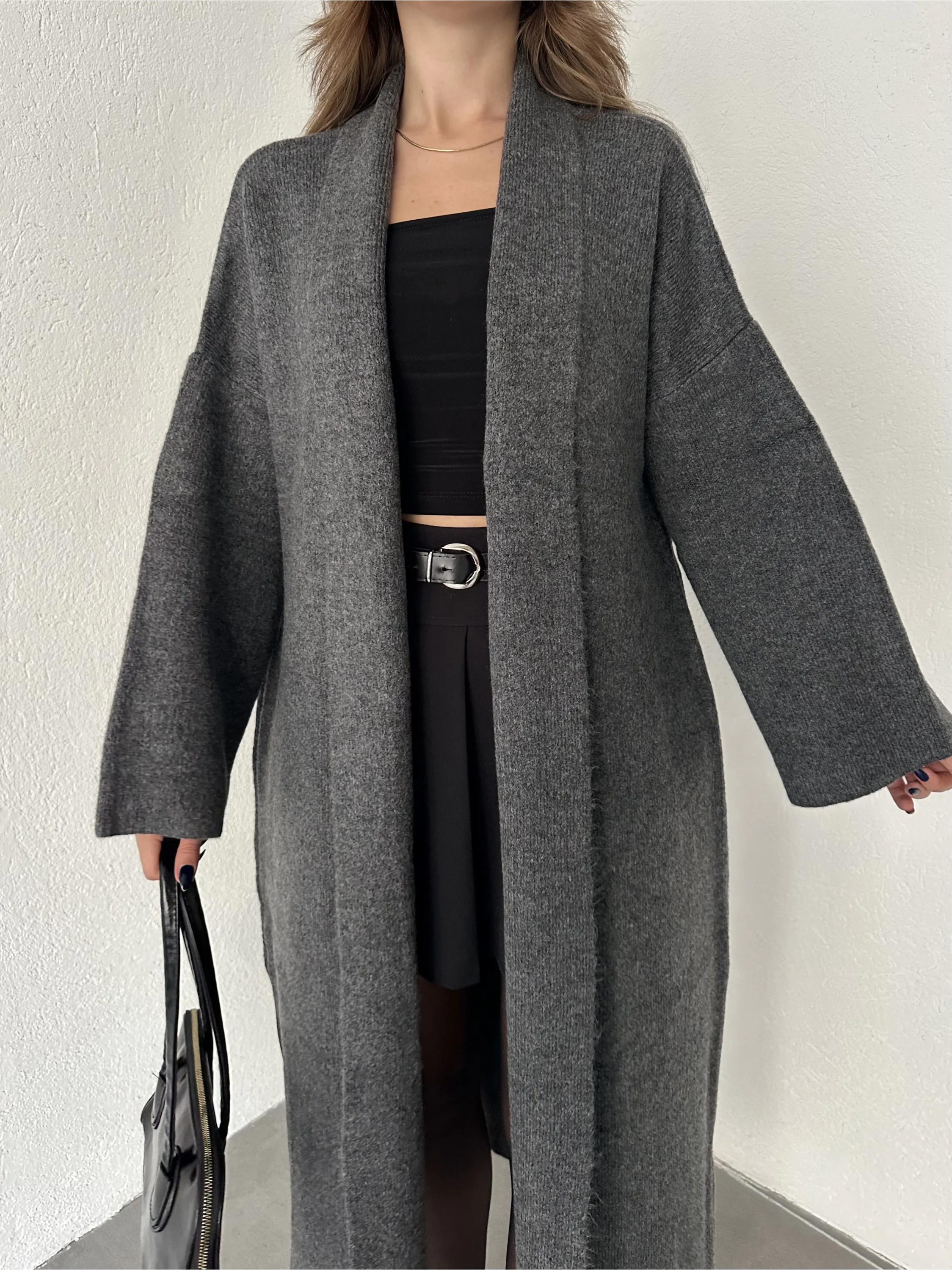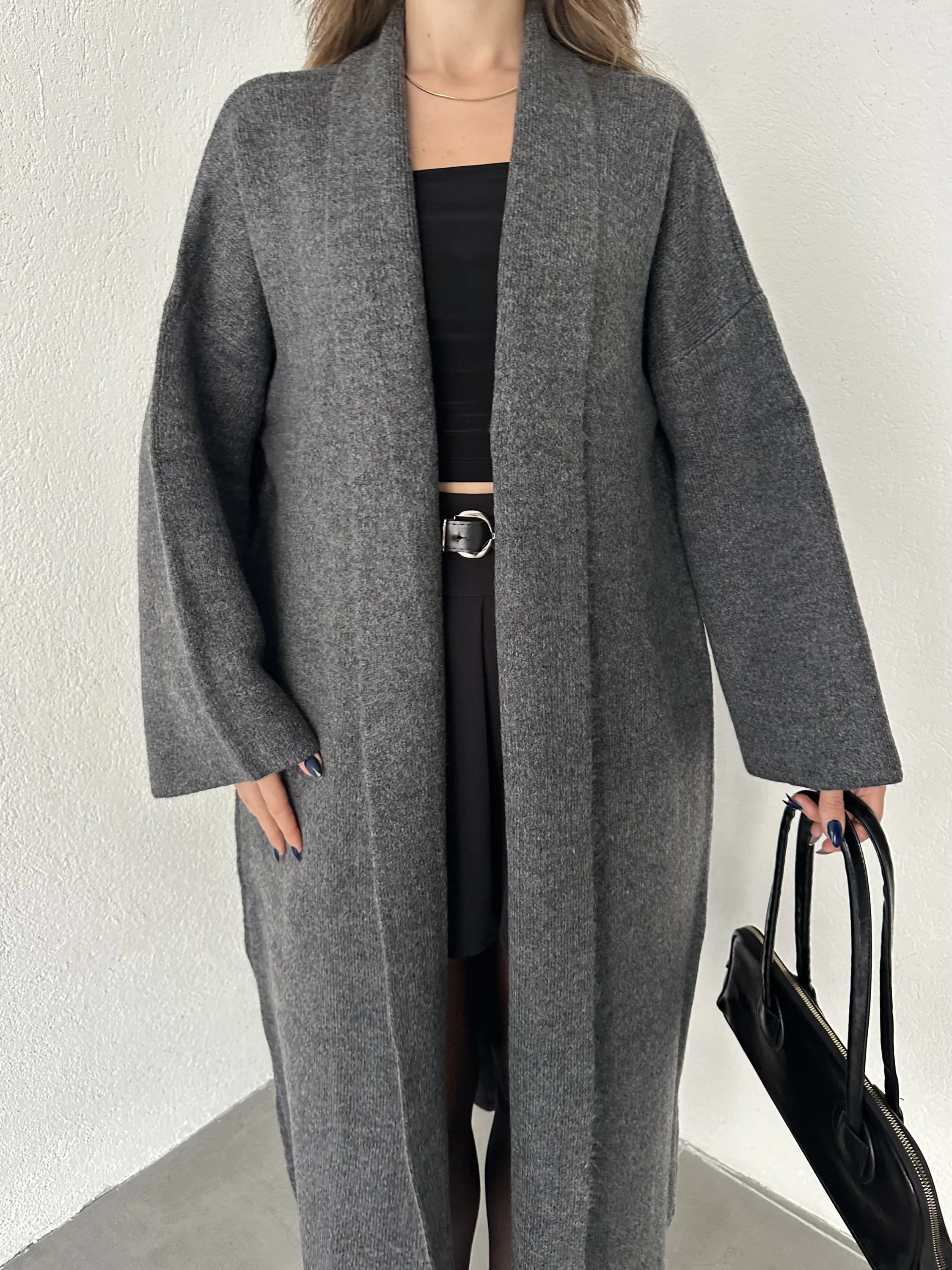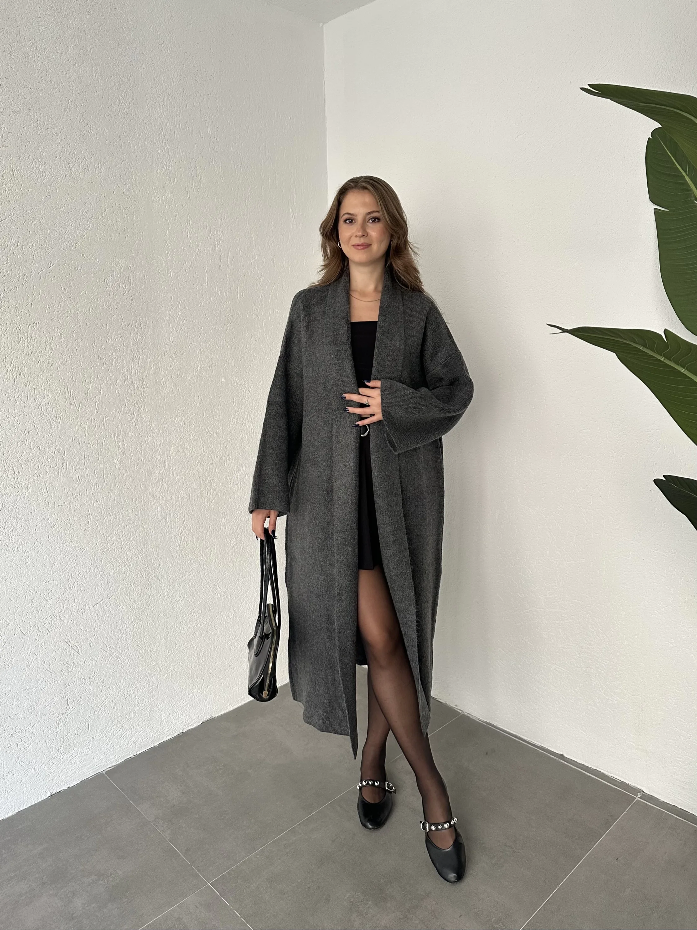 Antrasit Şal Yaka Tam Boy Uzun Salaş Oversize Triko Hırka