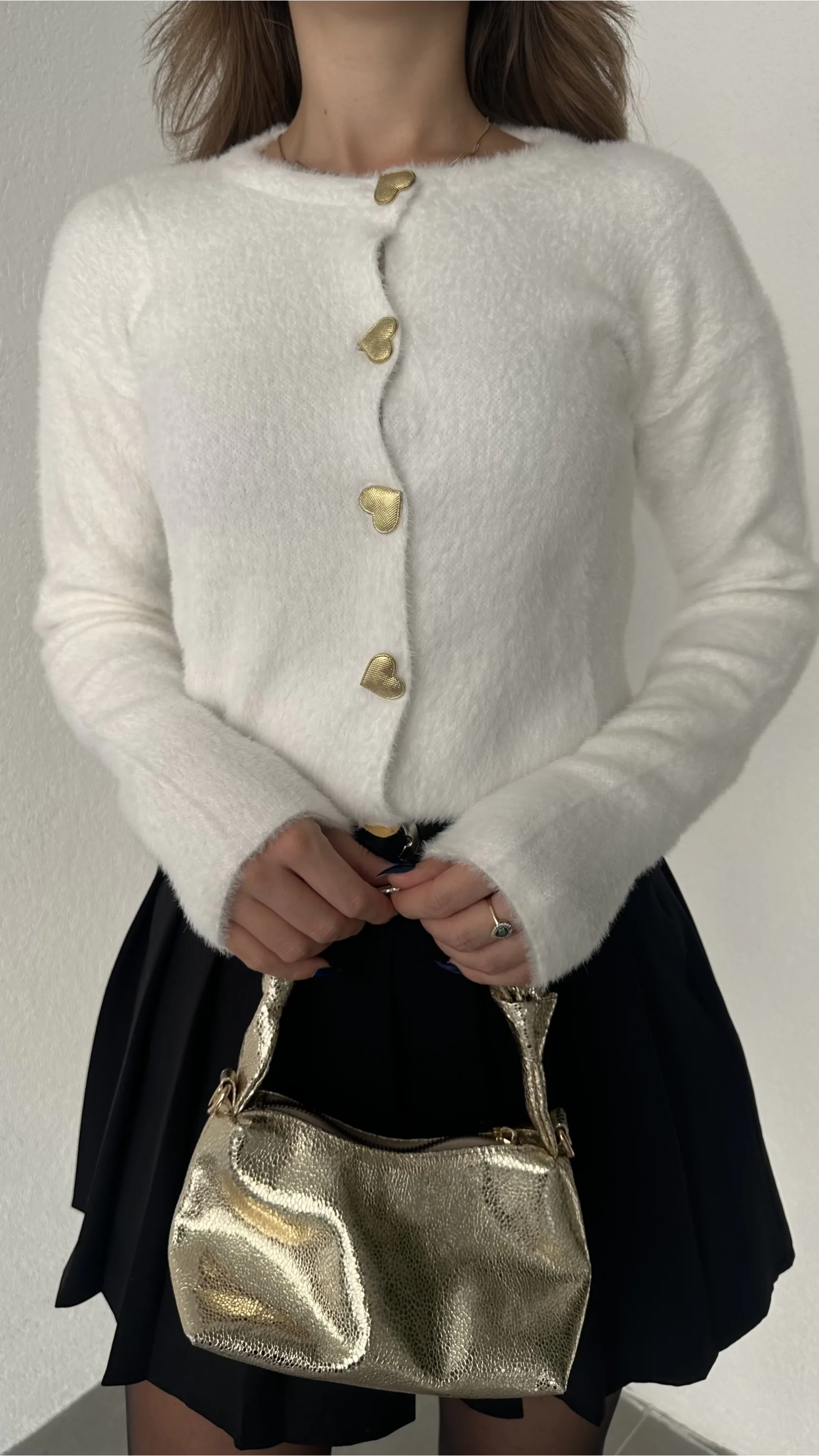 Beyaz Bisiklet Yaka Kalpli Düğme Detaylı Yumoş Triko Hırka
