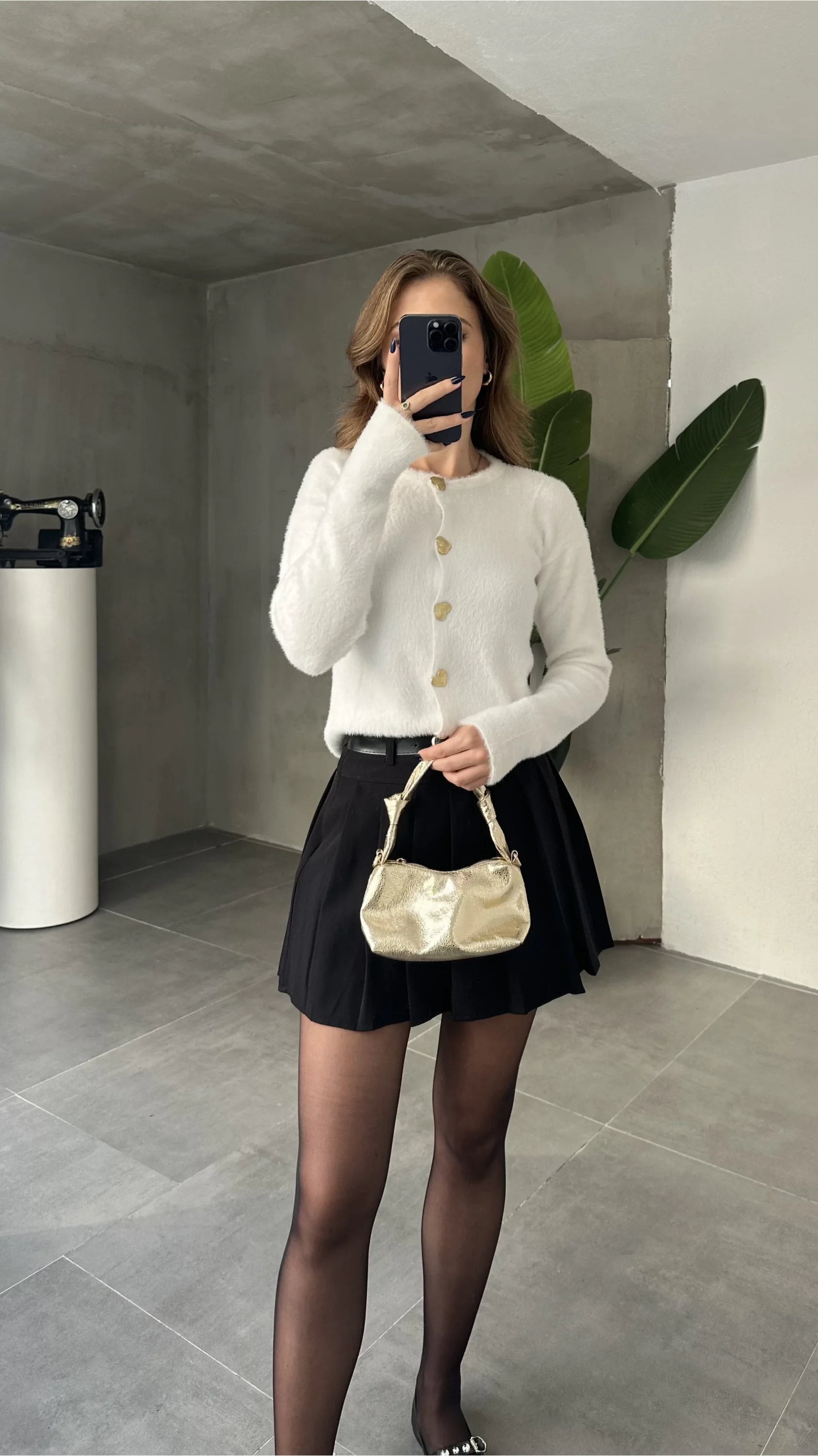 Beyaz V Yaka Fiyonk Gold Düğme Detaylı Yumoş Triko Hırka