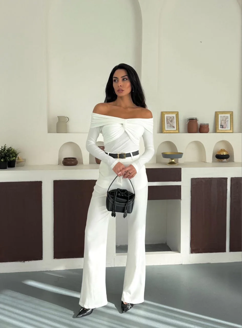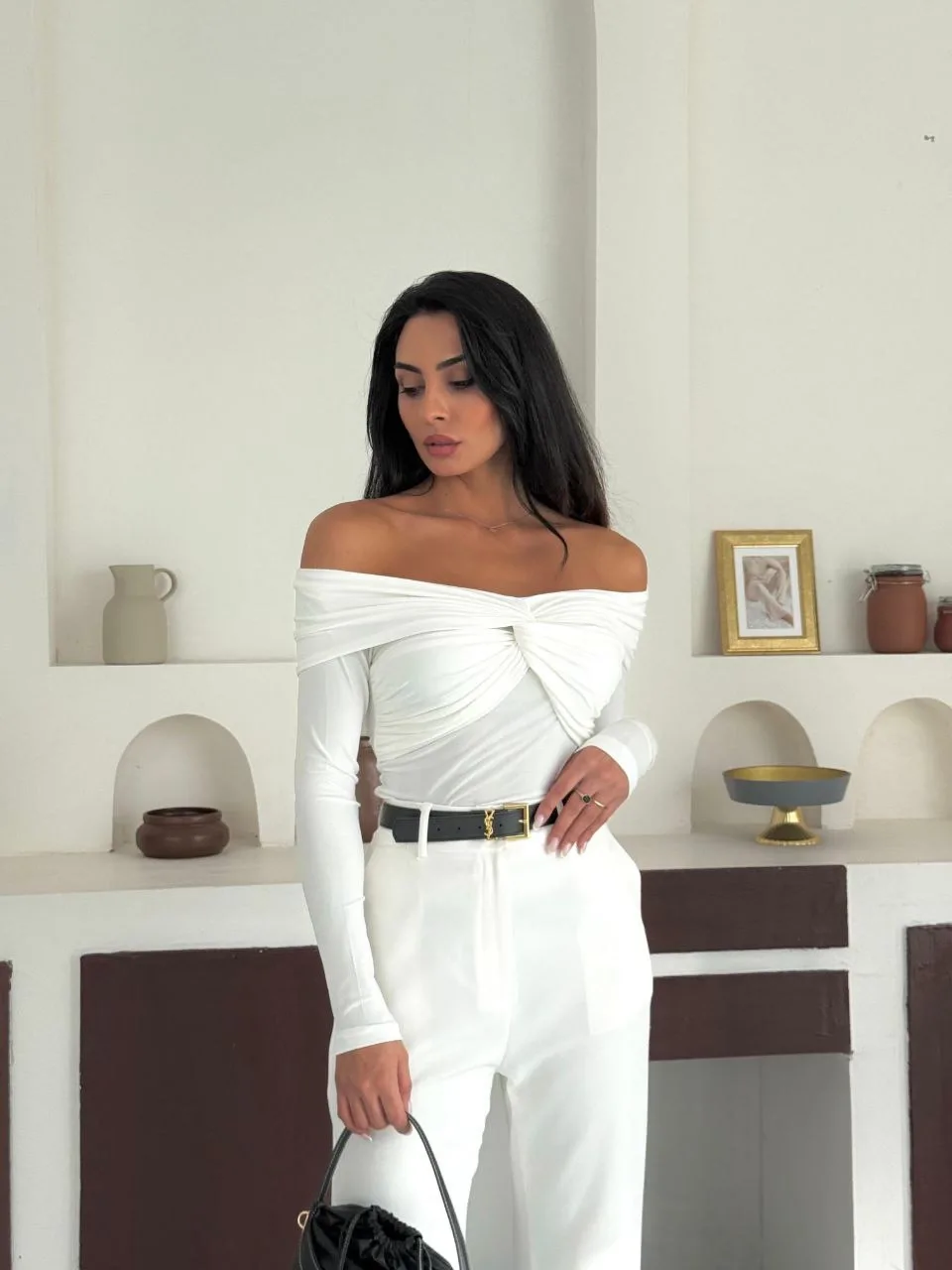 Beyaz Madonna Yaka Düğümlü Sandy Bluz