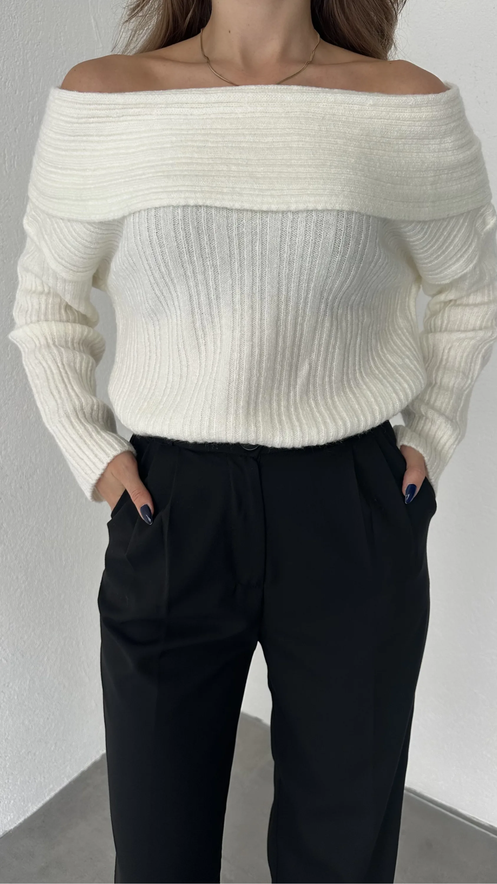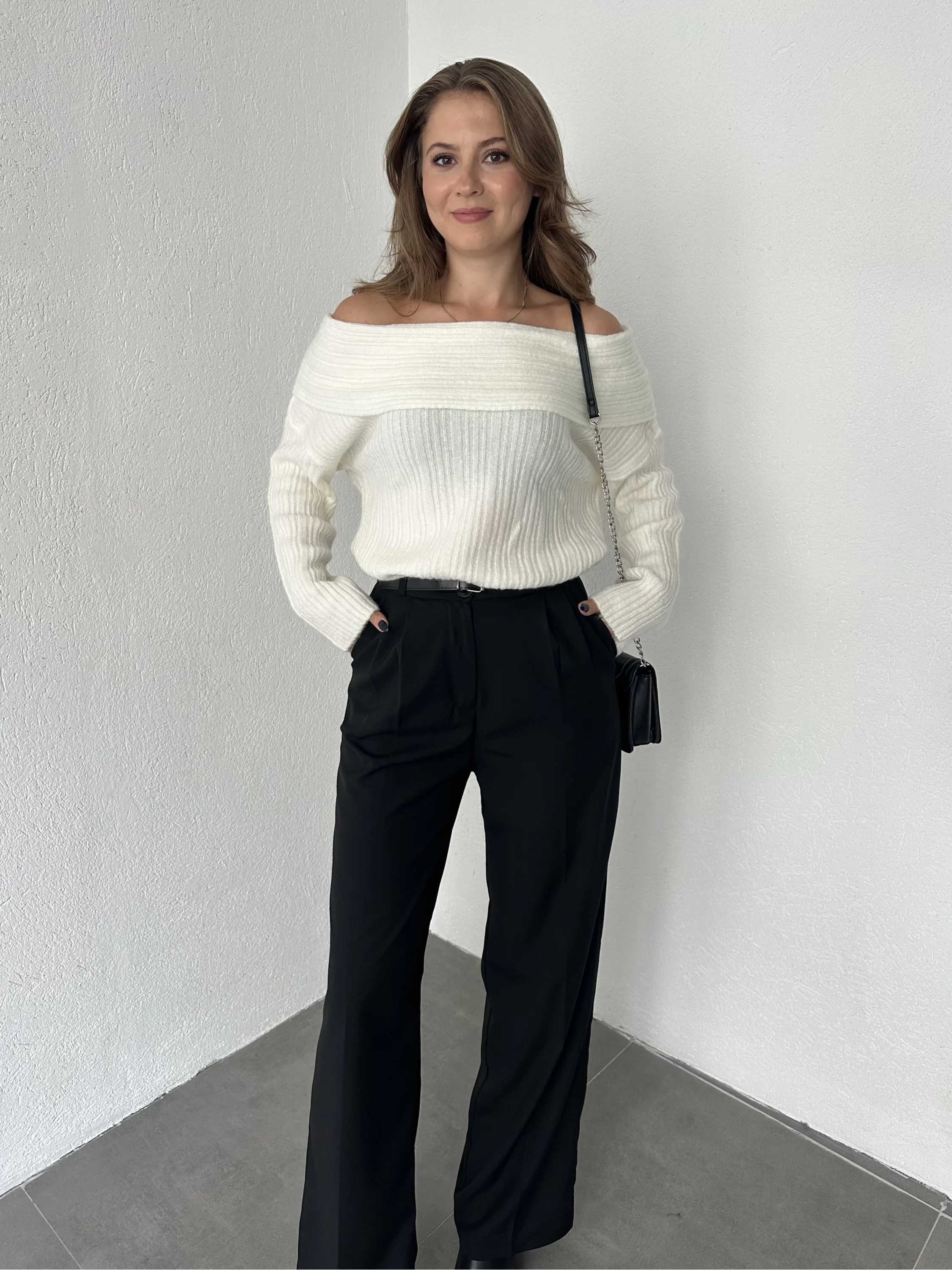 Beyaz Madonna Yaka Yumoş Triko Kazak