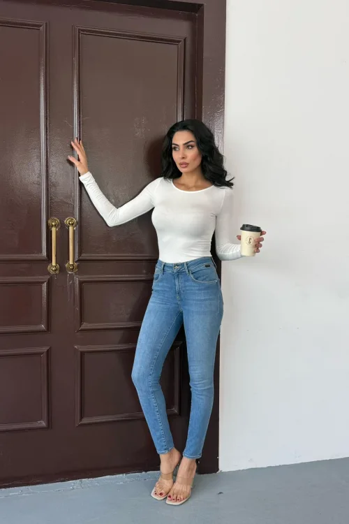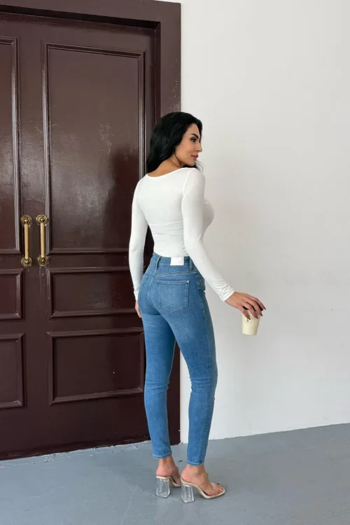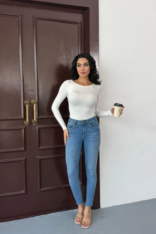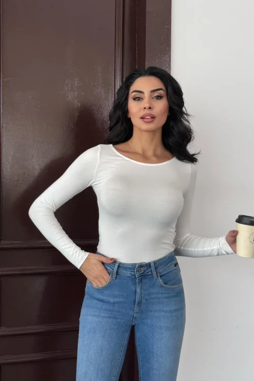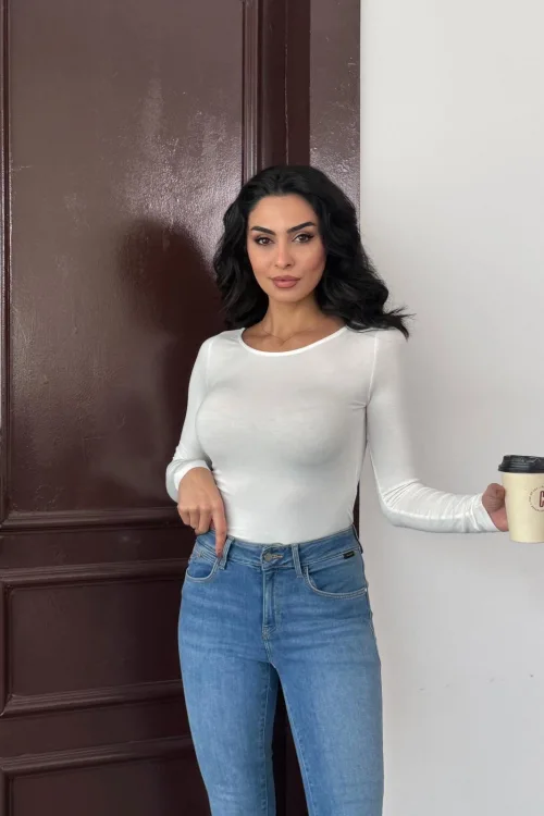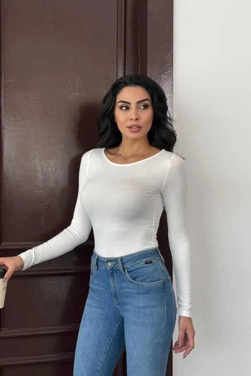 Kadın Açık Yaka Uzun Kollu Basic Body Bluz Beyaz