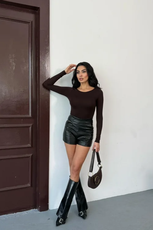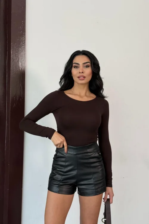 Kadın Açık Yaka Uzun Kollu Basic Body Bluz Kahverengi