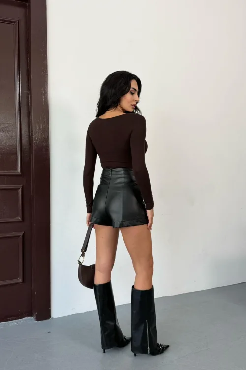 Kahverengi Kare Yaka Parmak Geçirmeli Uzun Kol Candy Body Bluz