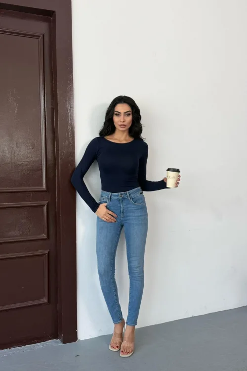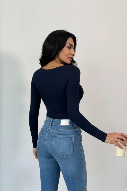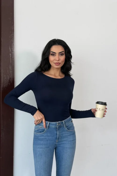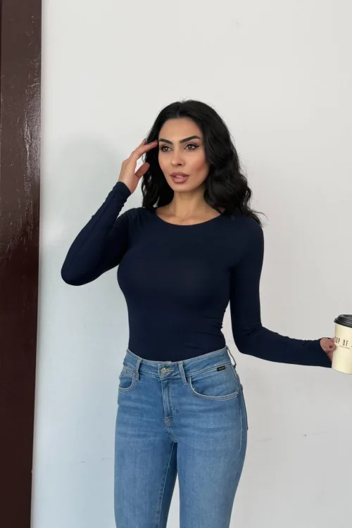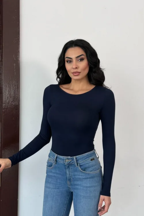 Kadın Açık Yaka Uzun Kollu Basic Body Bluz Lacivert
