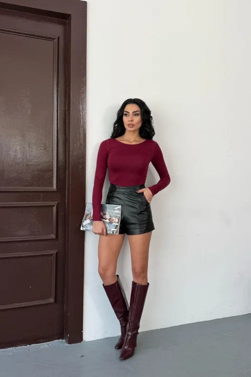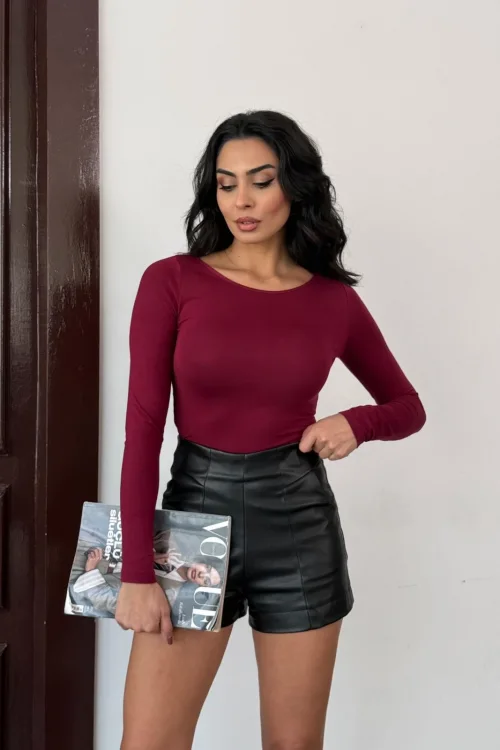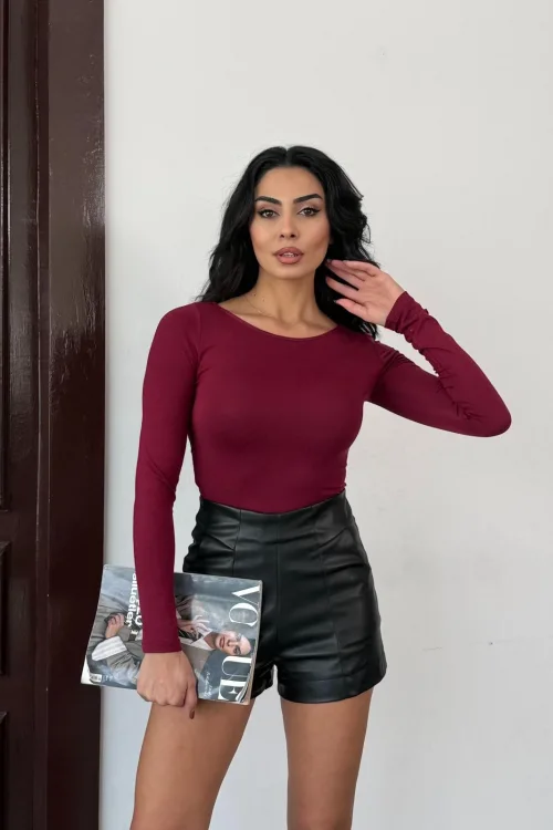 Kadın Açık Yaka Uzun Kollu Basic Body Bluz Bordo