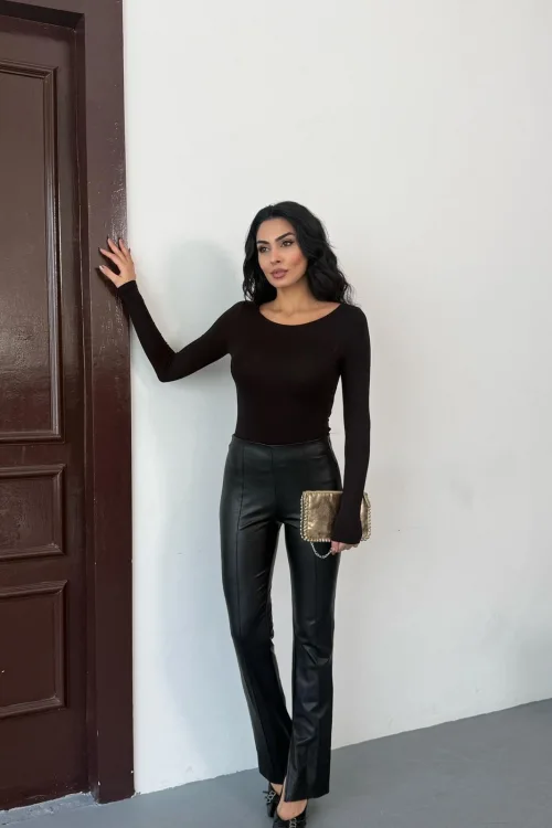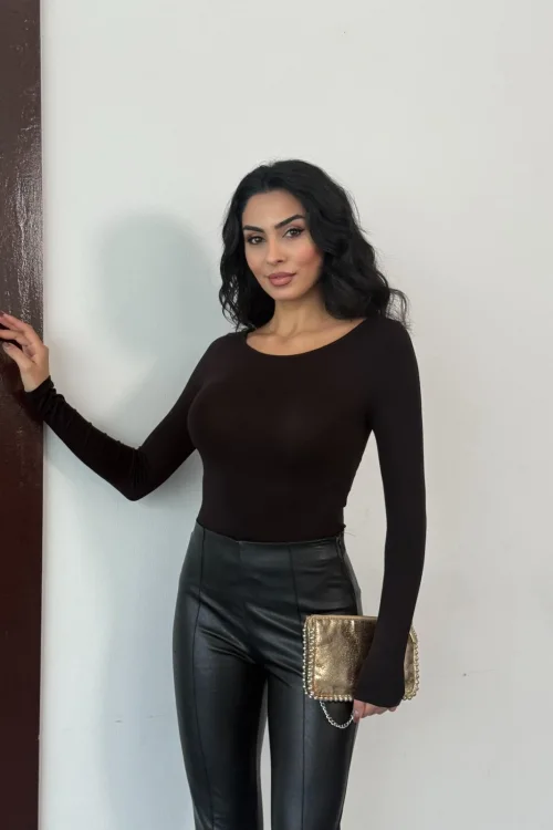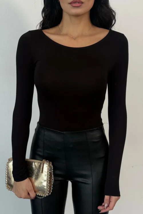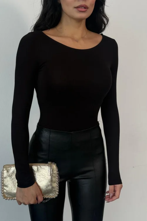 Kadın Açık Yaka Uzun Kollu Basic Body Bluz Siyah