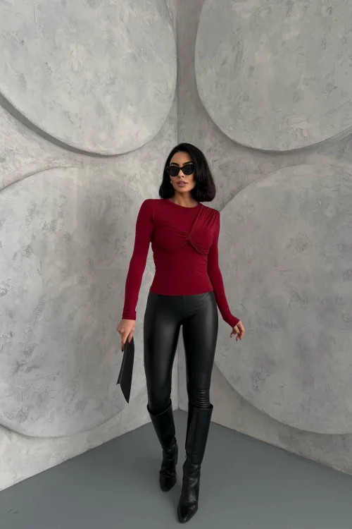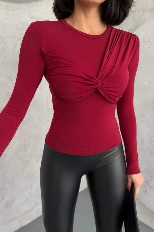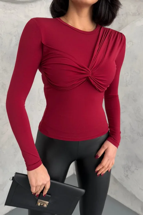 Bordo Önü Çapraz Düğümlü Büzgülü Body Bluz