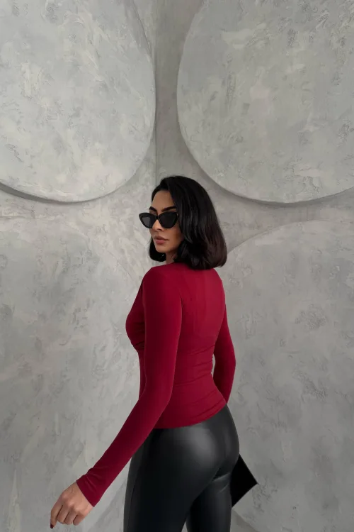 Bordo Burgu Detaylı Dekolteli Parmak Geçirmeli Body Bluz