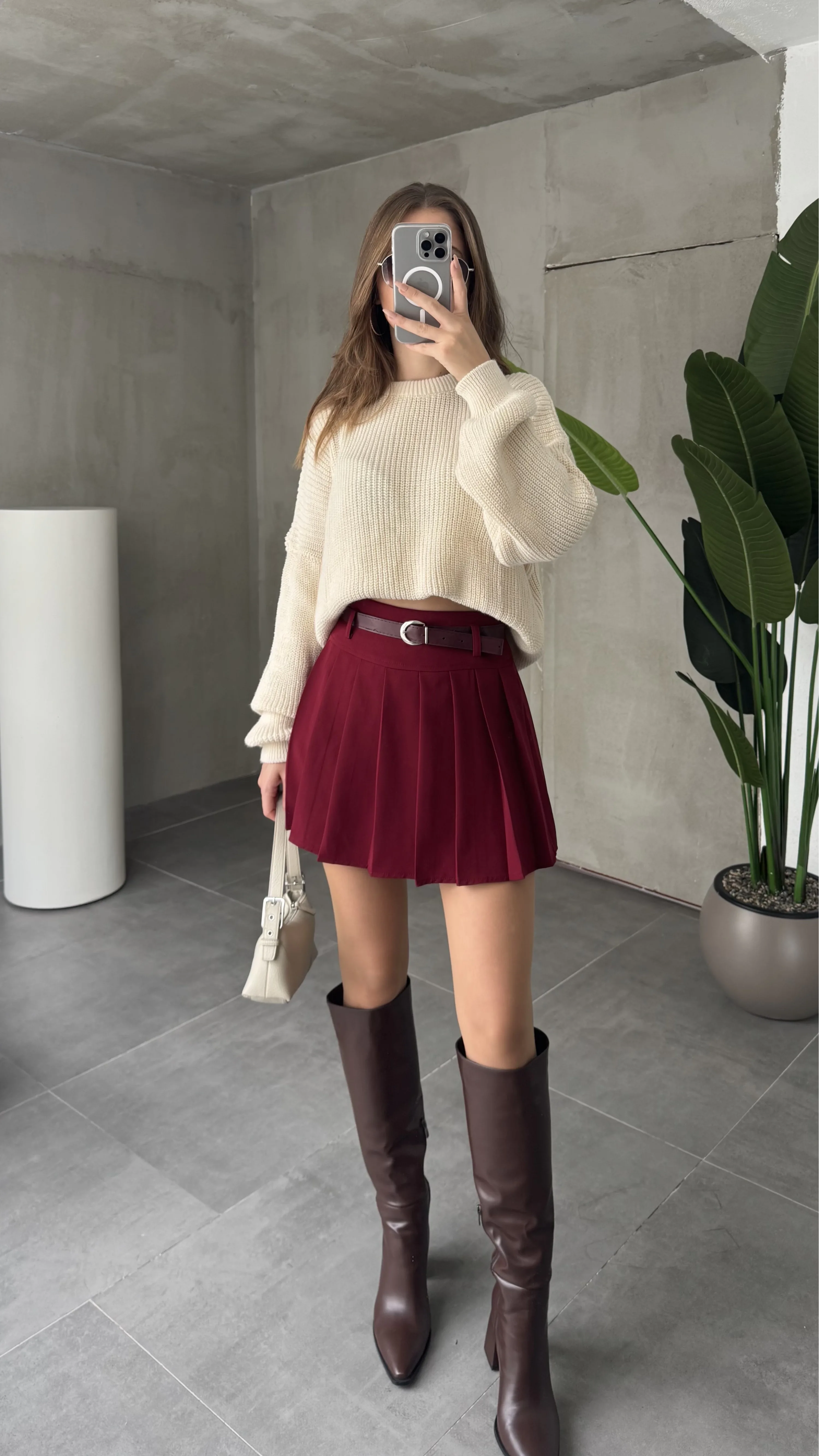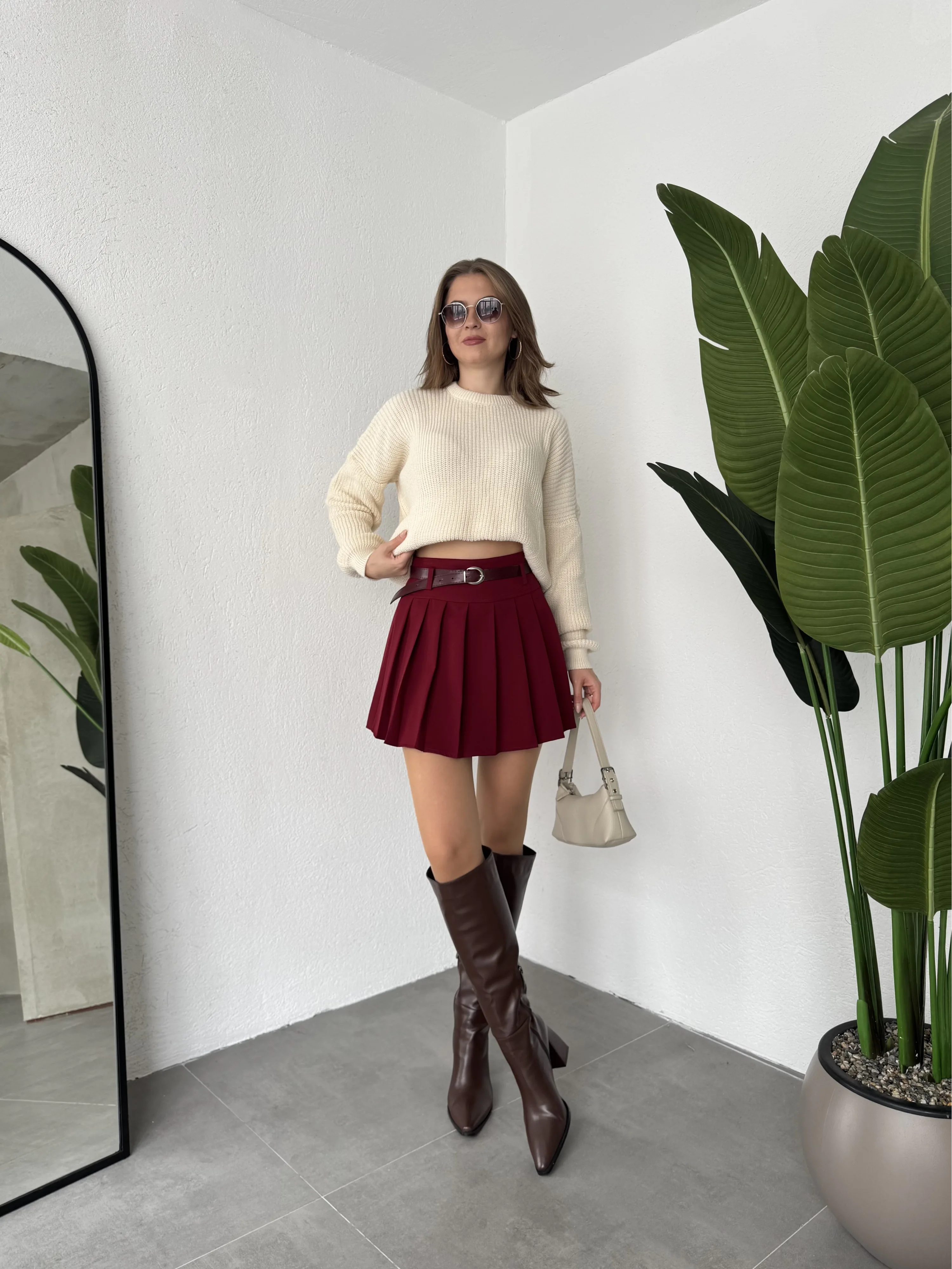 Bordo Astarlı Şortlu Kemerli Pileli Kışlık Mini Etek