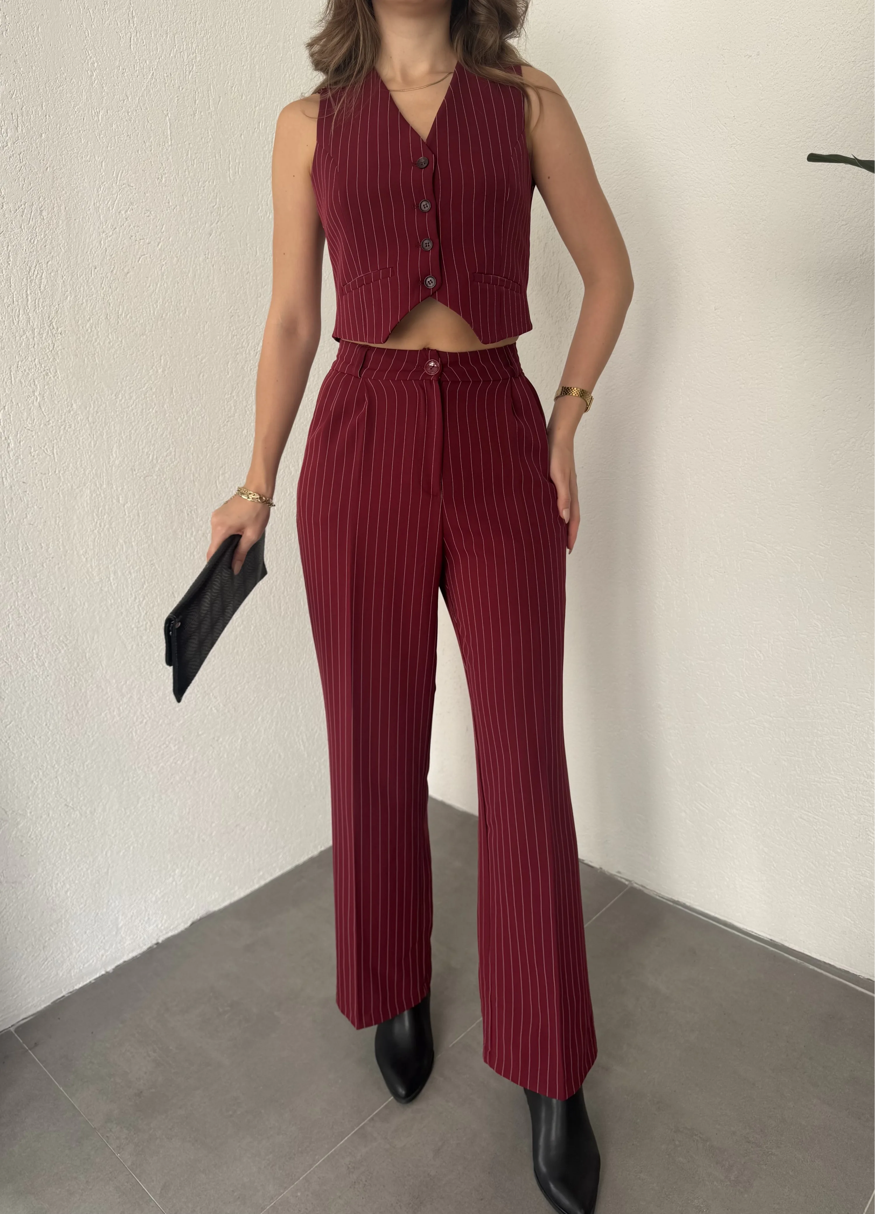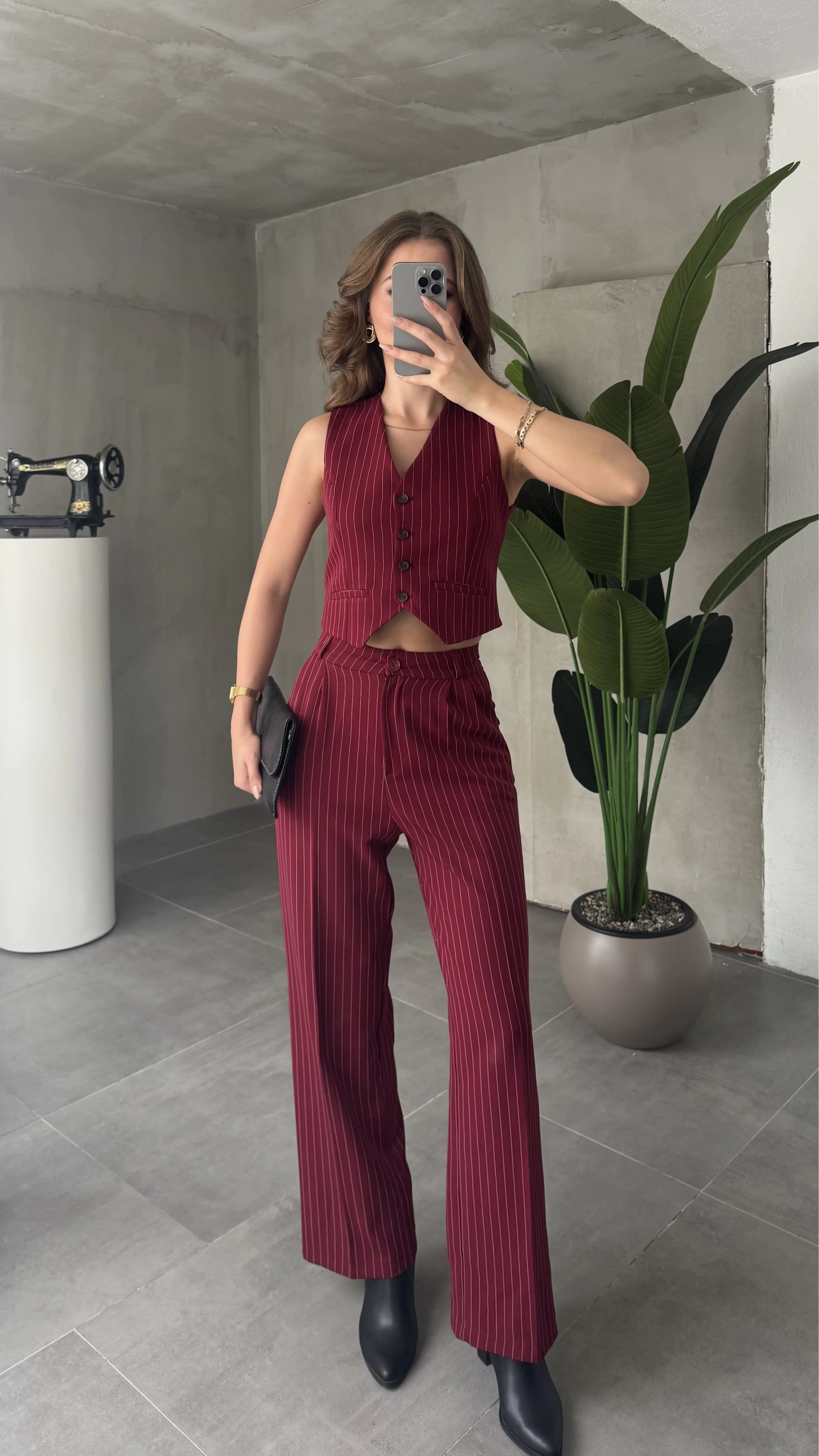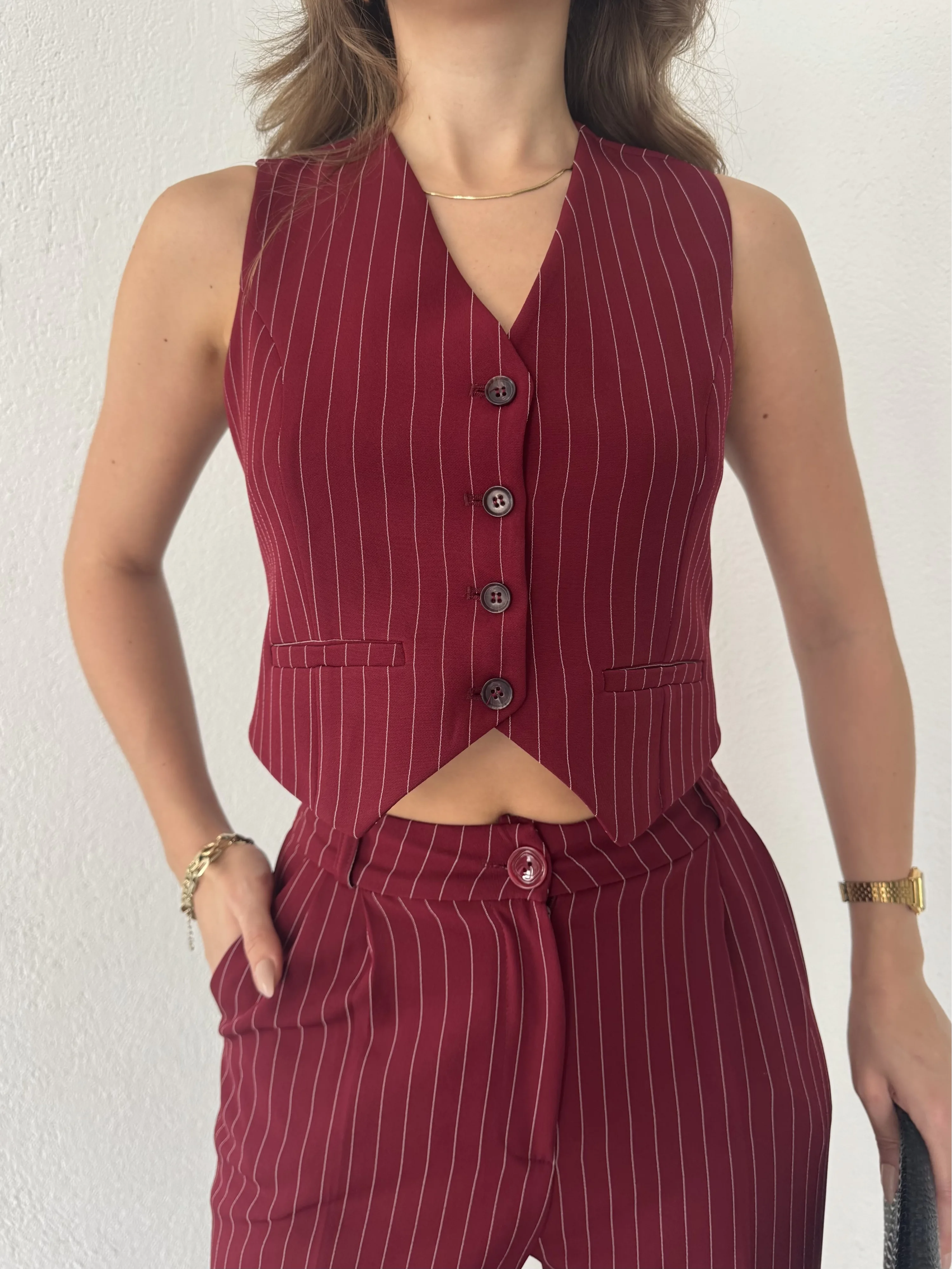 Bordo Çizgili Kolsuz Düğmeli Astarlı Yelek