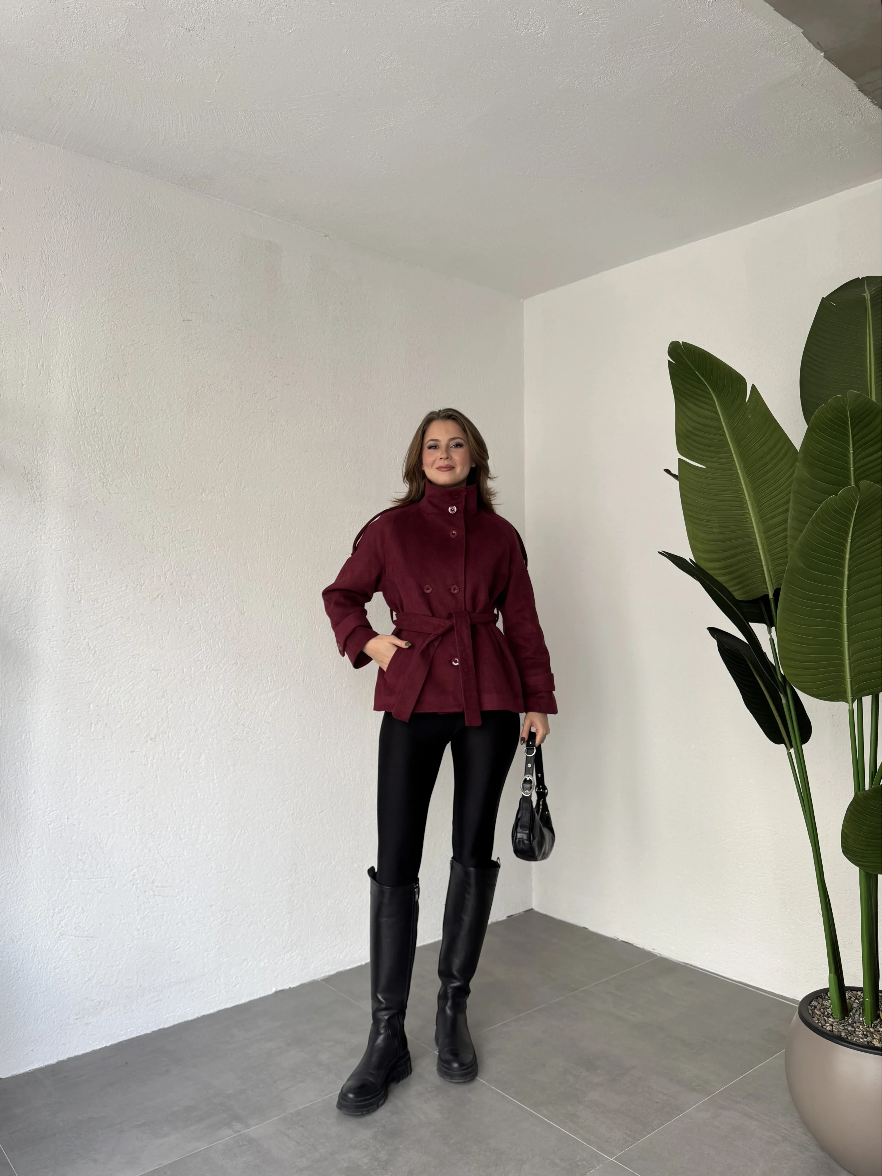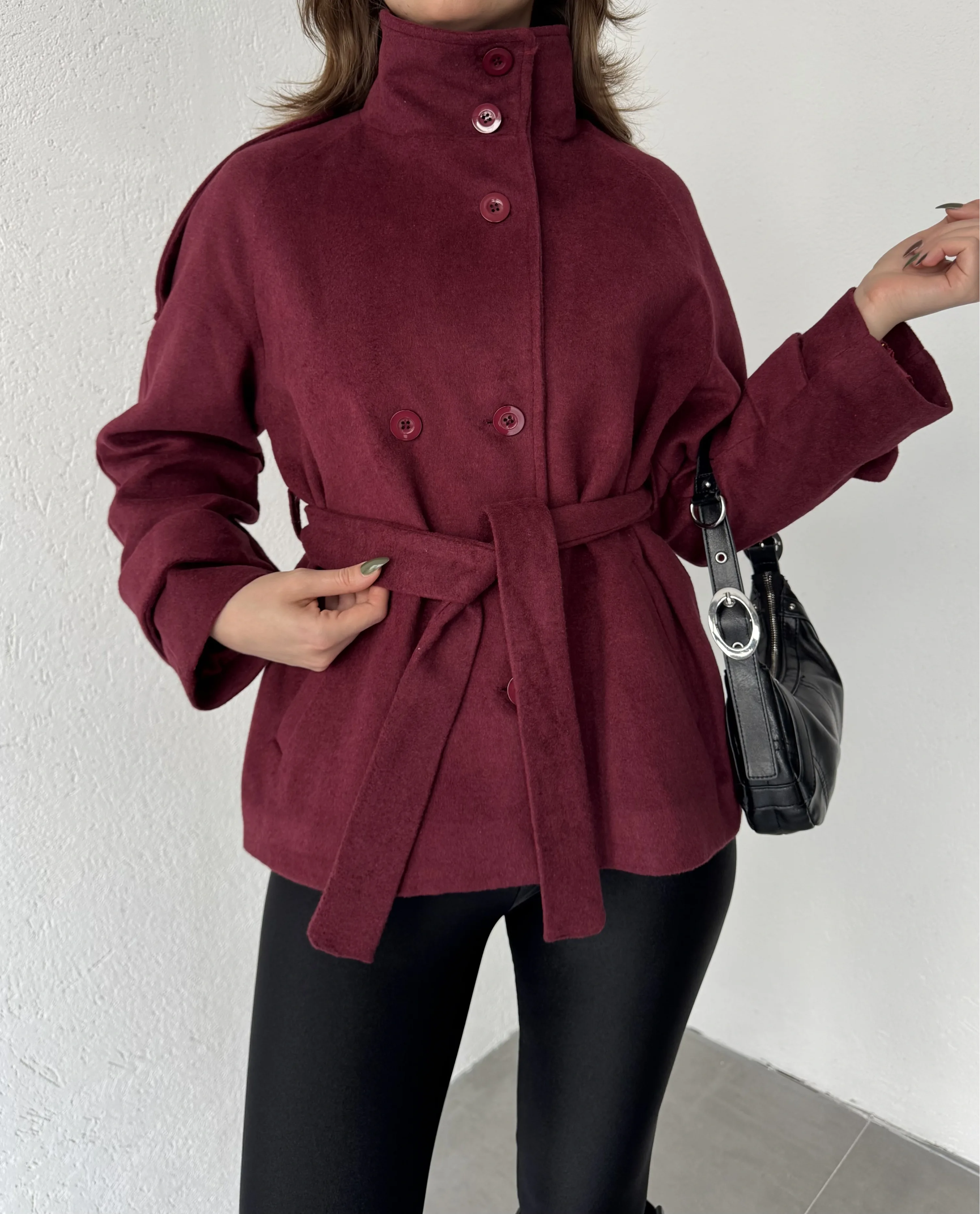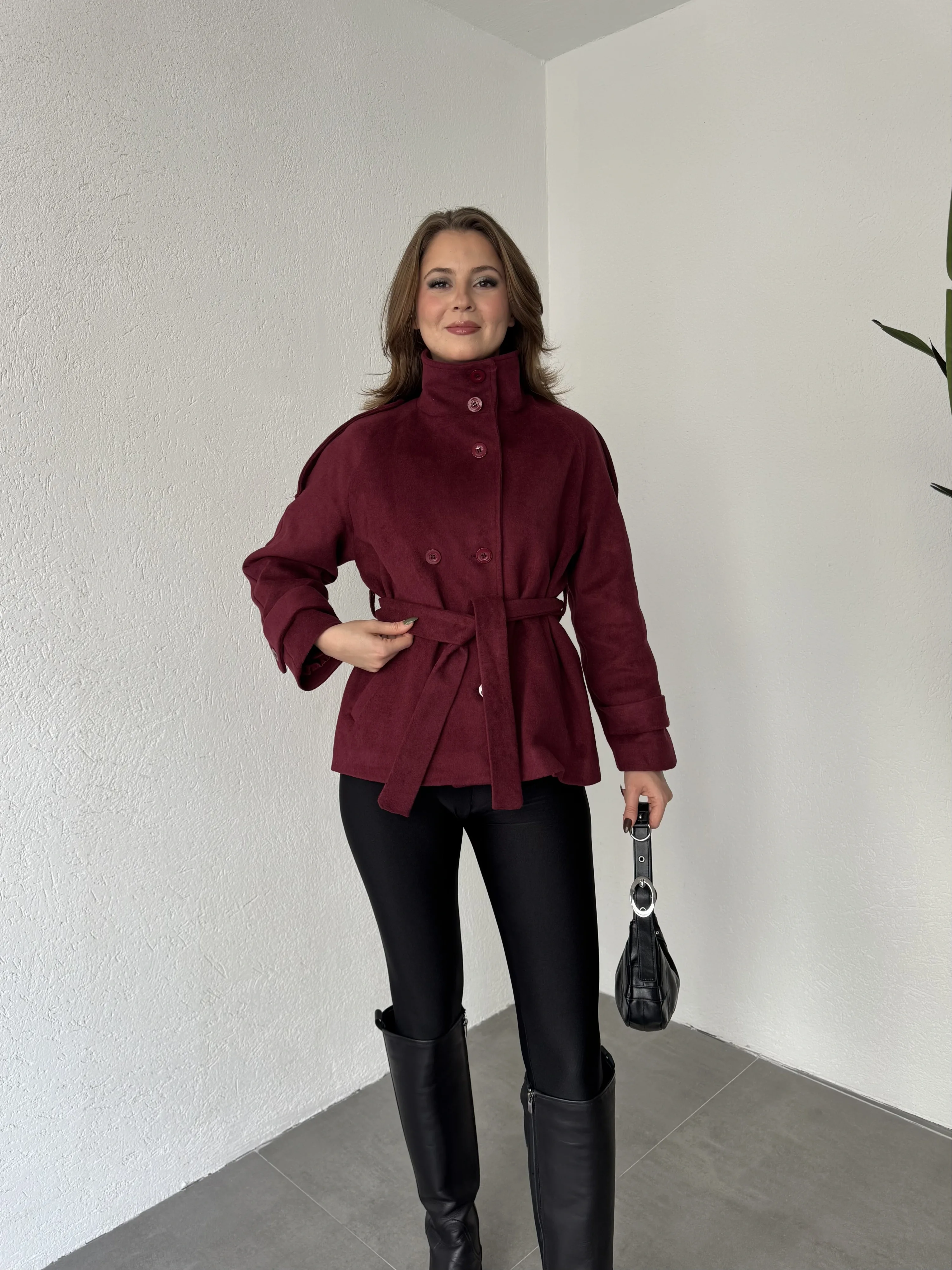 Bordo Kemerli Dik Yaka Düğmeli Kaşe Pelerin Panço