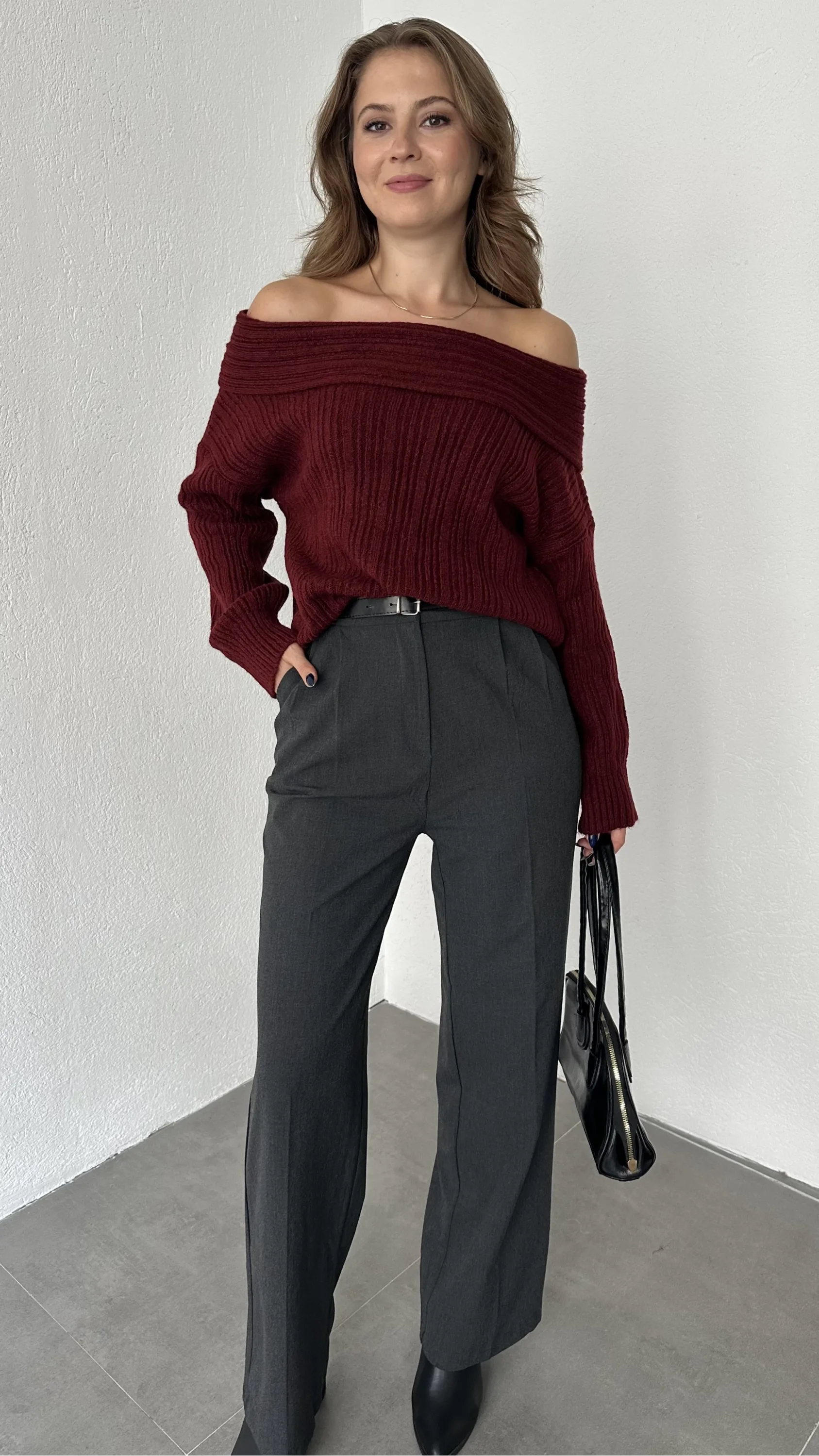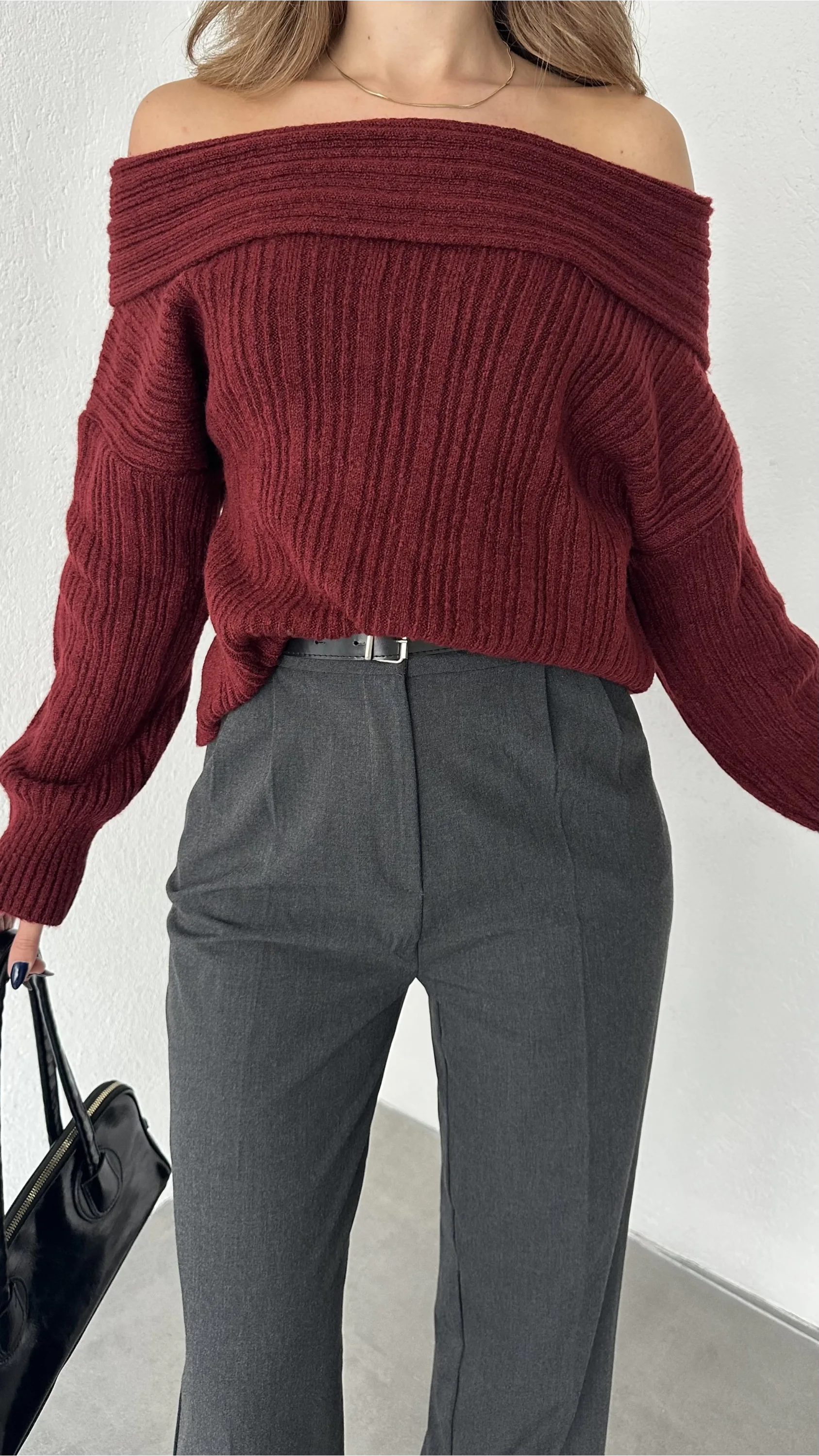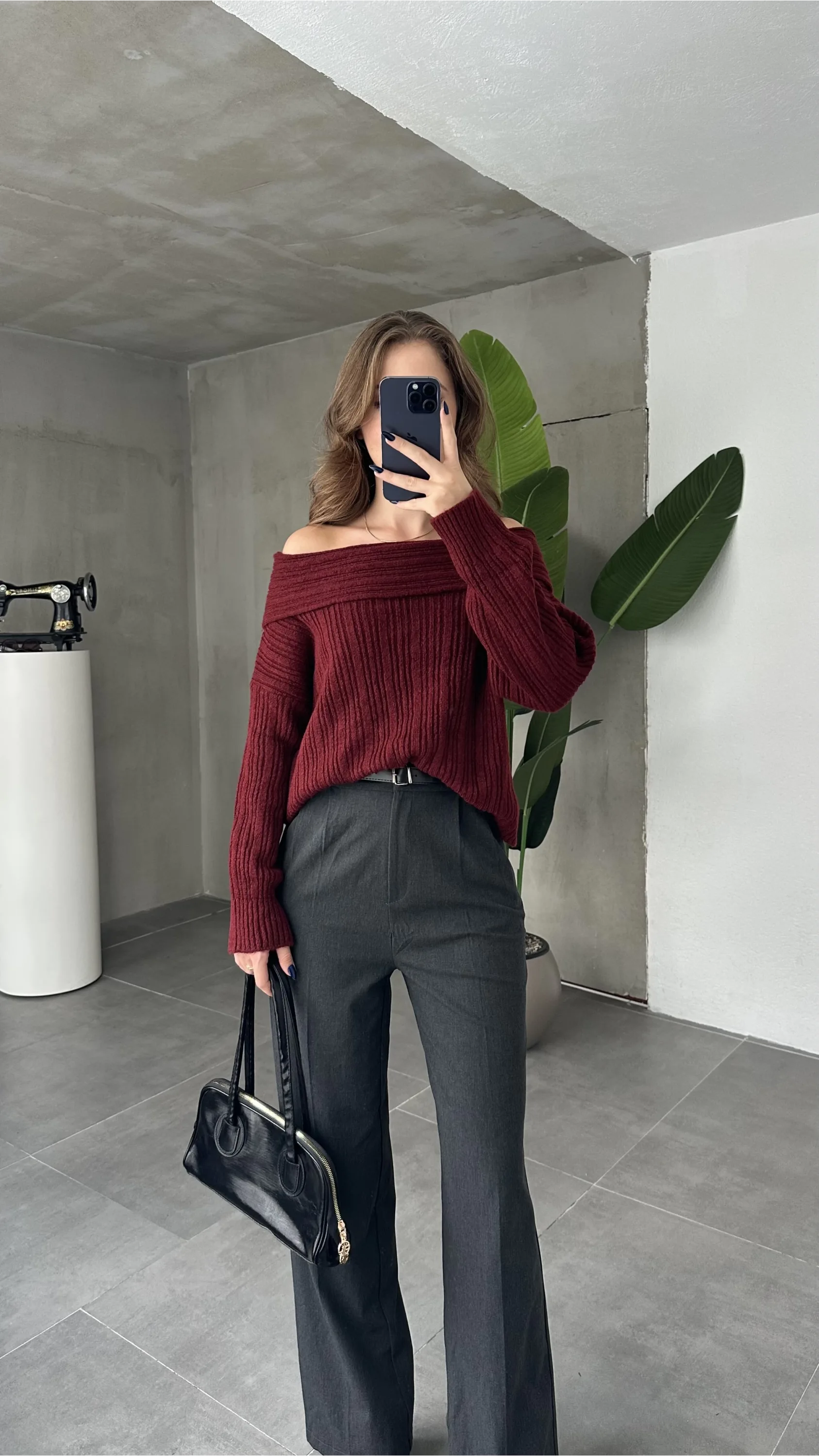 Bordo Madonna Yaka Yumoş Triko Kazak