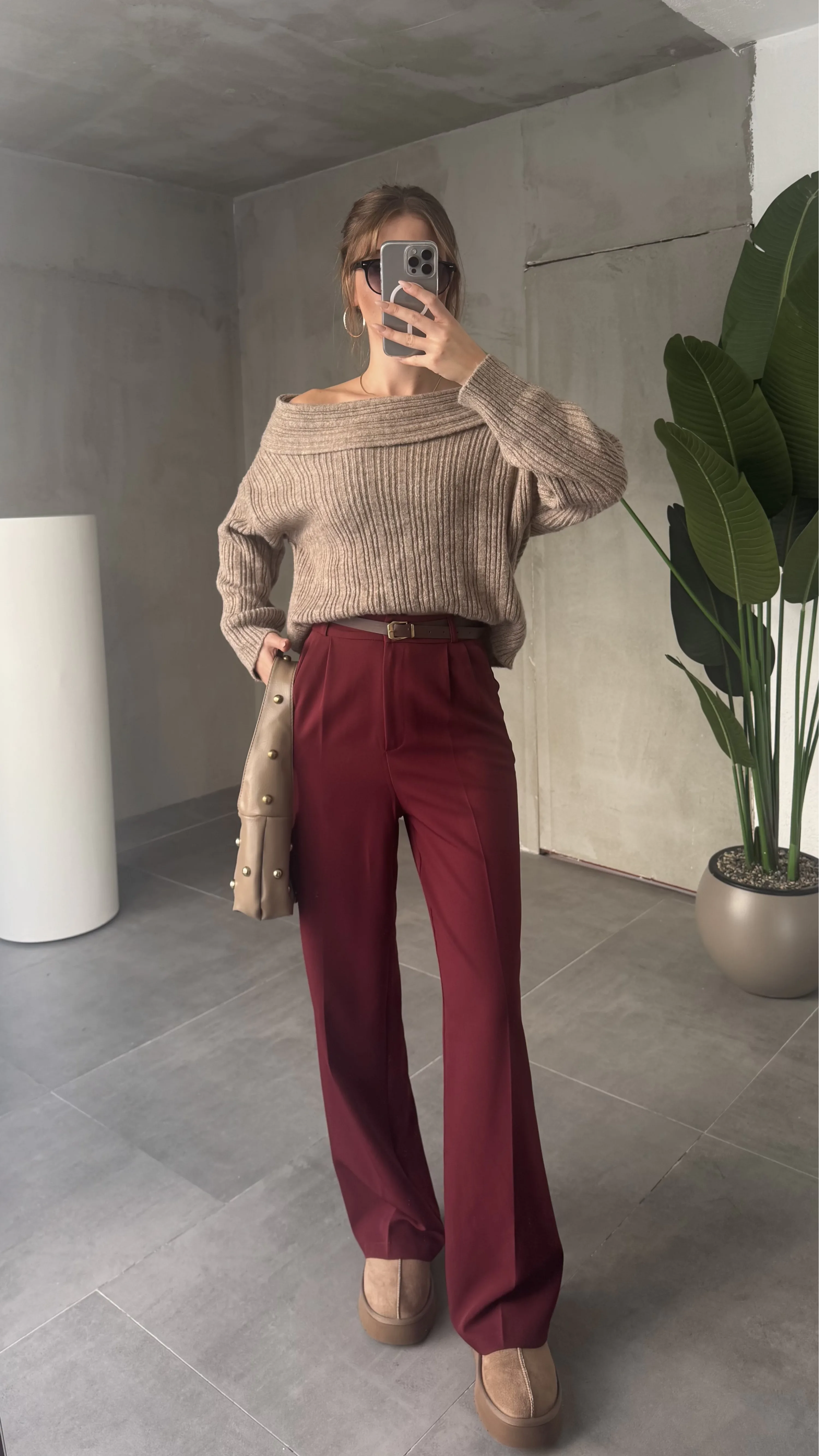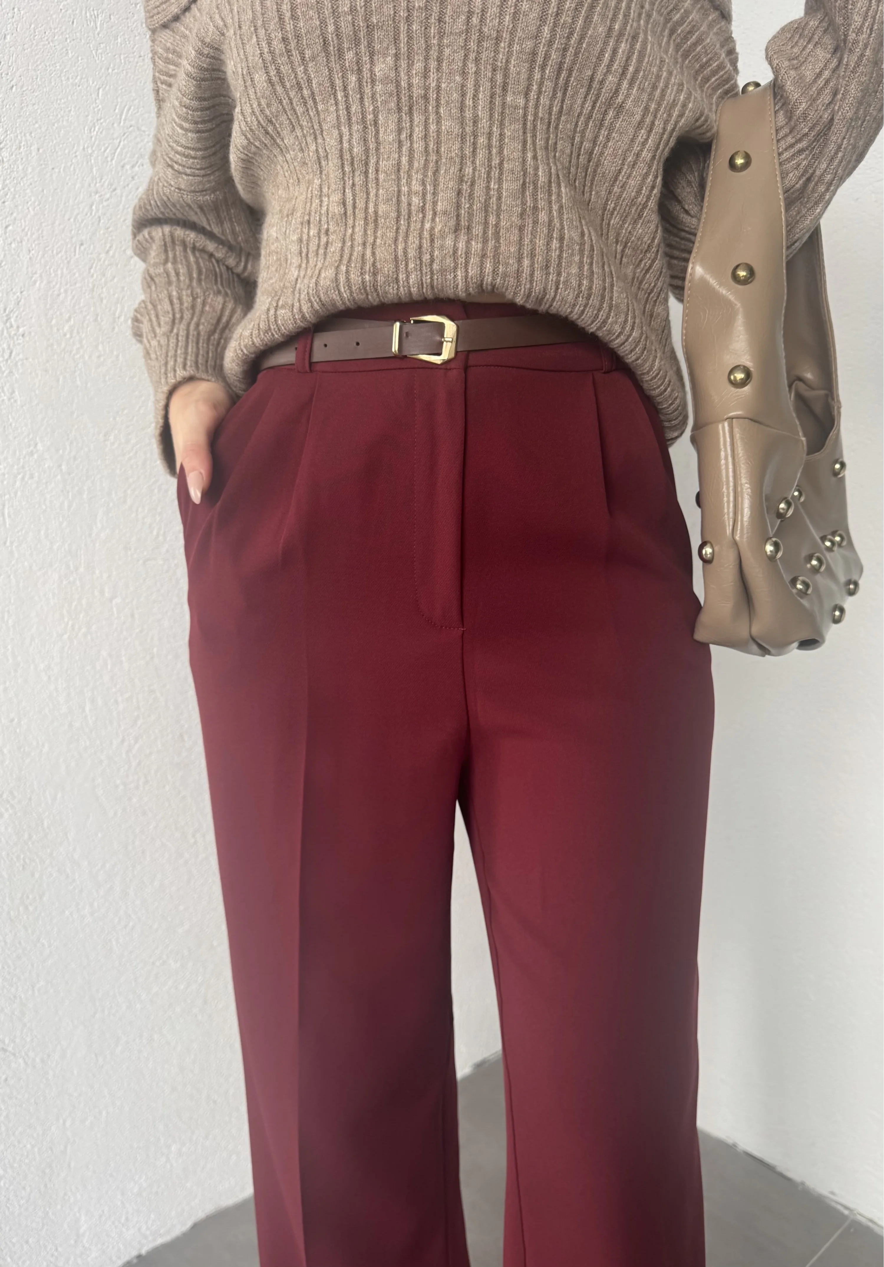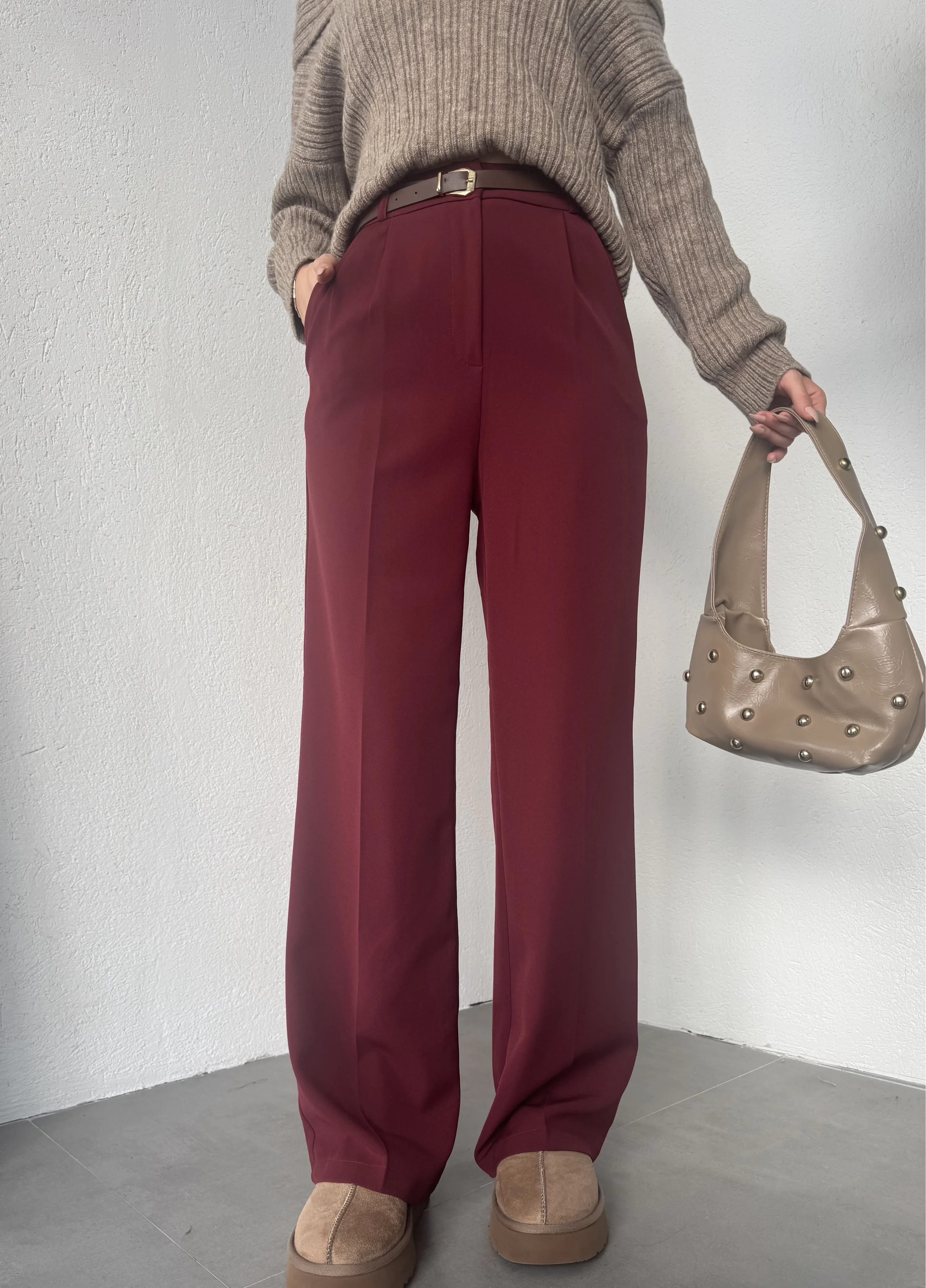 Bordo Pileli Tam Kalıp Bel Oturtmalı Geniş Paça Palazzo Pantolon
