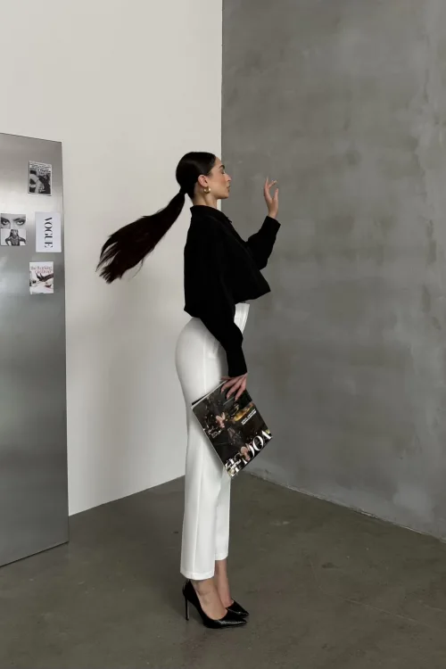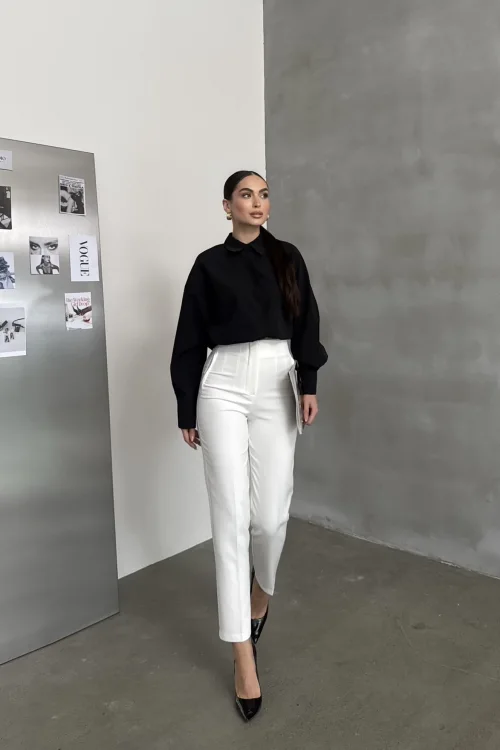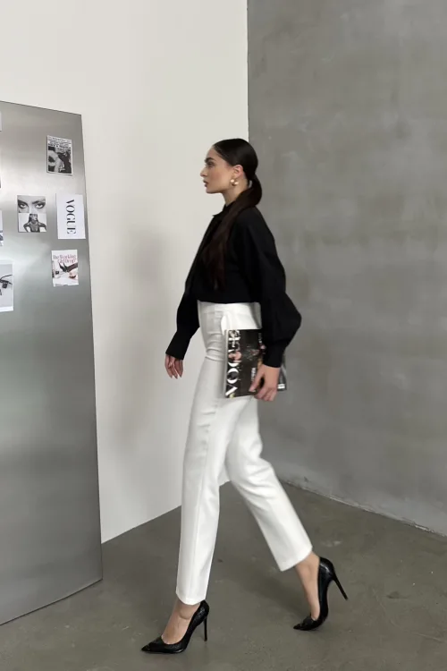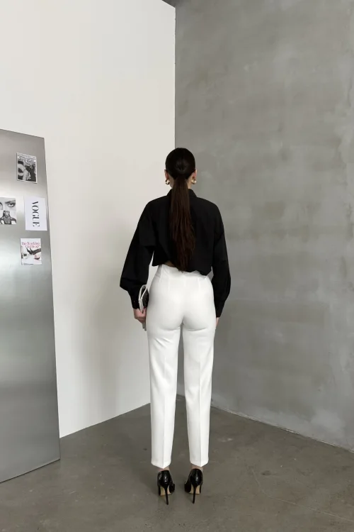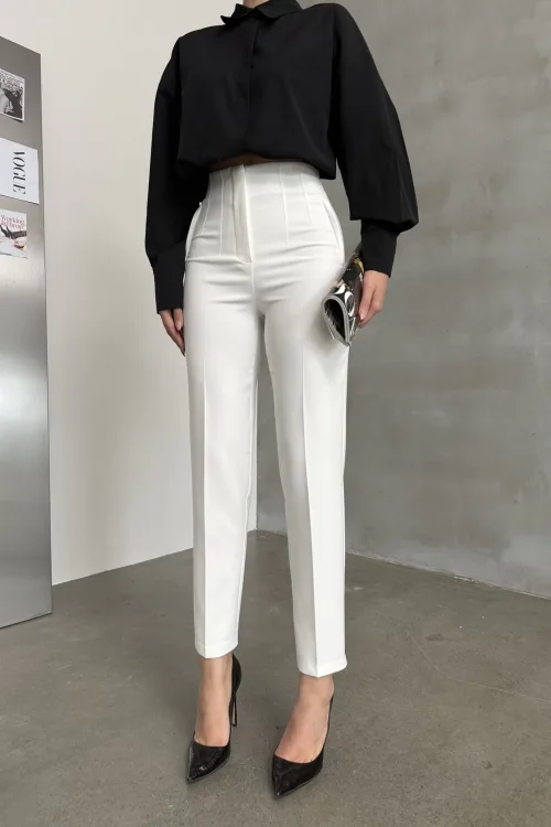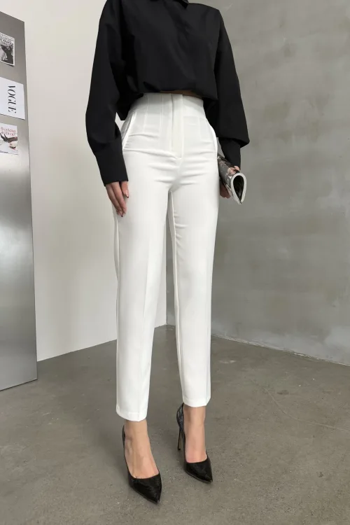 Beyaz ZR Model Piliseli Bel Oturtmalı Düğmesiz Pantolon