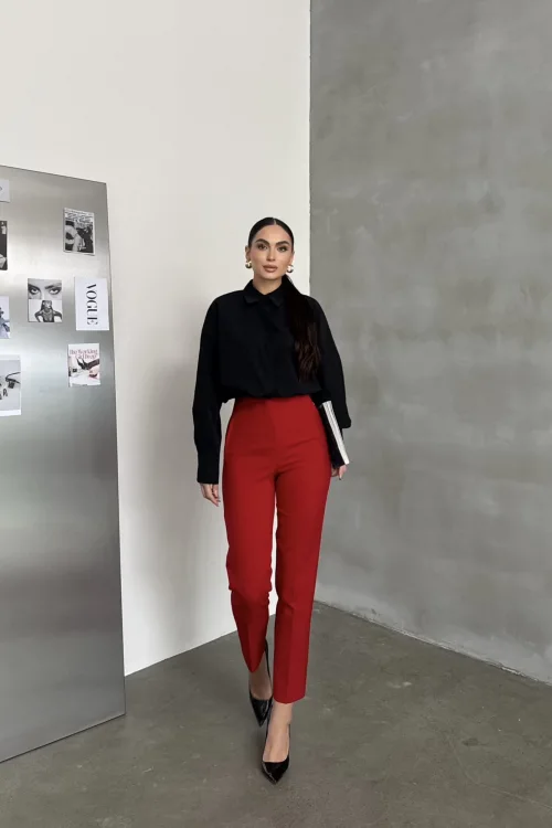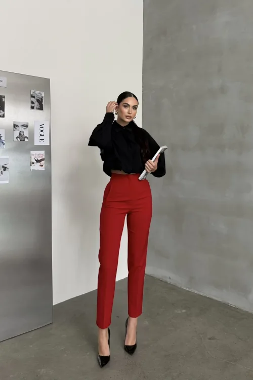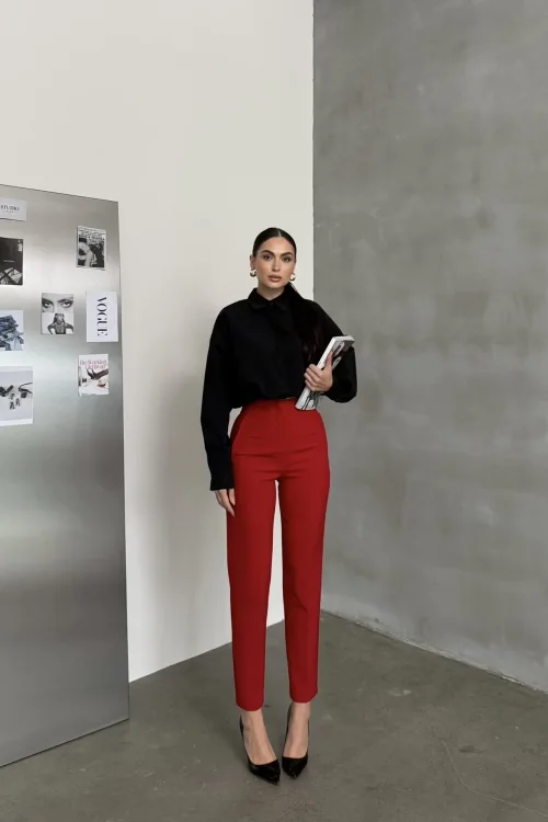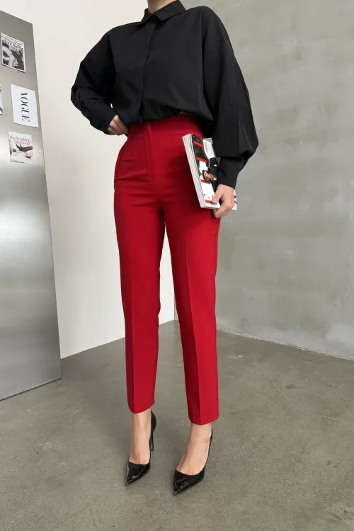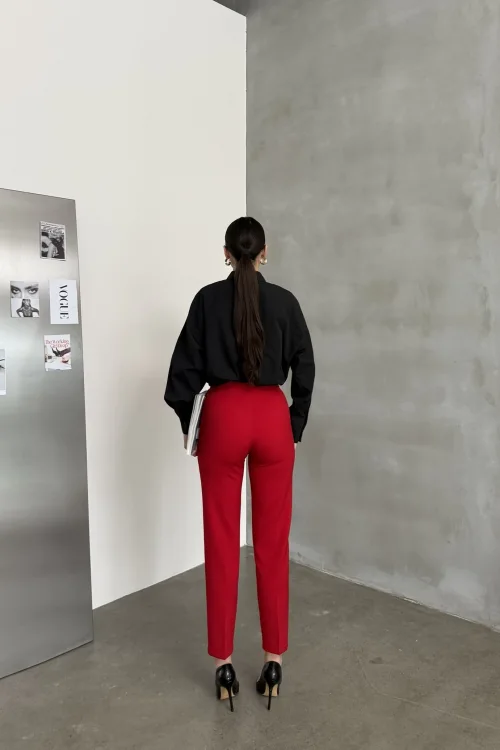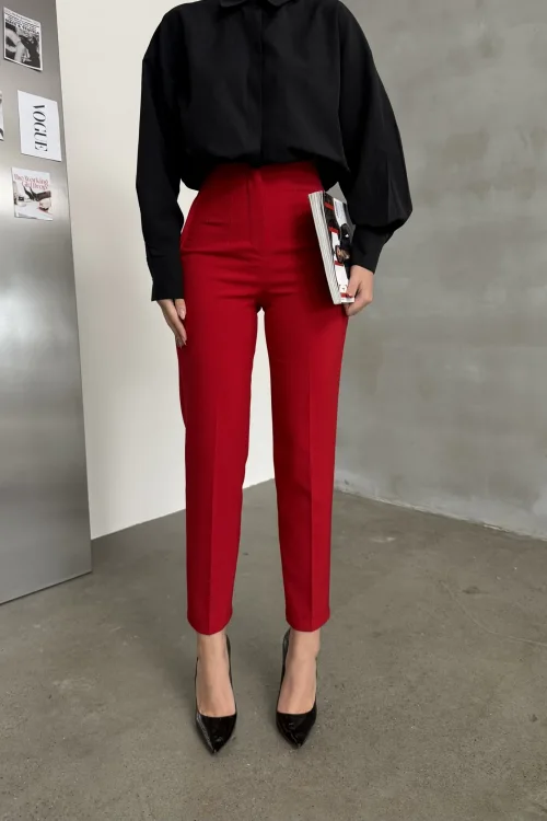 Kırmızı ZR Model Piliseli Bel Oturtmalı Düğmesiz Pantolon
