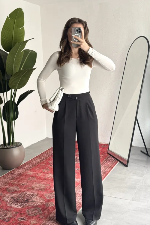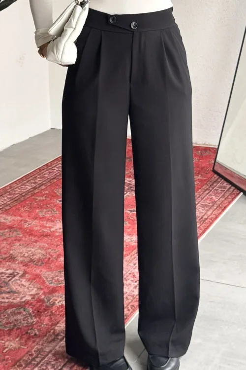 Kadın Siyah Yüksek Bel Pileli Bol Paça Beli Lastikli Kore Model Kumaş Pantolon