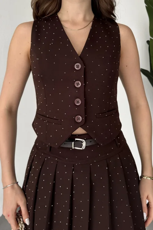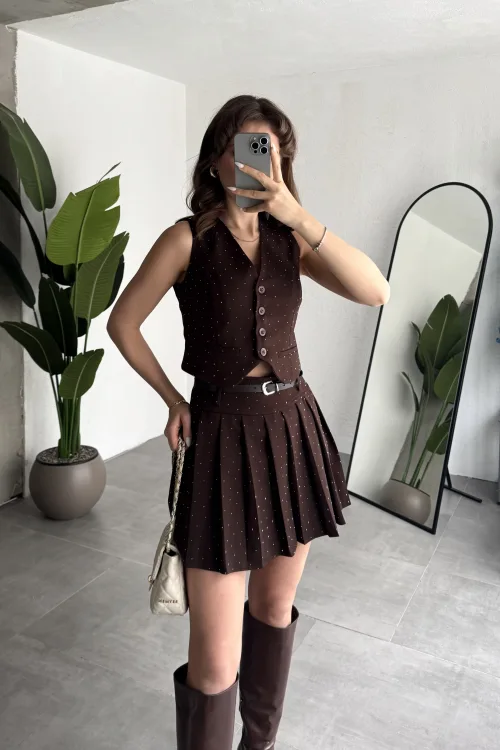 Kadın Kahverengi Pırıltı Taşlı Düğmeli Kolsuz Yelek Kemerli Pileli Mini Etek Takım