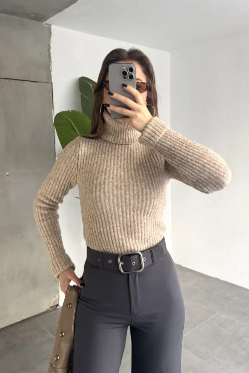 Kahverengi Burgu İşlemeli Şallı Pantolonlu Bisiklet Yaka Kazak Üçlü Triko Takım