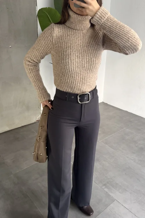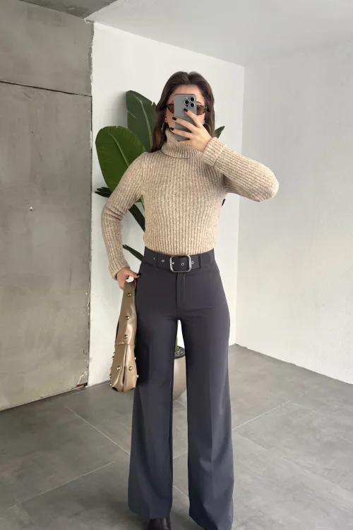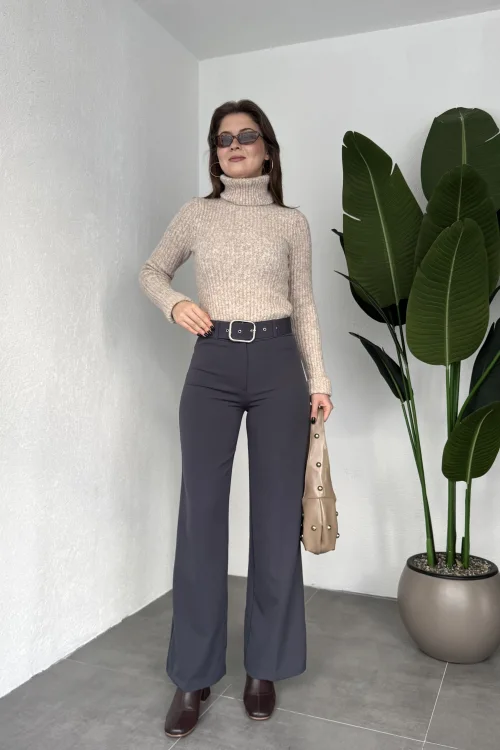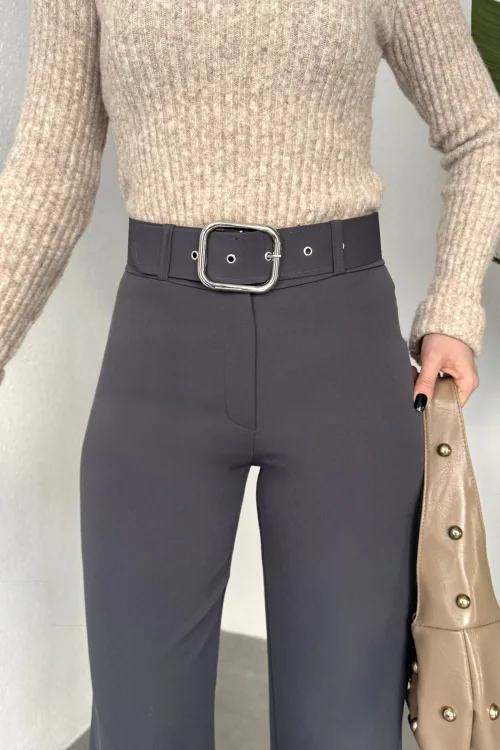 Kadın Kemerli Yüksek Bel Geniş Paça Kumaş Pantolon Antrasit