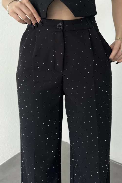 Kadın Siyah Taşlı Pırıltılı Yüksek Bel Bol Paça Pileli Palazzo Pantolon