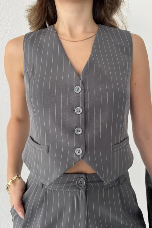 Antrasit Çizgili Kolsuz Düğmeli Astarlı Yelek